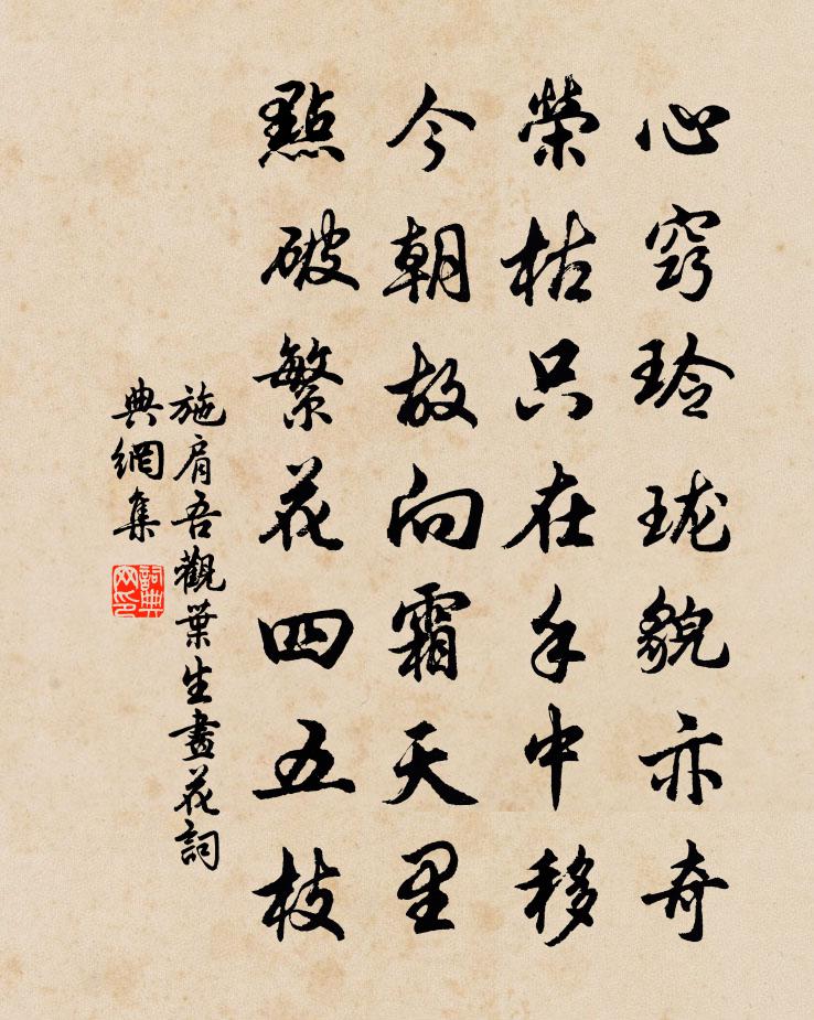 詩詞名句歷史字典書法欣賞書法字典國語詞典說文解字康熙字典古漢語字典標 題 作 者 詩 句 觀葉生畫花作者:施肩吾 朝代:唐代觀葉生畫花原文心竅玲瓏貌亦奇,榮枯只在手中移。今朝故向霜天裡,點破繁花四五枝。詩詞問答問:觀葉生畫花的作者是誰?答:施肩吾問:觀葉生畫花寫於哪個朝代?答:唐代問:觀葉生畫花是什麼體裁?答:七絕施肩吾觀葉生畫花書法欣賞觀葉生畫花書法作品注釋全唐詩:卷494-89詩詞推薦繁昌道中吳龍翰〔宋代〕江天日暖竹為輿,獵獵春風載此臞。湊入灞橋成一畫,楊花吹雪糝吟須。野荼蘼二首楊萬里〔宋代〕去歲諸司賞物華,荼蘼一會屬儂家。今年不識荼蘼面,卻買茅柴對野花。夜宿方廣聞長老守榮化去敬夫感而賦詩次韻林用中〔宋代〕上方長老已尋真,禪室空存錫杖新。自是屋樑留夜月,可憐飄泊係留身。和真州太守營屋新成之韻三首劉宰〔宋代〕長淮清晏久無虞,官舍人煙已復初。共喜輿圖方日辟,詎應卒伍尚星居。四營分創因遺址,百堵周圍列聚廬。武備九日過介之推廟李復〔宋代〕荒祠久零落,秋日故山阿。椒菊持新奠,龍蛇憶舊歌。論功嗟晉粟,流怨動汾波。千歲遺靈在,鄉民禁火多。謝章平遠惠筆黃庚〔宋代〕管城二子樣尖新,分惠山房勝饋金。淮兔拔毛夸匠巧,魯魚正字見功深。抄書未得纖毫力,握管難忘一寸心。揮翰賀新郎黃人傑〔宋代〕逗曉晴煙斂。過書雲、祥開五日,漏添宮線。葭莞飛灰微度暖,著梅梢尚淺。怪深院、笙簫如剪。非霧非煙浮月頌古四十五首釋如珙〔宋代〕你若學他看,牛皮真箇穿。長年橫案上,字義自然圓。蜂兒榧何坦〔宋代〕銀甲彈開香粉墜,金盤堆起乳花圓。乞君東閣長生供,壽我北堂難老仙。定風波令(再次韻送子瞻·般涉調)張先〔宋代〕談辨才疏堂上兵。畫船齊岸暗潮平。萬乘靴袍曾好問。須信。文章傳口齒牙清。三百寺應游未遍。□算。湖山風物游大滌棲真洞楊棟〔宋代〕山峨來夾案,泉急自穿渠。密記東陽訣,高題上帝居。牙兒藏寶篋,山子走籃輿。曲折璣衡轉,溪坳可結廬。依韻和襄陽王源叔龍圖見寄范仲淹〔宋代〕高車赴南峴,敝郊主東道。風采喜一見,布素情相好。屈指四十秋,於今歲寒保。我起為君壽,善頌復善禱。願盡太極觀奉冊實一首真宗〔宋代〕薦號穹冥,登名祖爾。陟配陽郊,協宣典禮。感電靈區,誕聖鴻懿。冊實斯陳,福祿來暨。即席分韻送李才元學士守臨邛蘇頌〔宋代〕君登石渠閣,荏苒十過春。編摩業即卒,出入命已頻。人情嘆榮滯,雅意猶逡巡。襟懷恬而曠,鬢髮黳如新。躬隨東園觀雪陳襄〔宋代〕風毛雨絮小園東,天幕低垂慘澹空。苹浦萬家雲覆瓦,花蹊千樹玉雕籠。穿林已奪春梅早,夾隴潛滋夏麥豐。湘酎戲題薛能〔唐代〕閃閃動鳴璫,初來燭影傍。擁頭珠翠重,縈步綺羅長。靜發歌如磬,連飄氣覺香。不言微有笑,多媚總無妝。坐缺送崇鏡上人歸剡因寄聲高九萬孫季蕃林表民〔宋代〕神剜天劃成岩洞,橫亘危梁接應真。垂下玉虹三百丈,雪花飛濺一山春。自贊釋法薰〔宋代〕處世昏昏,臨事草草。太近實頭,人謂古老。是非到耳,風吹石臼。只有一般,最不恰好。解騎三腳驢,來往長安虎溪三笑圖黎廷瑞〔宋代〕陰壁摻苦竹,秋池淡芙蓉。二老廬山間,風味夙昔同。亦有栗里人,心事黃花叢。囊中無一錢,眼底四海空。羲皇句劉筠〔宋代〕蟠桃三竊成何味,上盡鰲頭跡轉孤。名句推薦繡袂捧琴兮,登君子堂。貫休《善哉行·傷古曲無知音》 對酒當歌,強樂還無味。柳永《蝶戀花·佇倚危樓風細細》 千嬌面、盈盈佇立,無言有淚,斷腸爭忍回顧。柳永《採蓮令·月華收》 疏條交映,有時見日。吳均《與朱元思書》 天與火,同人;君子以類族辨物。佚名《易傳·象傳上·同人》 玉皇開碧落,銀界失黃昏。毛滂《臨江仙·都城元夕》 凡人之大體,取捨同者則相是也,取捨異者則相非也。韓非及後人《韓非子·奸劫弒臣》 當言而不言,爾之責也;言而不聽,我之咎也。宋濂、王褘《元史·列傳·卷六》 繞池閒步看魚游,正值兒童弄釣舟。白居易《觀游魚》 成人不自在,自在不成人。佚名《增廣賢文·下集》