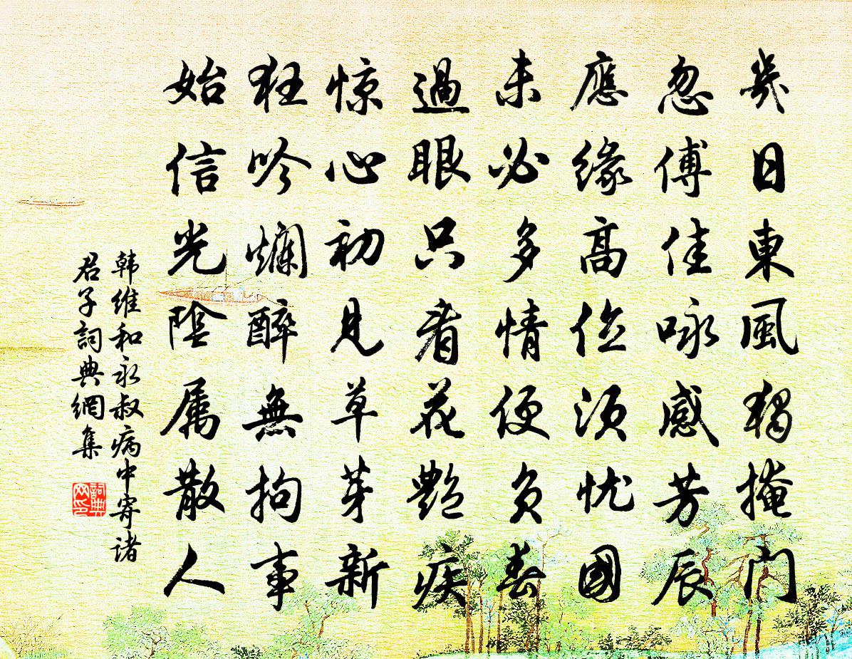 詩詞名句歷史字典書法欣賞書法字典國語詞典說文解字康熙字典古漢語字典標 題 作 者 詩 句 和永叔病中寄諸君子作者:韓維 朝代:宋代和永叔病中寄諸君子原文幾日東風獨掩門,忽傅佳詠感芳辰。應緣高位須憂國,未必多情便負春。過眼只看花艷疾,驚心初見草芽新。狂吟爛醉無拘事,始信光陰屬散人。詩詞問答問:和永叔病中寄諸君子的作者是誰?答:韓維問:和永叔病中寄諸君子寫於哪個朝代?答:宋代韓維和永叔病中寄諸君子書法欣賞和永叔病中寄諸君子書法作品詩詞推薦題易元吉獐猿兩圖范成大〔宋代〕烏逐山公噪,驚麕仰望疑。春林無一事,獝狘自生悲。過茂陵韓偓〔唐代〕不悲霜露但傷春,孝理何因感兆民。景帝龍髯訊息斷,異香空見李夫人。夜坐憶劉玉淵三首白玉蟾〔宋代〕冰枯雪老尚天台,使我詩腸日九回。歸去來兮須歲暮,歲雲暮矣不歸來。偈頌一百零一首釋慧性〔宋代〕毗盧師,法身主,從奪臨機些子許。目前分付與阿誰,踢起眉毛爭薦取。重陽日次荊南路經武寧驛崔櫓〔唐代〕茱萸冷吹溪口香,菊花倒繞山腳黃。家山去此強百里,弟妹待我醉重陽。風健早鴻高曉景,露清圓碧照秋光。莫看七夕池上泛舟四首張鎡〔宋代〕秋入馮夷碧殿涼,仙遊十萬不分行。錦蜺香滿煙蒙繖,翠鳳光浮露滌裳。春日五首楊時〔宋代〕雨余殘日照窗明,風弄行雲點點輕。坐對庭陰人閴寂,時聞蛛網掛蟲聲。三月旦晚晴方回〔宋代〕社雨彌三日,先之雹與雷。已疑春色盡,忽逐晚晴回。佳筍常遲出,奇出每後開。微寒勝驟暖,更莫十分催。三次劉寺韻賦張以道新居與約齋夾湖相望項安世〔宋代〕碧柳黃蘆冷映門,荒陂寒水淨涵村。深深留殿朝常閉,肅肅行營夜不喧。景似邱園宜避俗,事非風月總忘言。平生送人遊方釋普濟〔宋代〕南有天台北五台,分明記取莫疑猜。話頭打失不知處,乞我三文買草鞋。杜郵館汪遵〔唐代〕殺盡降兵熱血流,一心猶自逞戈矛。功成若解求身退,豈得將軍死杜郵。續得觀書,迎就當陽居止,正月中旬定出三峽杜甫〔唐代〕自汝到荊府,書來數喚吾。頌椒添諷詠,禁火卜歡娛。舟楫因人動,形骸用杖扶。天旋夔子國,春近岳陽湖。發日留別南湖二首項安世〔宋代〕老天夢識南湖路,水檻山堂處處通。若有新篇無告訴,不妨題寫寄江東。欽慈皇后輓詞二首陳師道〔宋代〕二祧從孝祀,五典載虞嬪。顯號追先志,陰功見後人。承顏親不待,罔極痛如新。未有如椽筆,光容可得陳。句孫升〔宋代〕玉徇千官散,珠簾一夜空。依韻朱學士廉叔憶穎川西湖春色寄獻尚書晏公梅堯臣〔宋代〕物景有先後,春工無舊新。追歡成杳靄,寄詠苦逡巡。湖水與濠接,岸亭將寺鄰。艷花簪舞髻,弱藻罥垂緡。客奏望長安賀鑄〔宋代〕排辦張燈春事早。十二都門。物色宜新曉。金犢車輕玉驄小。拂頭楊柳穿馳道。蓴羹鱸鱠非吾好。去國謳吟,半落草蟲扇范成大〔宋代〕莫嫌絡緯股鳴悲,解向寒窗促曉機。海眼多花無藉在,顛狂只待學于飛。東陽方韶卿惠古意七篇久不得和五月二十六日戴表元〔宋代〕舊文空中雲,零落跡易消,新交江上流,來去同奔潮。藹藹玄英孫,望之十舍遙。少監三首貫休〔唐代〕器琢仙珪美有餘,席珍國寶比難如。銜花乳燕看調瑟,衣錦佳人侍讀書。荀氏門風龍變化,謝家庭樹玉扶疏。即期名句推薦彈淚別東風,把酒澆飛絮:化了浮萍也是愁,莫向天涯去!蔣春霖《卜運算元·燕子不曾來》 富而不驕,貴而不舒。司馬遷《史記·五帝本紀》 蕃漢斷訊息,死生長別離。張籍《沒蕃故人》 丈夫為志,窮當益堅,老當益壯。范曄《後漢書·列傳·馬援列傳》 深村時節好,應為去年豐。范成大《寒食郊行書事》 愛人利人者,天必福之;惡人賊人者,天必禍之。墨子《墨子·04章 法儀》 竹外一枝斜,想佳人,天寒日暮。曹組《驀山溪·梅》 獸爐沉水煙,翠沼殘花片。一行寫入相思傳。張可久《塞鴻秋·春情》 野鴉無意緒,鳴噪自紛紛。杜甫《孤雁 / 後飛雁》 萬里赴戎機,關山度若飛佚名《木蘭詩/木蘭辭》