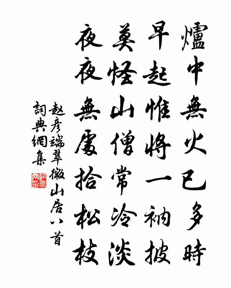 詩詞名句歷史字典書法欣賞書法字典國語詞典說文解字康熙字典古漢語字典標 題 作 者 詩 句 翠微山居八首作者:趙彥端 朝代:宋代翠微山居八首原文爐中無火已多時,早起惟將一衲披。莫怪山僧常冷淡,夜夜無處拾松枝。詩詞問答問:翠微山居八首的作者是誰?答:趙彥端問:翠微山居八首寫於哪個朝代?答:宋代趙彥端翠微山居八首書法欣賞翠微山居八首書法作品詩詞推薦虎丘六絕句劍池范成大〔宋代〕石罅泓渟劍氣潛,誰將樓閣苦莊嚴。只知暖熱遊人眼,不道蒼藤翠木嫌。臨途屆郫值雨程公許〔宋代〕仙人念我世緣輕,貸與山行幾日晴。袖有碧岑三十六,不妨風雨過鵑城。寧宗郊祀二十九首學士院〔宋代〕帝臨中壇,神從八陛。華玉展瑞,明聲計醒。亦有嘉德,克相盛禮。獻茲重陽,降福瀰瀰。夜緒宋祁〔宋代〕炎氛歇層宇,清氣肅重帷。籟遠天人雜,宵閒甲乙遲。江湖牽客慮,日月與人衰。經國謀安在,悠悠空我思。金剛隨機無盡頌善現起請分第二釋印肅〔宋代〕菩提無相貌,凡夫多變豹。不落墮野狐,不昧猶成罩。同鄭君瑞出瀨溪即事十首劉克莊〔宋代〕元凱平生以智推,今看往事一何痴。山頭螭首猶蕪沒,那有人觀水底碑。合歡帶(林鐘商)柳永〔宋代〕身材兒、早是妖嬈。算風措、實難描。一個肌膚渾似玉,更都來、占了千嬌。妍歌 * ,鶯慚巧舌,柳妒纖腰。自和房日嚴換武詩張耒〔宋代〕青衫厭著待封侯,慷慨知君定遠流。莫嘆書生長齷齪,元戎曾與報更籌。春月勸農至華林寺周震〔宋代〕飛廉怒息海天明,十里籃輿出勸耕。隴麥低頭須雨意,林花仰面笑春晴。熙寮連轡勤因事,父老傳杯識至情。及物弄龜、羅白居易〔唐代〕有侄始六歲,字之為阿龜。有女生三年,其名曰羅兒。一始學笑語,一能誦歌詩。朝戲抱我足,夜眠枕我衣。汝生和子由記園中草木十一首蘇軾〔宋代〕荒園無數畝,草木動成林。春陽一以敷,妍醜各自矜。蒲萄雖滿架,囷倒不能任。可憐病石榴,花如破紅襟。葵花小桃源詹復〔宋代〕遠尋瑤草到仙家,衝破雲間一片霞。道士不知興廢事,又來溪上種桃花。和邑大夫勸駕韻劉宰〔宋代〕自笑當年躣冶金,老來文物見彬彬。登名已喜多三邑,擢秀縣知敵萬人。晴日琴堂開宴好,春風瓊苑拜恩新。惟餘紅梅蘇泂〔宋代〕等觀非白亦非紅,開落那知色自空。落葉成陰花又子,幾將心事托東風。上巳酒邊即事示女沖二首陳著〔宋代〕女沖踏露折棠花,引得兒童哄一家。說道今朝修禊日,暫拋針線答年華。金陵二首晁說之〔宋代〕金陵形勢眼中見,一吊興亡夢寐間。侯景長驅走龍虎,王敦內叛壓江山。中原有主申明命,下國何人敢肆奸。白首憶伯氏三首胡宏〔宋代〕又見雁南飛,行人幾風歸。朔風吹病體,獨對雪霏霏。贈沈莊可張弋〔宋代〕卷上芳名舊所知,見君還恨識君遲。數莖短髮沾霜白,一葉扁舟觸浪危。問遍菊名因作譜,畫將蘭本要求詩。向南清風閣陳允平〔宋代〕巍巍楹檻逼星河,城上闌乾野色多。天目水分波浩渺,大湖山點石嵯峨。羅窗夜氣吹銀燭,翠箔秋聲動玉珂。我欲結客少年場鄒登龍〔宋代〕並兒任氣俠,年少肝膽雄。錦臂金彈丸,銀鞍玉花驄。腰插三尺劍,手開二石弓。輕生重大義,一戰朔庭空。斬取名句推薦戰陣之間,不厭詐偽。韓非及後人《韓非子·難一》 雷填填兮雨冥冥,猿啾啾兮狖夜鳴;屈原《九歌》 嵩雲秦樹久離居,雙鯉迢迢一紙書。李商隱《寄令狐郎中》 朝為越溪女,暮作吳宮妃。王維《西施詠》 何當共剪西窗燭,卻話巴山夜雨時。李商隱《夜雨寄北》 鵲辭穿線月,花入曝衣樓。李賀《七夕》 亂山殘雪夜,孤燭異鄉人。崔塗《除夜 / 巴山道中除夜書懷 / 除夜有懷》 刷羽同搖漾,一舉還故鄉。沈約《詠湖中雁》 紫泉宮殿鎖煙霞,欲取蕪城作帝家。李商隱《隋宮》 筆落驚風雨,書成泣鬼神。馮夢龍《醒世恆言·卷二十一》