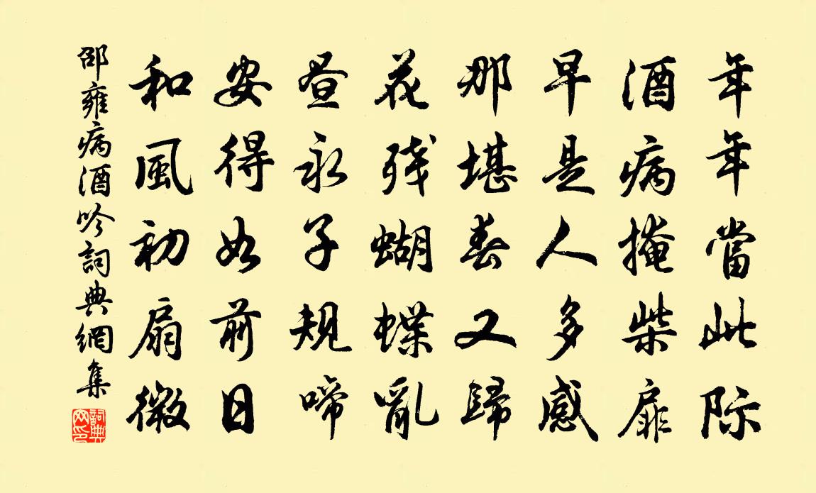 詩詞名句歷史字典書法欣賞書法字典國語詞典說文解字康熙字典古漢語字典標 題 作 者 詩 句 病酒吟作者:邵雍 朝代:宋代病酒吟原文年年當此際,酒病掩柴扉。早是人多感,那堪春又歸。花殘蝴蝶亂,晝永子規啼。安得如前日,和風初扇微。詩詞問答問:病酒吟的作者是誰?答:邵雍問:病酒吟寫於哪個朝代?答:宋代邵雍病酒吟書法欣賞病酒吟書法作品詩詞推薦菩薩蠻(訪江東外家作)程垓〔宋代〕畫橋拍拍春江綠。行人正在春江曲。花潤接平川。有人花底眠。東風元自好。只怕催花老。安得萬垂楊。系教春日頌證道歌證道歌釋印肅〔宋代〕不是標形虛事持,釋迦老子要人知。拈來放去非他物,運水搬柴事事宜。沈德和使君生辰四首陳棣〔宋代〕麟閣書仙蓬萊,書蘭省星躔書次。瞻之已足榮,到者亦未易。惟公名德尊,飛聲從早歲。青錢中妙選,豈止一科第王霸壇周朴〔唐代〕王君上升處,信首古居前。皂樹即須朽,白龜應亦全。雲間猶一日,塵里已千年。碧色壇如黛,時人誰可仙。舟中陸游〔宋代〕蕭蕭風雨小江秋,不是愁人亦合愁。忽聽疏鍾知寺近,笑尋沙路上牛頭。朝中措(重葺南湖堂館,小詞落成)張鎡〔宋代〕先生心地等空虛。行處幻仙都。點綴玲瓏花柳,翻騰窈窕規模。三杯兩盞,五言十字,遲老工夫。受用南湖風月,贈尹巽齋易數何夢桂〔宋代〕萬有滋荄隱混蒙,誰開玄竅洩神工。易經四聖羲周孔,數貫三天先後中。執筴不須談管輅,太玄休復問揚雄。只今相公竹王陶〔宋代〕已枯斷竹鈞私被,既沒賢公帝念深。仆木偃禾如不起,至今誰識大忠心。頌古一百則釋正覺〔宋代〕見有不有,翻手覆手。瑯琊山里人,不落瞿曇後。與歌童田順郎劉禹錫〔唐代〕天下能歌御史娘,花前葉底奉君王。九重深處無人見,分付新聲與順郎。高山堂和節度使梁公韻史安之〔宋代〕閣憑嵬構敞桿扃,一望塵凡目暫醒。岩嶂遠供千疊翠,松篁還聳四時青。登臨雅愛恣吟筆,圖畫尤宜作座屏。我欲玩易齋廖行之〔宋代〕作者亦何患,思深義亦深。忘言更忘象,默會古人心。丁酉正月二日東郊故事范成大〔宋代〕椒盤宿酒未全醒,擾擾金鞍逐畫軿。麥雨一犁隨處綠,柳煙千縷幾時青?客愁舊歲連新歲,歸路長亭間短亭。萬里冬日游甘露寺蔡肇〔宋代〕漕河膠舟水流咽,水關著鍵行者歇。大江伏槎臥長劍,萬頃濕銀寒不結。蓬萊諸仙亦避寒,海門冥冥凍欲坼。朔風水龍吟(木樨)楊 * 〔宋代〕膩金勻點繁英,好風更與花為地。梅魂蕙魄,素馨□長,酴醿請避。拍塞清香,遠聞十里,如何藏閉。笑東籬嫩菊寄惠州弟文天祥〔宋代〕五十年兄弟,一朝生別離。雁行長已矣,馬足遠何之。葬骨知無地,論心更有誰。親喪君自盡,猶子是吾兒。中秋次韻林季仲〔宋代〕一葉下庭木,初敲窗戶秋。陰雲偏妬月,衰病懶登樓。勳業頭先白,江河淚未收。停橈是吾土,休夢野堂游。夜飲方湖劉克莊〔宋代〕貪聽月下小叢歌,擲去金蕉吸碧荷。四面涼如浮震澤,五更渴欲挽斜河。古稱賢達誰存者,今不懽娛柰老何。長笑風雨望武昌岸項安世〔宋代〕寒食今朝是,顛風半夜來。自從天色暖,已遣客心猜。雨打洲容沐,煙籠水面灰。孫郎將漫叟,相送到浯台。題順濟廟黃公度〔宋代〕枯木肇靈滄海東,參差宮殿崒晴空。平生不厭混巫媼,已死猶能效國功。萬戶牲醪無水旱,四時歌舞走兒童。傳聞名句推薦落花人獨立,微雨燕雙飛。晏幾道《臨江仙·夢後樓台高鎖》 財物輕,怨何生。言語忍,忿自泯。李毓秀《弟子規·出則弟》 之子歸窮泉,重壤永幽隔。潘安《悼亡詩三首》 下謀上以術,術有窮者以力。來俊臣《羅織經·謀劃卷第九》 啜苦咽甘,茶也。陸羽《茶經·五之煮》 但怪得、當年夢緣能短。吳文英《三姝媚·過都城舊居有感》 不信樓頭楊柳月,玉人歌舞未曾歸。謝枋得《蠶婦吟》 賞當其勞,無功者自退;罰當其罪,為惡者戒懼。吳兢《貞觀政要·卷三·論擇官》 金風細細。葉葉梧桐墜。晏殊《清平樂·金風細細》 晴浦晚風寒,青山玉骨瘦。董以寧《卜運算元·雪江晴月(回文,倒讀《巫山一段雲》