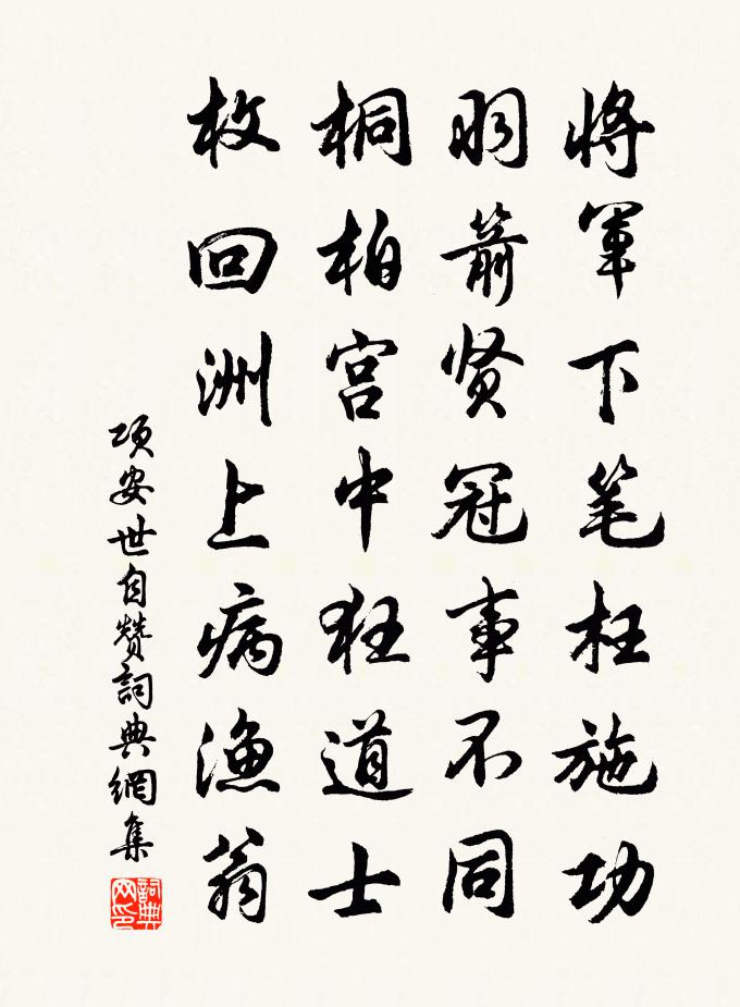 詩詞名句歷史字典書法欣賞書法字典國語詞典說文解字康熙字典古漢語字典標 題 作 者 詩 句 自贊作者:項安世 朝代:宋代自贊原文將軍下筆枉施功,羽箭賢冠事不同。桐柏宮中狂道士,枚回洲上病漁翁。詩詞問答問:自贊的作者是誰?答:項安世問:自贊寫於哪個朝代?答:宋代項安世自贊書法欣賞自贊書法作品詩詞推薦將發李賀〔唐代〕東床卷席罷,濩落將行去。秋白遙遙空,日滿門前路。送趙成都五首趙蕃〔宋代〕不但元戎貴,仍兼制使雄。深沉天與度,簡敬學成功。人士薰陶內,兵民教訓中。詎應先郤縠,寧復後文翁。春晚寄微之白居易〔唐代〕三月江水闊,悠悠桃花波。年芳與心事,此地共蹉跎。南國方譴謫,中原正兵戈。眼前故人少,頭上白髮多。通州唐多令 和劉改之張之翰〔元代〕何處是滄洲。寒波不盡流。恰登舟、便過城樓。一片錦雲三萬頃,常記得、藕花秋。漁父雪蒙頭。此情知道否。說翛然王安石〔宋代〕翛然三月閉柴荊,綠葉陰陰忽滿城。自是老年遊興少,春風何處不堪。壽悅齋李先生程公許〔宋代〕君不見溫公崇福十五年,上下千載琴法岩。又不見蜀公靜退不待耄,鐘律製成天一笑。樂則行之憂則遠,出處無非任蠻奴鄧林〔宋代〕千里旌旗已渡江,蠻奴苦諫喚蕭郎。卻持官里黃金去,望拜韓擒石子岡。哭王幾道職方三首梅堯臣〔宋代〕我今過五十,萬事日消磨。熟識世間寡,故交泉下多。葉秋知易隕,松耐竟如何。嘗亦悲前哲,荒墳野鼠窠。江神子/江城子李曾伯〔宋代〕白妃卷絮逐風顛。透朱簾。向空漫。剪出冰花,偏愛臘前看。能費化工多少力,千萬里,盡同天。歌樓清賞記當年風入松 三月三西郊即事張可久〔元代〕啁喳嬌燕語茅茨。紅暗海棠枝。雙丫小髻誰家女,踏青歸、三月三時。淡淡鬱金衫子,盈盈玉藥釵兒。避人忙掩女小重山祖可〔宋代〕誰向江頭遣恨濃。碧波流不斷,楚山重。柳煙和雨隔疏鍾。黃昏後,羅幕更朦朧。桃李小園空。阿誰猶笑語,拾殘胡料院出示車攻圖仍索俚作樂雷發〔宋代〕九壤臥龍呼不起,乳臭談兵空滿耳。書生未識玉帳經,且抱此圖究終始。姬家出車詠,嬴家小戎詩。衛家武剛扞突春貼子皇后閣五首真德秀〔宋代〕贊東皇轉化軍鈞,宮中堯舜亦深仁。祗將一點陽和意,散作乾坤浩蕩春。道中晃沖之〔宋代〕雨子收還急,溪流直又斜。迢迢旁山路,漠漠滿林花。破水雙鷗影,掀泥百草芽。川原有高下,隨處著人家。和歷陽守張仲智觀梅五首王之道〔宋代〕夜燒紅燭照梅花,刺史風流自一家。待得殘英上丹臉,韶華端復到山茶。送李侍御入茅山採藥張南史〔唐代〕苦縣家風在,茅山道錄傳。聊聽驄馬使,卻就紫陽仙。江海生岐路,雲霞入洞天。莫令千歲鶴,飛到草堂前。江亭別故人張耒〔宋代〕津亭把酒燕西東,無復余花一點紅。農事一春荒積雨,長淮千里駕東風。休談世事循環外,且寄騷愁醉眼中。船鼓雪山釋心月〔宋代〕晝漫漫地夜漫漫,高下峰巒總一般。身在洞然明白里,勿於明白裡頭看。哭薛吏部林季仲〔宋代〕伯仲皆登第,人言薛與林。淒涼五年事,摧折兩家心。漫醉春來酒,誰同別後襟。空餘釣磯在,落日見孤岑。虞美人(宿龜山夜登秋漢亭)王以寧〔宋代〕歸來峰下霜如水。明月三千里。幽人獨立瞰長淮。誰棹扁舟一葉、趁潮來。洞庭湖上銀濤觀。憶我煙蓑伴。此身天名句推薦關山萬里不可越,誰能坐對芳菲月。盧思道《從軍行》 思牽今夜腸應直,雨冷香魂吊書客。李賀《秋來》 金絡青驄白玉鞍,長鞭紫陌野遊盤。萬楚《驄馬》 贈君明月滿前溪,直到西湖畔。毛滂《燭影搖紅·送會宗》 來說是非者,便是是非人。佚名《增廣賢文·上集》 君子敬其在己者,而不慕其在天者,是以日進也。荀子《荀子·天論》 芳菲歇去何須恨,夏木陰陰正可人。秦觀《三月晦日偶題》 酷憐嬌易散,燕子學偎紅。納蘭性德《臨江仙·絲雨如塵雲著水》 功名萬里外,心事一杯中。高適《送李侍御赴安西》 拼將一死酬知己,致令千秋仰義名。羅貫中《三國演義·第五十回》