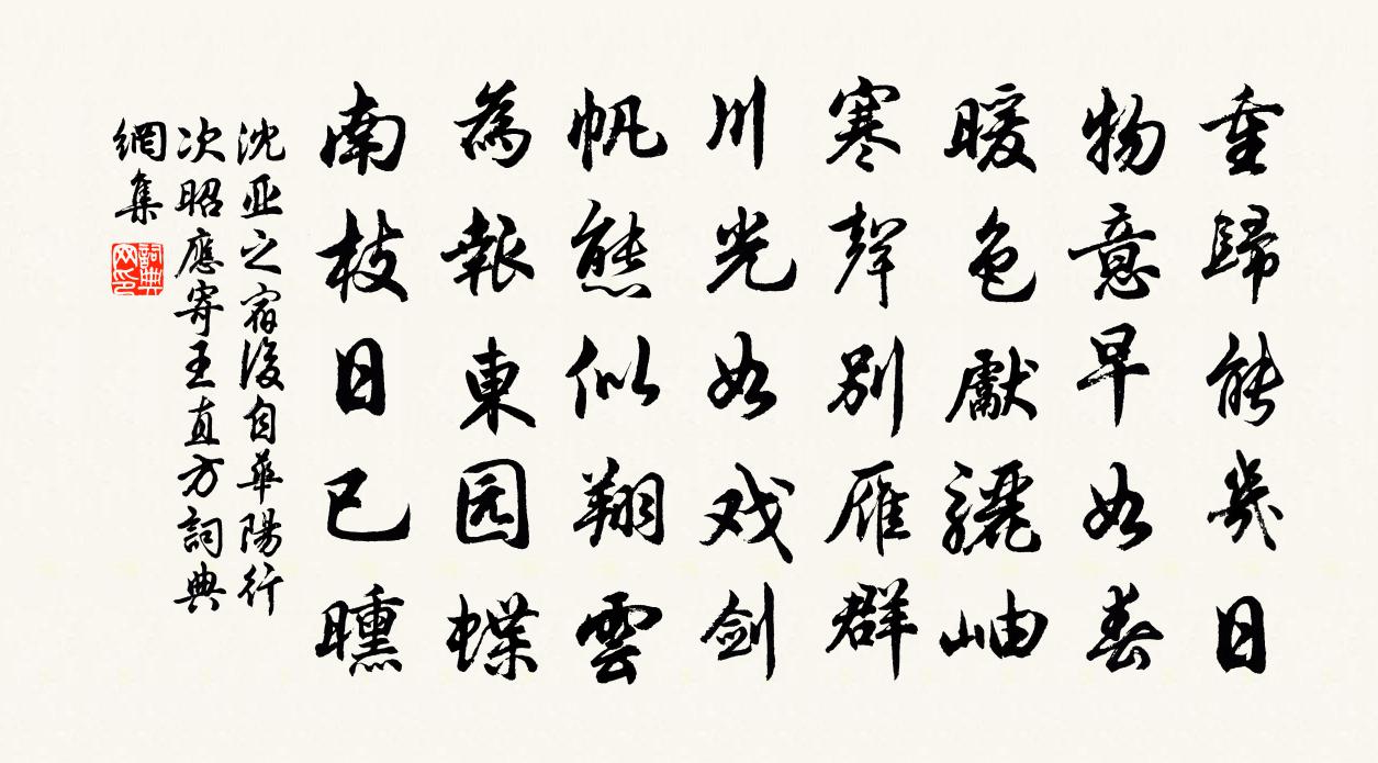 詩詞名句歷史字典書法欣賞書法字典國語詞典說文解字康熙字典古漢語字典標 題 作 者 詩 句 宿後自華陽行次昭應寄王直方作者:沈亞之 朝代:唐代原文重歸能幾日,物意早如春。暖色先驪岫,寒聲別雁群。川光如戲劍,帆態似翔雲。為報東園蝶,南枝日已曛。詩詞問答問:《宿後自華陽行次昭應寄王直方》的作者是誰?答:沈亞之問:該詩寫於哪個朝代?答:唐代問:該詩是什麼體裁?答:五律書法欣賞宿後自華陽行次昭應寄王直方書法作品注釋全唐詩:卷493-9詩詞推薦閒居白居易〔唐代〕深閉竹間扉,靜掃松下地。獨嘯晚風前,何人知此意。看山盡日坐,枕帙移時睡。誰能從我游,使君心無事。別家杜牧〔唐代〕初歲嬌兒未識爺,別爺不拜手吒叉。拊頭一別三千里,何日迎門卻到家?古意王銍〔宋代〕有恨匆匆別,無期緩緩歸。天涯作孤客,樓上對斜暉。目斷路不斷,魂飛花更飛。無多清滴淚,恐損別時衣。句焦炳炎〔宋代〕跡雖無地著,心實有天知。一禽從不獲,不敢范驅馳。詠史左思〔魏晉〕主父宦不達,骨肉還相薄。買臣困樵採,伉儷不安宅。陳平無產業,歸來翳負郭。長卿還成都,壁立何寥廓。四賢過景星山山頂一石立又名突星山楊萬里〔宋代〕山頭孤立玉竛{左立右甹},天上何年墮景星。四面萬峰非不峻,如何只是一峰青?題靈鷲四首湯漢〔宋代〕靈鷲古道場,攝乎大國間。一日忽翬飛,四雇無靦顏。織圖二十四首下簇樓璹〔宋代〕晴明開雪屋,門巷排銀山。一年蠶事辦,下簇春向闌。鄰里兩相駕,翁媼一笑歡。后妃應獻繭,喜色開天顏。和葉父賦海棠三首王洋〔宋代〕我愧留髠花惱客,君矜止廣尉貪公。傳呼徑去孤風景,幸好看時不暫同。宿島徑夷山舍陳陶〔唐代〕百里床遵島徑,床蓬徵信邅床回。暝依床漁樵宿,似過黃金台。缺齧心未理,寥寥夜猿哀。山深石床冷,海近腥氣偶成釋智圓〔宋代〕世態如輪轉,勞生豈定期。否終還受仄,樂極又生悲。商代尊伊尹,秦庭戮李斯。未能知紀化,安得證無為。滿庭芳(為趙西外壽)張元乾〔宋代〕玉葉聯芳,天潢分潤,壽筵長對薰風。間平襟度,濮邸行尊崇。忠孝家傳大雅,無喜慍、一種寬容。芝蘭盛,彩衣經過趙孟堅〔宋代〕二十年前漫浪遊,海天霜氣夜深浮。竹窗夢斷聞雞處,常憶溪灣塢聚頭。還彭澤山中早發董嗣杲〔宋代〕搖落山中曙,秋氣滿林隈。螢光映草頭,鳥影出枝來。殘星避日盡,斷霞逐風開。空返陶潛縣,終無宋玉才。次韻潘端叔送行二首趙蕃〔宋代〕君公隱牛儈,文休食馬磨。身則困空乏,道為如切磋。昧者不如此,輕受鄭灼唾。遑乎欲奚為,況覓陽春和。余惟夜坐有感劉應時〔宋代〕躬耕谷口未為貧,安得生涯似子真。平日固知窮有鬼,年來更覺老欺人。短檠頗怯蠅頭字,蠹簡時揩鼠亦塵。兒女漫興 其三王冕〔元代〕風花片片落瑤台,江北江南春未回。老子胸中自瀟灑,故鄉何處卻徘徊。海雲挾雨連天黑,江鸛如人近屋來。景物焦崖閣韋莊〔唐代〕李白曾歌蜀道難,長聞白日上青天。今朝夜過焦崖閣,始信星河在馬前。送曾黯游夔州張祜〔唐代〕不遠夔州路,層波灩澦連。下來千里峽,入去一條天。樹色秋帆上,灘聲夜枕前。何堪正危側,百丈半山顛。水龍吟 送侍御安公陝西行台,用馬西麓韻張野〔元代〕瘦筇攜得風煙,歸來擬待閒吟嘯。濟時人物,天公又早,安排都了。鳳詔泥封,烏台霜凜,好音新報。見西山一帶名句推薦行路難!行路難!多歧路,今安在?李白《行路難三首》 夢後樓台高鎖,酒醒簾幕低垂。晏幾道《臨江仙·夢後樓台高鎖》 侈而墮者貧,而力而儉者富。韓非及後人《韓非子·顯學》 錦瑟華年誰與度?賀鑄《青玉案·凌波不過橫塘路》 動失之繁,靜失之寡。王通《中說·卷十·關朗篇》 人間四月芳菲盡,山寺桃花始盛開。白居易《大林寺桃花》 紅橋路,正一派、畫船蕭鼓中流住。納蘭性德《摸魚兒·午日雨眺》 暗燈涼簟怨分離,妖姬,不勝悲。閻選《河傳·秋雨》 仗酒祓清愁,花銷英氣姜夔《翠樓吟·淳熙丙午冬》 匈奴草黃馬正肥,金山西見煙塵飛,漢家大將西出師。岑參《走馬川行奉送出師西征 / 走馬川行奉送封大夫出師西征》