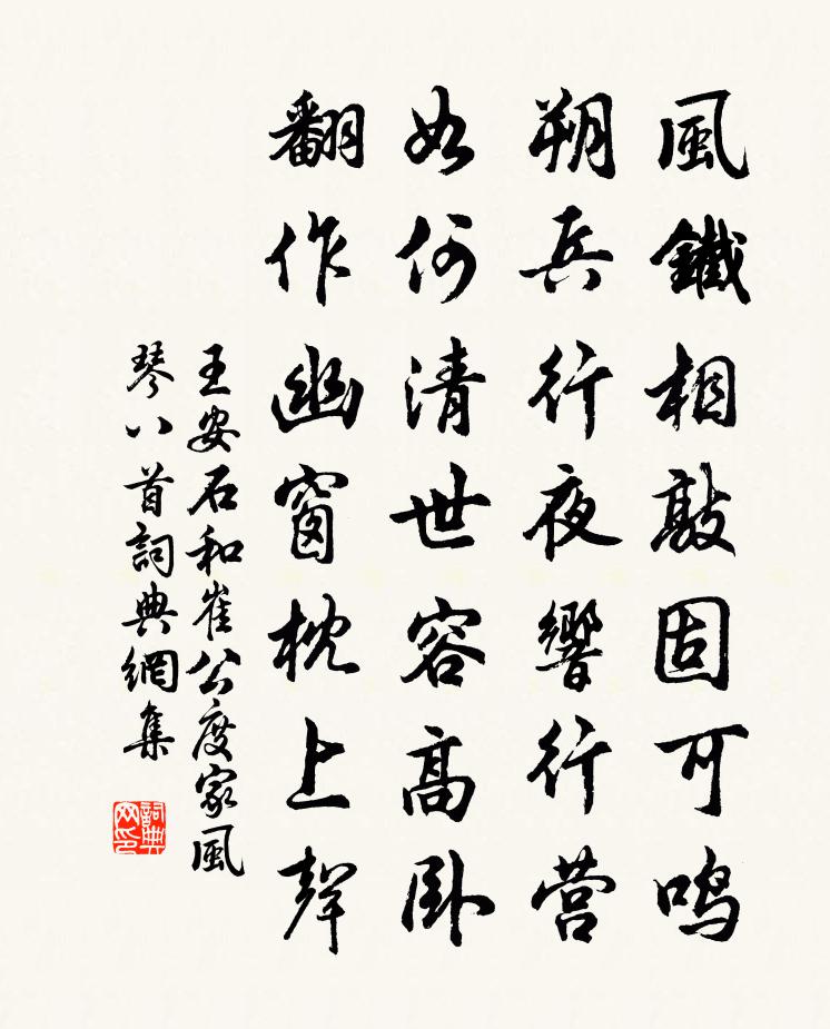 詩詞名句歷史字典書法欣賞書法字典國語詞典說文解字康熙字典古漢語字典標 題 作 者 詩 句 和崔公度家風琴八首作者:王安石 朝代:宋代和崔公度家風琴八首原文風鐵相敲固可鳴,朔兵行夜響行營。如何清世容高臥,翻作幽窗枕上聲。詩詞問答問:和崔公度家風琴八首的作者是誰?答:王安石問:和崔公度家風琴八首寫於哪個朝代?答:宋代問:王安石的名句有哪些?答:王安石名句大全王安石和崔公度家風琴八首書法欣賞和崔公度家風琴八首書法作品詩詞推薦梁鞞舞歌 明之君 四沈約〔南北朝〕治兵戰六獸。為邦命九官。靈蛇及瑞羽。分素復銜丹。望就踰軒頊。鏗鏘掩鹹護。九尾擾成羣。八象鳴相顧。象天不寐十首方回〔宋代〕無寐復無寐,自知仍自知。少狂今始悔,宿疾尚堪醫。雪水消殘酒,燈花送好詩。元龍湖海氣,老矣復何施。食野菜陸游〔宋代〕野蔌山蔬次第嘗,超然氣壓太官羊。放翁此意君知否?要配吳粳曉甑香。春寒文同〔宋代〕東風何事力猶微,凜凜邊寒犯客衣。舊雪未消新雪下,南園春色幾時歸。治塗田釋正覺〔宋代〕棋局未散芭蕉仙,樵夫柯爛海成田。長堤抗潮人得路,淡水沒脛牛加鞭。天雲晚晴深似綺,禾稻日藏濃如煙。白米秋思陸游〔宋代〕眼明尚見蠅頭字,暑退初親雁足燈。歷歷胸中千載事,莫將輕比住庵僧。早春病中王建〔唐代〕日日春風階下起,不吹光彩上寒株。師教絳服禳衰月,妻許青衣侍病夫。健羨人家多力子,祈求道士有神符。世間冬日北庭懷餘杭舊僚屬蘇頌〔宋代〕曾約尋山春水間,越江吳岫遍留連。沙頭寺院看花日,湖上樓台試茗天。酒後歌呼常薄暮,風流雲散忽經年。異方偈傾一百六十九首釋智朋〔宋代〕看樓打樓,東涌西沒。入水入泥,穿皮透骨,十字街頭石敢當。忽會轉身句,便笑遼天鶻,達磨大師眼睛突。荒口范成大〔宋代〕十步九吃蹶,百夫半蹣跚。豁然鳥道窮,努力造其巔。謂是嶺頭了,一峰復當前。既無反顧法,仰望心茫然忍公小軒二首(一本題上有西蜀淨眾寺五字)鄭谷〔唐代〕松溪水色綠於松,每到松溪到暮鍾。閒得心源只如此,問禪何必向雙峰?舊遊前事半埃塵,多向林中結淨因。一念永遇樂王吉昌〔元代〕機括獨行,猶然形累,莊嚴神正。諸漏牢封,萬緣齊剪,豁達開心鏡。禪關打破,壺春深入,萬象拱環七政。天河瑞鶴仙希叟〔宋代〕燕堂秋未老。正木犀香散,芙蓉紅小。門闌瑞煙繞。望銀河月暗,壽星偏照。碧霞道要。有真人、親傳最妙。況桃送江陵元司錄韓翃〔唐代〕新領州從事,曾為朝大夫。江城竹使待,山路橘官扶。片雨三江道,殘秋五葉湖。能令詩思好,楚色與寒蕪。禽言如日哥哥姜夔〔宋代〕君不見苕溪西南石鼓山,鳥如鸜鵒啼其間。土人相傳是阿弟,千呼萬喚雲復還。身為獨雁失儔侶,所愧鶺鴒圖急難再次韻兼簡履中南玉三首黃庭堅〔宋代〕鎖江亭上一樽酒,山自白雲江自橫。李侯短褐有長處,不與俗物同條生。經術貂蟬續狗尾,文章瓦釜作雷鳴。古來得家書於石〔宋代〕久客秋又晚,思家夢屢驚。空階聞葉落,隔樹見燈明。親老貧常健,兒痴學未成。淒涼今夜月,照我故鄉情。次韻廉夫登沮微亭二首傅察〔宋代〕大火枕氣方熾,枕新金伏未枕興。茅屋苦卑陋,蘊毒空自憎。流汗常被體,枕煩屢飲冰。那堪青蠅輩,鼓翅作威稜和僕射牛相公春日閒坐見懷劉禹錫〔唐代〕官曹崇重難頻入,第宅清閒且獨行。階蟻相逢如偶語,園蜂速去恐違程。人於紅藥惟看色,鶯到垂楊不惜聲。東洛東歸葛起耕〔宋代〕游倦歸來似長卿,弊廬事事費經營。掃除塵土虛堂潔,拂拭窗欞舊紙明。徑菊已荒唯草長,井花少汲覺苔生。寒衣名句推薦秋霜切玉劍,落日明珠袍李白《白馬篇》 將軍金甲夜不脫,半夜軍行戈相撥,風頭如刀面如割。岑參《走馬川行奉送出師西征 / 走馬川行奉送封大夫出師西征》 柳花深巷午雞聲,桑葉尖新綠未成。范成大《春日田園雜興》 從此信音稀,嶺南無雁飛。李師中《菩薩蠻·子規啼破城樓月》 宜有詞仙,擁素雲黃鶴,與君遊戲。姜夔《翠樓吟·淳熙丙午冬》 楓落河梁野水秋。淡煙衰草接郊丘。蘇庠《鷓鴣天·楓落河梁野水秋》 梅子黃時日日晴,小溪泛盡卻山行曾幾《三衢道中》 已過才追問,相看是故人。吳偉業《遇舊友》 凡所有相。皆是虛妄。若見諸相非相。則見如來。鳩摩羅什譯《金剛經·如理實見》 故仁莫大於愛人,智莫大於知人。文子《文子·卷七·微明》