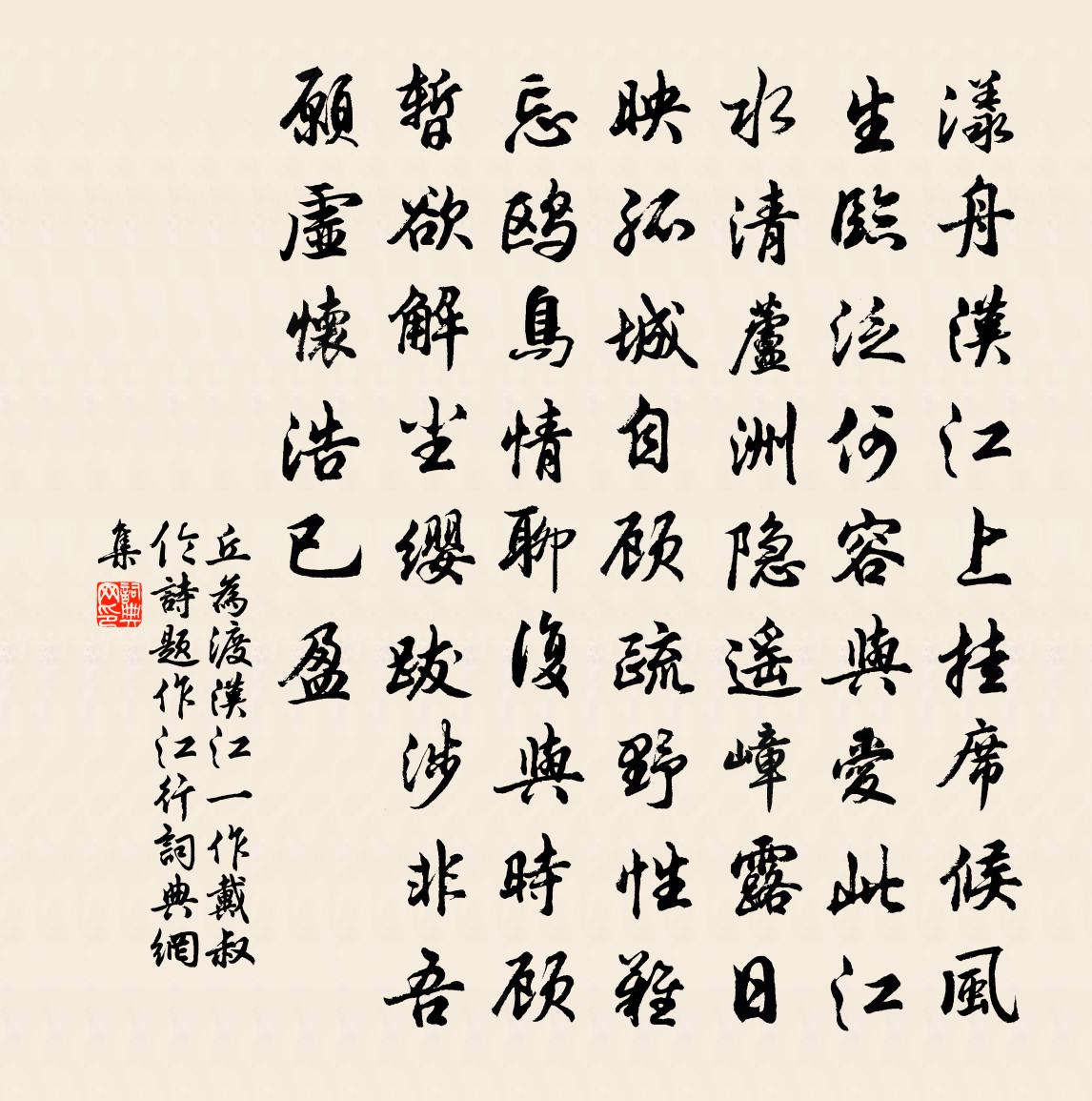 詩詞名句歷史字典書法欣賞書法字典國語詞典說文解字康熙字典古漢語字典標 題 作 者 詩 句 渡漢江(一作戴叔倫詩,題作江行)作者:丘為 朝代:唐代原文漾舟漢江上,掛席候風生。臨泛何容與,愛此江水清。蘆洲隱遙嶂,露日映孤城。自顧疏野性,難忘鷗鳥情。聊復與時顧,暫欲解塵纓。跋涉非吾願,虛懷浩已盈。詩詞問答問:《渡漢江(一作戴叔倫詩,題作江行)》的作者是誰?答:丘為問:該詩寫於哪個朝代?答:唐代書法欣賞渡漢江(一作戴叔倫詩,題作江行)書法作品注釋全唐詩:卷129_56詩詞推薦跋任才仲畫兩首陳與義〔宋代〕遠遊吾不恨,扁舟載幅巾。山色暮暮改,林氣朝朝新。野客初逢句,薄暮欲生春。因知子任子,胸懷非世人。詠史下蜀先主陳普〔宋代〕徐元直去馬超來,顧惜三綱又愛才。道御英雄無不可,豫州翻向益州來。園亭覽物韋應物〔唐代〕積雨時物變,夏綠滿園新。殘花已落實,高筍半成筠。守此幽棲地,自是忘機人。和鄭拾遺秋日感事一百韻韋莊〔唐代〕禍亂天心厭,流離客思傷。有家拋上國,無罪謫遐方。負笈將辭越,揚帆欲泛湘。避時難駐足,感事易迴腸。雅道小山見梅陳廷光〔宋代〕小雪梅香已破緘,羅浮春信許先探。松林酒肆知誰醉,石壁題詩只自慚。未放翠禽呼夢覺,待教黃野縱鸞驂。行當寄僧鐘山淨珏顧逢〔宋代〕忘懷獨有師,每恨會時稀。作別不得見,相尋聞已歸。兩雞花下鬭,一蝶雨中飛。想在陳湖寺,紉衣掩竹扉。送小師心印遊方釋可湘〔宋代〕自從落腳出娘胎,一印何曾打失來。滿目春山春水綠,重重綿縫為誰開。鶴聯句歐陽修〔宋代〕上霄琴降靈氣,琴鍾此千年禽。幽閒靖節琴,孤高伯夷心。頡頻紫霄垠,飄颻滄浪潯。岳湛有仙姿,鈞韶無俗音。家有含笑花開因成三首李呂〔宋代〕山花弄春妍,紫霧巧映帶。凝羞香乍吐,顰蹙有餘態。芍藥畏陽艷,愁紅爭斂黛。幽姿小嫣然,已復傾下蔡。頌古十一首釋子益〔宋代〕盡道趙州勘婆子,不知婆子勘趙州。有意氣時添意氣,不風流處也風流。大江東去劉志淵〔元代〕人生最貴,稟五行真氣,千靈夙賦。首足方圓天地肖,反被陰陽陶鑄。秋月春花,昨朝今日,斷送紅顏去。前程路夜雨陸游〔宋代〕空階雨聲夜轉急,壁疏窗破淒風入。一燈嫋嫋吹欲滅,老生獨傍書架立。取書欲讀輒復休,卻行出門搔白頭,市樓送文總管朝燕四首劉應鳳〔宋代〕點檢桑枌淚幾行,羞和書屋總荒涼。孔明景略留遺傳,分掛當年夜雨床。好勝吟邵雍〔宋代〕人無好勝,事無過求。好勝多辱,過求多憂。憂辱並至,道德弗游。不止人患,身亦是仇。村居遣興陸游〔宋代〕野堂疏豁近江皋,喜見南山秋氣高。野外漸寒群木脫,草根薄暮百蟲號。築陂浚畎更相勉,伐荻劙桑敢愛勞。亦念和麟老韻五絕王炎〔宋代〕清如野鶴有仙骨,閒似片雲無俗情。試問老人那得病,定應金粟是前生。程文簡公輓詞三首梅堯臣〔宋代〕將相榮難及,唐虞世已遭。各將官愈大,節固位同高。哀悼王朝輟,鐫埋史筆操。空山伊水外,松柏冷蕭騷。西江月張掄〔宋代〕獨坐閒觀瑞雪,方知造化無偏。不論林木與山川。白玉一時裝遍。梁苑休尋賦客,山陰莫上溪船。三杯醉□意陶然鄱陽湯仲材以其家息庵存齋東澗三大老鄂州黃方回〔宋代〕黃鶴磯頭百戰塵,黃龍詩刻尚如新。終然峴首碑安在,羊祜元非死朽人。次韻答趙文卿四首陳造〔宋代〕簾疏財許客窺班,未得纏頭小破慳。已結雲愁蜚蝶夢,莫斜秋水蹙春山。名句推薦萬里浮雲卷碧山,青天中道流孤月。李白《答王十二寒夜獨酌有懷》 雨蓑煙笠嚴陵近,慚愧清流照客顏查慎行《雨過桐廬》 男兒西北有神州,莫滴水西橋畔淚。劉克莊《玉樓春·戲林推》 自暴者,不可與有言也;自棄者,不可與有為也。孟子《孟子·離婁章句上·第十節》 穗帷飄井幹,樽酒若平生。謝朓《同謝諮議詠銅雀台》 久廢山行疲犖确,尚能村醉舞淋浪。蘇軾《捕蝗至浮雲嶺山行疲苶有懷子由弟二首·其二》 年年越溪女,相憶采芙蓉。杜荀鶴《 * 怨》 假令風歇時下來,猶能簸卻滄溟水李白《上李邕》 思君令人老,歲月忽已晚。佚名《行行重行行》 天與火,同人;君子以類族辨物。佚名《易傳·象傳上·同人》