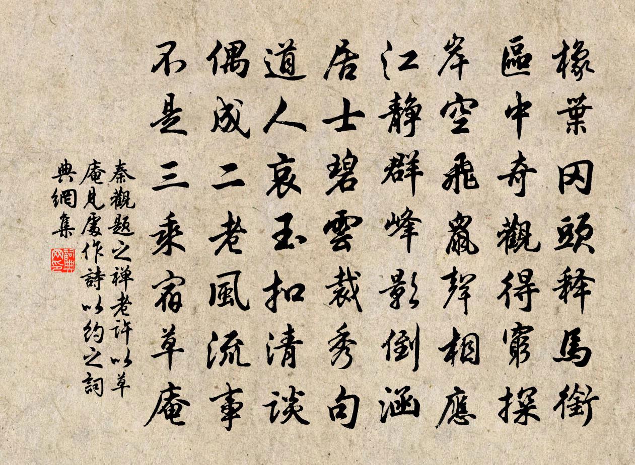 詩詞名句歷史字典書法欣賞書法字典國語詞典說文解字康熙字典古漢語字典標 題 作 者 詩 句 題之禪老許以草庵見處作詩以約之作者:秦觀 朝代:宋代原文橡葉岡頭釋馬銜,區中奇觀得窮探。岸空飛鼠聲相應,江靜群峰影倒涵。居士碧雲裁秀句,道人哀玉扣清談。偶成二老風流事,不是三乘宿草庵。詩詞問答問:《題之禪老許以草庵見處作詩以約之》的作者是誰?答:秦觀問:該詩寫於哪個朝代?答:宋代問:秦觀的名句有哪些?答:秦觀名句大全書法欣賞題之禪老許以草庵見處作詩以約之書法作品詩詞推薦釣台艾可翁〔宋代〕雲檯曆曆紀功臣,底事中間有子陵。未必故人同臥處,了無一語及中興。邊將三首司馬光〔宋代〕月白星稀霜氣多,卷旗束甲涉蔥河。田家不覺官軍度,夜半隻聞風雨過。無題徐再思〔元代〕一望二三里,煙村四五家。樓台六七座, * 十枝花。趙用甫提舉夢中得片雲不隔梅花月之句時被命戴復古〔宋代〕一時議論動諸公,有詔西來玉節東。又見清朝更大化,好趨丹陛奏孤忠。片雲不隔梅花月,一雪翻成柳絮風。把酒賦得臨池竹李世民〔唐代〕貞條障曲砌,翠葉貫寒霜。拂牖分龍影,臨池待鳳翔。題應天寺齊廓〔宋代〕實勢聳如飛,檐牙照錦翬。路盤危磴出,僧觸斷雲歸。萬井分塵界,千岩在目圍。浮生枉多事,到此合忘機。寄題袁機仲侍郎殿撰建溪北山四景妙淨庵楊萬里〔宋代〕韓子不肯佛,饒操苦出家。何如妙淨老,紫橐碧蓮花。梁宗廟登歌 三沈約〔南北朝〕有夏多罪。殷人塗炭。四海倒懸。十室思亂。自天命我。殱凶殄難。既躍乃飛。言登天漢。爰享爰格。福祿攸贊。挽族父承務郎衡之三首陳著〔宋代〕當年延桂塾,承乏愧無能。以子視宗族,如家安友朋。春風文字酒,夜雨誦弦鐙。古首淒誰續,心安淚欲冰。陳粹中再約重陽之集即不果赴以詩寄這二首王洋〔宋代〕九月南州菊未黃,年年長待飽經霜。使君著意勤招客,催促離間日夜忙。西明寺牡丹花時憶元九白居易〔唐代〕前年題名處,今日看花來。一作芸香吏,三見牡丹開。豈獨花堪惜,方知老暗催。何況尋花伴,東都去未回。詎知記夢陳傅良〔宋代〕窪然石壁罅,涓涓如絲繩。其人指此泉,下去為滄溟。旁有玉蟾蜍,空中底方平。視之鼻通尻,徹竅刻畫精。泉從東庵與道者語有感張蘊〔宋代〕瘦策松間日又斜,更過東崦吃僧茶。丹青嶺樹膽寒葉,水墨江天噪亂鴉。付酒一杯真樂事,讀書萬卷是愁涯。更嘗送張仲實游姑蘇連文鳳〔宋代〕君本吳下居,復作吳下游。愛此山水怪,役役不得休。卓哉太史公,涉獵縱冥搜。往躅誰能追,而有蘇子由。寥寥偈頌九十三首釋梵琮〔宋代〕普天迎瑞氣,遍界慶生辰。水有朝宗意,葵傾向日心。衲僧隨日轉,林下仰天庭。寒夜吟陸游〔宋代〕仕宦孰不願美官,無如兩膊聳聳寒。可憐誤信紙上語,至死功名心未闌。骯髒得倚門,矍櫟猶據鞍,何如百年中,田鶴司空曙〔唐代〕散下渚田中,隱見菰蒲里。哀鳴自相應,欲作凌風起。感春三首張耒〔宋代〕東風吹桃李,花落已滿地。搖搖新柳枝,薄蔭才可芘。誰雲同一時,榮謝兩異意。由來何足較,要之歸一致。哭劉司戶二首李商隱〔唐代〕離居星歲易,失望死生分。酒瓮凝余桂,書籤冷舊芸。江風吹雁急,山木帶蟬曛。一叫千回首,天高不為聞。有美惠州近城數小山類蜀道春與進士許毅野步會意蘇軾〔宋代〕夕陽飛絮亂平蕪,萬里春前一酒壺。鐵化雙魚沉遠素,劍分二嶺隔中區。花曾識面香仍好,鳥不知名聲自呼。夢想名句推薦敗葉填溪水已冰,夕陽猶照短長亭。納蘭性德《浣溪沙·敗葉填溪水已冰》 睡起莞然成獨笑,數聲漁笛在滄浪。蔡確《夏日登車蓋亭》 欲黃昏。雨打梨花深閉門。李重元《憶王孫·春詞》 宮女如花滿春殿,只今惟有鷓鴣飛。李白《越中覽古》 風一更,雪一更,聒碎鄉心夢不成,故園無此聲。納蘭性德《長相思·山一程》 積土成山,風雨興焉;積水成淵,蛟龍生焉;荀子《勸學》 崑山玉碎鳳凰叫,芙蓉泣露香蘭笑。李賀《李憑箜篌引》 千嬌面、盈盈佇立,無言有淚,斷腸爭忍回顧。柳永《採蓮令·月華收》 得失一朝,而榮辱千載。范曄《後漢書·列傳·荀韓鐘陳列傳》 願得此身長報國,何鬚生入玉門關。戴叔倫《塞上曲二首·其二》