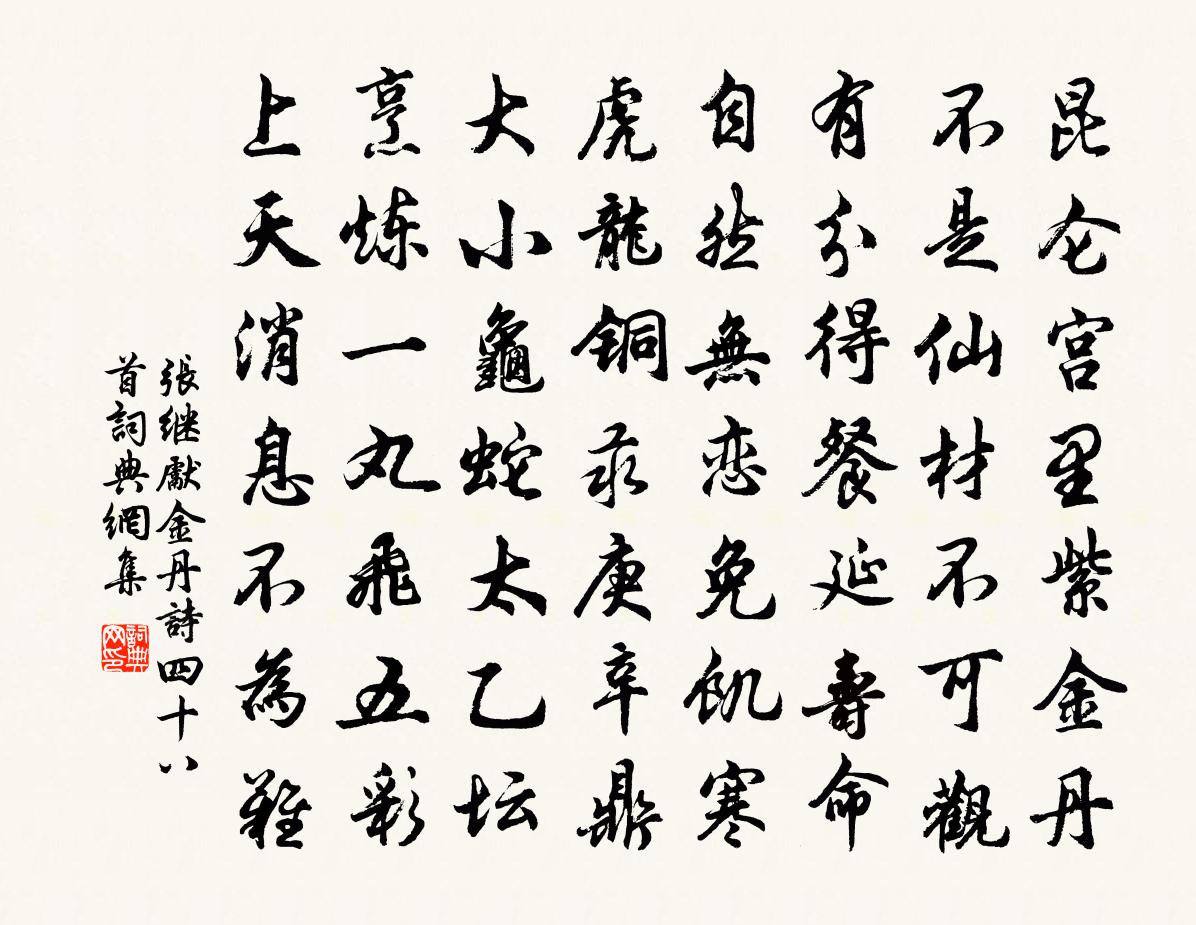 詩詞名句歷史字典書法欣賞書法字典國語詞典說文解字康熙字典古漢語字典標 題 作 者 詩 句 金丹詩四十八首作者:張繼先 朝代:宋代金丹詩四十八首原文崑崙宮裡紫金丹,不是仙材不可觀。有分得餐延壽命,自然無戀免饑寒。虎龍銅汞庚辛鼎,大小龜蛇太乙壇。烹煉一丸飛五彩,上天訊息不為難。詩詞問答問:金丹詩四十八首的作者是誰?答:張繼先問:金丹詩四十八首寫於哪個朝代?答:宋代張繼先金丹詩四十八首書法欣賞金丹詩四十八首書法作品詩詞推薦江上范成大〔宋代〕天色無情淡,江聲不斷流。古人愁不盡,留與後人愁!清平樂韋莊〔唐代〕何處游女,蜀國多雲雨。雲解有情花解語,剗地繡羅金縷。妝成不整金鈿,含羞待月鞦韆。住在綠槐陰里,門臨春病起五首劉克莊〔宋代〕百歲將闌猛省驚,六根不足可憐生。古人使祝為祈死,叔世無人吊失明。昔捱殘更羞渴睡,今當清晝要扶行。時於青溪二首馬之純〔宋代〕人日泛青溪,青溪曲易迷。船回波上下,簾卷日東西。景物行行見,壺觴處處攜。浮航消得醉,極目水雲低。禪人並化主寫真求贊釋正覺〔宋代〕眉垂而楊,只默而方。了見源底,淨極發光。月魂排夜色,鬥氣濯秋霜。誰嫌眼上瞋生角,我道機前影不章。越州歌二十首汪元量〔宋代〕群臣上疏納忠言,國害分明在目前。只論平章行不法,公田之後又私田。送焦吏部造朝二首李曾伯〔宋代〕向來借箸在籌帷,今趣魁纏入太微。漢郡奚勞汲生守,洛人喜見范公歸。要持真是明公論,莫急同心濟事機。見說千秋歲石孝友〔宋代〕春工領略。占破群花萼。對流景,傷淪落。踏青心縷懶,病酒情懷惡。無奈處,東風故故吹簾幕。腕玉寬金約。一池州和同官詠梅花張道洽〔宋代〕突出一清枝,孤村雪擁籬。韻無凡眼識,香有自心知。不是神仙骨,何緣冰玉姿。看看金鼎實,此味幾人思。同曼叔諸君登醴泉觀凝碧亭韓維〔宋代〕門前車馬塵,當晝塞昏霧。安知此亭上,秋色生四顧。黃花散晴陽,赤葉變寒露。境非遊覽舊,人得朋從素。樂幽病酒晁公溯〔宋代〕遣愁自笑筆無功,醉覺花梢入眼紅。本擬消磨付杯勺,不堪中酒過春風。江月·十月晴江月施閏章〔清代〕十月晴江月,微風夜未寒。依人光不定,照影思無端。少壯隨波去,關河行路難。平生素心友,莫共此時看。抒懷上歙州盧中丞宣州杜侍郎趙嘏〔唐代〕東來珠履與旌旗,前者登朝亦一時。竹馬迎呼逢稚子,柏台長告見男兒。花飄舞袖樓相倚,角送歸軒客盡隨。獨有嘲崔垂休佚名〔宋代〕慈恩塔下親泥壁,滑膩光華玉不如。何事博陵崔四十,金陵腿上逞歐書。己丑中秋寓宿玉堂,聞沈公雅大卿、劉正夫戶范成大〔宋代〕笑看收雲卷雨忙,沉沉宮樹納空光。夜長來伴玉堂宿,天近似聞丹桂香。鳷鵲樓欄浮瑞氣,鳳凰城闕帶新涼。遙知送李道士歸文同〔宋代〕先生狀貌古,瘦健若老鶴。秋風唳清霄,寒響滿寥廓。一腹冰雪詞,勿為俗人作。便可住鵝池,乾死守岩壑。題齊安城樓杜牧〔唐代〕嗚咽江樓角一聲,微陽瀲瀲落寒汀。不用憑闌苦回首,故鄉七十五長亭。接花方岳〔宋代〕楚籜並刀杜雨前,掇紅接紫自年年。顛風稗子僧成佛,白日燦柯人詐仙。半霎時移愚智性,一丸泥奪化工權。可憐聞嚴秘書與正字及諸客夜會因寄武元衡〔唐代〕衡門寥落歲陰窮,露濕莓苔葉厭風。聞道今宵阮家會,竹林明月七人同。涪州得山胡(善鳴,出黔中)蘇軾〔宋代〕終日鎖筠籠,回頭惜翠茸。誰知聲??,亦自意重重。夜宿煙生浦,朝鳴日上峰。故巢何足戀,鷹隼豈能容。名句推薦但信己,不信人,此取敗之由也。王永彬《圍爐夜話·第八五則》 莫笑農家臘酒渾,豐年留客足雞豚。陸游《游山西村》 淮水悠悠。萬頃煙波萬頃愁。淮上女《減字木蘭花·淮山隱隱》 湖水無端浸白雲,故人書斷孤鴻沒。黃庭堅《秋懷二首》 露葉翻風驚鵲墜。暗落青林紅子。陳師道《清平樂·秋光燭地》 柳鎖鶯魂,花翻蝶夢,自知愁染潘郎史達祖《夜合花·柳鎖鶯魂》 半竿落日,兩行新雁,一葉扁舟。賀鑄《眼兒媚·蕭蕭江上荻花秋》 淥水明秋月,南湖采白蘋。李白《淥水曲》 聚散匆匆,此恨年年有。魏夫人《點絳唇·波上清風》 簾控鉤,掩上珠樓,風雨替花愁喬吉《春閨怨·不系雕鞍門前柳》