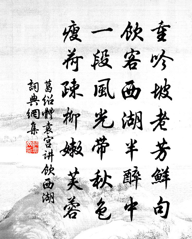 詩詞名句歷史字典書法欣賞書法字典國語詞典說文解字康熙字典古漢語字典標 題 作 者 詩 句 袁宮講飲西湖作者:葛紹體 朝代:宋代袁宮講飲西湖原文重吟坡老芳鮮句,飲客西湖半醉中。一段風光帶秋色,瘦荷疎柳嫩芙蓉。詩詞問答問:袁宮講飲西湖的作者是誰?答:葛紹體問:袁宮講飲西湖寫於哪個朝代?答:宋代葛紹體袁宮講飲西湖書法欣賞袁宮講飲西湖書法作品詩詞推薦聒龍謠汪莘〔宋代〕夢下瑤台,神飛閬苑,自嘆塵寰久客。三入成周,望皇居帝宅。盪蘭槳、伊闕波濤,曳玉杖、洛陽阡陌。獨躊躇、張時可惠示甲乙藁楊簡〔宋代〕凌晨帶月上竹輿,荷君封送兩卷書。朦朧未省何文字,中道曉色來徐徐。乃是約齋甲乙藁,驚喜遽讀味新好。一篇不浮次歆予亦再賦高斯得〔宋代〕咨余運頹侵,非復少年日。嵇康既習懶,長卿又嬰疾。避客如避仇,俗子意多失。獨於聲氣同,跡兩心事一。糲飯與成父別後有懷趙蕃〔宋代〕何物催衰白,頻年屢別離。弟兄俱老境,搖落況秋時。汝水應余憶,袁江獨爾思。不堪行似棘,更對雨如絲。南歌子(暮春值雨)趙長卿〔宋代〕黯靄陰雲覆,滂沱急雨飛。洗殘枝上亂紅稀。恰是退花天氣、困人時。向曉春酲重,偎人起較遲。薄羅初見拭輕衣魯巷太師廟韓維〔宋代〕善教邈無跡,其流在民心。君看魯太師,廟食猶至今。豈如文俗土,朱墨坐浮沉。趨營止目前,不顧患害深。去漢成都遨樂詩二十一首二日出城田況〔宋代〕初歲二之日,言出東城闉。緹騎隘重乳,淤車坌行塵。原野信滋腴,景物爭光新。青疇隱遙壩,弱柳垂芳津。隱卒次韻吳傳正枯木歌蘇軾〔宋代〕天公窗水墨自奇窗絕,瘦竹枯松寫殘月。夢回疏影在東窗,驚怪霜枝連夜發。生成變壞一彈指,乃知造物初無物。睡足軒二首秦觀〔宋代〕長年憂患百端慵,開斥僧坊頗有功。地撤蔽虧僧界淨,人除荒穢玉奩空。青天併入揮毫里,白鳥時興隱几中。最是挽劉母王宜人二首劉克莊〔宋代〕上壽今何憾,殷憂昔備嘗。分燈照鄰女,畫荻訓賢郎。石窌將開邑,隴阡自表岡。吾衰彤管廢,短些不成章。夢語洪咨夔〔宋代〕塵尾御犢轅,竹枝招羊車。意足各人眼,心合無天涯。寶扇閒草蟲,碧衫涼暗花。荼蘼金沙底,清歌按紅牙。醒疑經過趙孟堅〔宋代〕二十年前漫浪遊,海天霜氣夜深浮。竹窗夢斷聞雞處,常憶溪灣塢聚頭。十二月大雨裘萬頃〔宋代〕一冬都無五日寒,赤日杲杲后土乾。水官丐歸帝弗許,詰朝不雨吾戮汝。斯須便放大瓢傾,一洗萬里塵埃清。不妨畫堂春·雨中杏花陳子龍〔明代〕輕陰池館水平橋,一番弄雨花梢。微寒著處不勝嬌,此際魂銷。 憶昔青門堤外,粉香零亂朝朝。玉顏寂寞淡紅次京師韻送表弟程懿叔赴夔州運判蘇軾〔宋代〕與子甥舅氏,摧頹各蒼顏。並為東諸侯,長此佳江山。寒松無時花,安得插髻鬟。惟將老不死,一笑榮枯間。我甚感興何夢桂〔宋代〕擬將物化問漁樵,妙里無形本寂寥。大地雲生千嶂雨,中天月上九溟潮。山河劫運九中化,世界塵緣座上銷。此意九江春半雨中寒甚忽見梨花楊冠卿〔宋代〕江城一雨春強半,寒色著人芳信遲。賴有梨花遮病眼,一枝帶雨出疏籬。南窗釋惟一〔宋代〕百一十城煙水外,玲瓏八面自天開。等閒坐斷東西北,無限薰風拂拂來。用一代不數人百年能幾見為韻詩賦十章呈陳君趙蕃〔宋代〕人言會合難,會合端有數。公不絕櫧洲,我政長沙住。詩訣舒岳祥〔宋代〕蕢桴土鼓為聲始,天球河圖非琢工。欲自柳州參靖節,將邀東野適盧仝。平原駿馬開黃霧,下水輕舟遇快風。歷歷名句推薦倍道而妄行,則天不能使之吉。荀子《荀子·天論》 霜風漸欲作重陽,熠熠溪邊野菊香。蘇軾《捕蝗至浮雲嶺山行疲苶有懷子由弟二首·其二》 姑蘇城外寒山寺,夜半鐘聲到客船張繼《楓橋夜泊》 山中相送罷,日暮掩柴扉。王維《送別 / 山中送別 / 送友》 喚起一天明月,照我滿懷冰雪,浩蕩百川流。辛棄疾《水調歌頭·和馬叔度游月波樓》 人過留名,雁過留聲。佚名《增廣賢文·下集》 無言暗將紅淚彈闌珊,香銷輕夢還納蘭性德《河傳·春淺》 一別如斯,落盡梨花月又西。納蘭性德《採桑子·當時錯》 清晨入古寺,初日照高林。常建《題破山寺後禪院》 傷心千古,秦淮一片明月!薩都剌《念奴嬌·登石頭城次東坡韻》