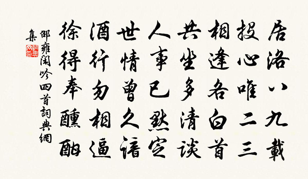 詩詞名句歷史字典書法欣賞書法字典國語詞典說文解字康熙字典古漢語字典標 題 作 者 詩 句 閒吟四首作者:邵雍 朝代:宋代閒吟四首原文居洛八1|1九載,投心唯二三。相逢各白首,共坐多清談。人事已默定,世情曾久諳。酒行勿相逼,徐得奉醺酣。詩詞問答問:閒吟四首的作者是誰?答:邵雍問:閒吟四首寫於哪個朝代?答:宋代邵雍閒吟四首書法欣賞閒吟四首書法作品詩詞推薦亂定復過西溪舒岳祥〔宋代〕不過西溪三十秋,亂余重到淚雙流。黃蒿滿地青煙少,日暮驅車不敢留。早春錢塘湖晚眺張祜〔唐代〕落日下林坂,撫襟睇前蹤。輕澌流回浦,殘雪明高峰。仰視天宇曠,俯登雲樹重。聊當問真界,昨夜西巒鍾。落梅風·薔薇露馬致遠〔元代〕薔薇露,荷葉雨,菊花霜冷香庭戶。梅梢月斜人影孤,恨薄情四時辜負。財昏陳造〔宋代〕師昏古所辭,財昏今不恥。傳祀合二姓,古者貴由禮。四德五可外,貨賄亦末爾。民風日就頹,舍此爭校彼。媒氏李白徐鈞〔宋代〕風骨神仙籍里人,詩狂酒聖且平生。開元一遇成何事,留得千秋萬古名。雨作,抵暮復晴五首楊萬里〔宋代〕棲鵲無陰庇濕衣,行人仄傘避斜絲。船兵歸後轎兵去,獨立淮河暮雨時。送游堯臣歸閩六首王炎〔宋代〕良農種嘉穀,未必皆歲豐。世間固無巧,得喪系其逢。汾上百斛鼎,嶧陽七絲桐。清廟不登薦,造物頗未工。不移水調歌頭李處全〔宋代〕金節照南國,畫戟壯陪都。嚴譙古角霜曉,雄勝壓全吳。蔥倩采香古徑,縹緲折梅新奏,春事早關渠。誰識使君意留別司馬太守王昌齡〔唐代〕辰陽太守念王孫,遠謫沅溪何可論。黃鶴青雲當一舉,明珠吐著抱君恩。淳祐祭海神十六首佚名〔宋代〕薄昌之澤,派引天潢。閏娥出入,浩渺微茫。蓋高斯覆,獨隔對疆。我思六合,筆正吉昌。九月初十日值宿玉堂七絕劉克莊〔宋代〕形槁心灰一禿翁,偶來視草禁林中。幼吹蔥葉還堪聽,老畫葫蘆卻未工。夏日寄史處士孟貫〔唐代〕掩關苔滿地,終日坐騰騰。暑氣冷衣葛,暮雲催燭燈。寂寥知得趣,疏懶似無能。還憶舊遊否,何年別杜陵。十二時頌釋文準〔宋代〕人定亥,老鼠此時正無礙。忽然燈滅寢堂前,床前咬我靸鞋袋。端居二首張耒〔宋代〕余寒羞老木,慘澹氣未平。平國富車馬,士女競新正。風埃息九陌,紈綺艷重城。燈稀夕煙車,斗轉夜寒生。倚楹和樓前梅兩絕洪咨夔〔宋代〕飛香漲艷拍檐牙,暖熱樓居鄂陸家。寶髻盤鴉冰柱曉,倚闌平拍北梢花。琴台(司馬相如宅在州西笮橋,北有琴台)杜甫〔唐代〕茂陵多病後,尚愛卓文君。酒肆人間世,琴台日暮雲。野花留寶靨,蔓草見羅裙。歸鳳求皇意,寥寥不復聞。木犀姚勉〔宋代〕賣花擔上買秋光,分貯冰壺沁曉涼。滴取露珠供硯水,筆頭已覺帶天香。贈李輔聖黃庭堅〔宋代〕交蓋相逢水急流,八年今復會荊州。已回青眼追鴻翼,肯使黃塵沒馬頭。舊管新收幾妝鏡,流行坎止一虛舟。相看金陵十二釵正冊——妙玉曹雪芹〔清代〕欲潔何曾潔?雲空未必空。可憐金玉質,終陷淖泥中。垂虹聞笛吳芾〔宋代〕三十年前此憑欄,醉聽漁笛暮江寒。重業雖復聞三弄,老去終無舊日歡。名句推薦吃不了兜著走曹雪芹《紅樓夢·第二十三回》 風嗥雨嘯,昏見晨趨。鮑照《蕪城賦》 名利之不宜得者竟得之,福終為禍;困窮之最難耐者能耐之,苦定回甘。王永彬《圍爐夜話·第十則》 遙想公瑾當年,小喬初嫁了,雄姿英發。蘇軾《念奴嬌·赤壁懷古》 紙上得來終覺淺,絕知此事要躬行。陸游《冬夜讀書示子聿》 橋北橋南千百樹,綠煙金穗映清流。朱栴《官橋柳色》 柳葉隨歌皺,梨花與淚傾。黃庭堅《南歌子·槐綠低窗暗》 小軒獨坐相思處,情緒好無聊。石孝友《眼兒媚·愁雲淡淡雨瀟瀟》 東風裊裊泛崇光,香霧空濛月轉廊。蘇軾《海棠·東風裊裊泛崇光》 去年相送,餘杭門外,飛雪似楊花。蘇軾《少年游·潤州作》