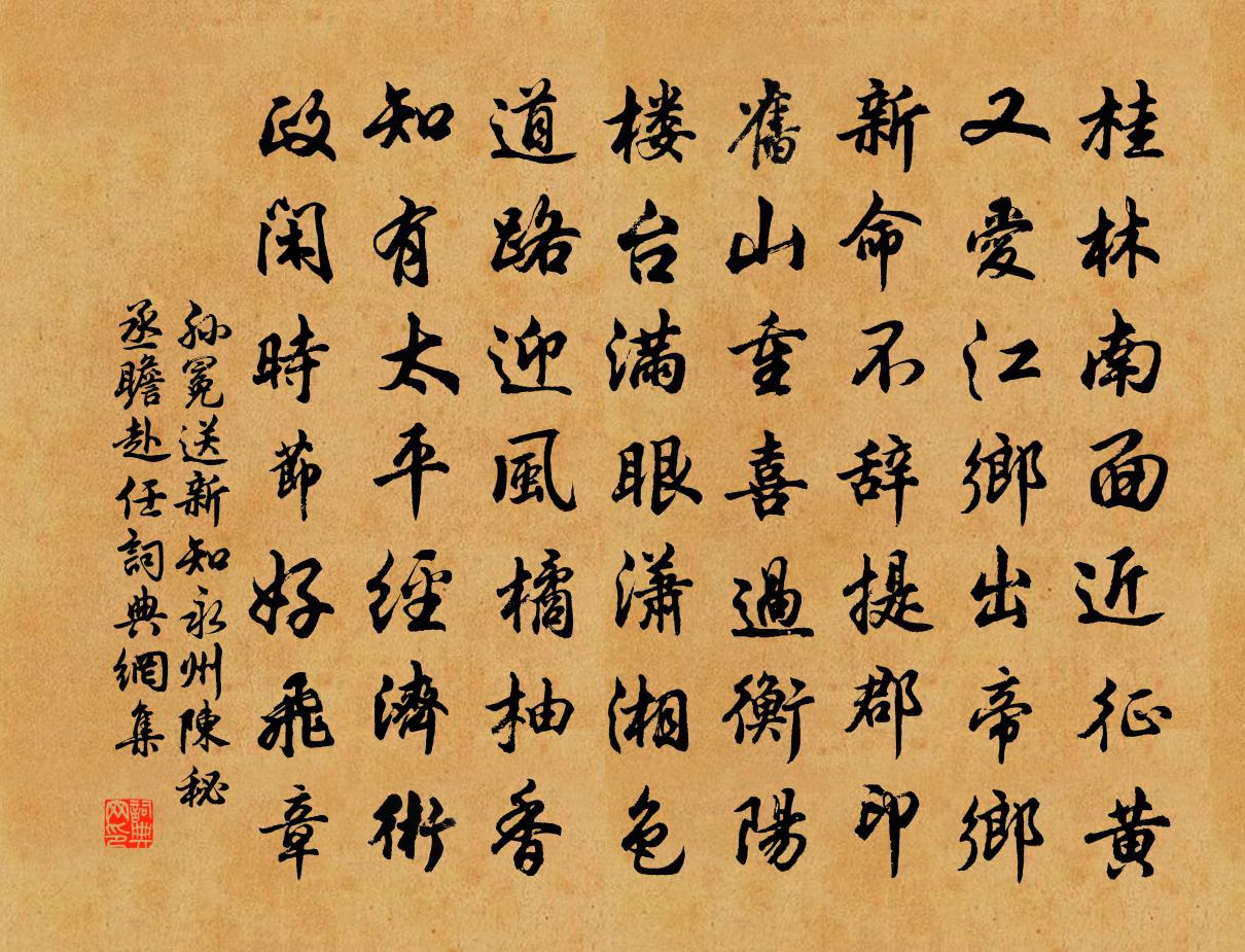 詩詞名句歷史字典書法欣賞書法字典國語詞典說文解字康熙字典古漢語字典標 題 作 者 詩 句 送新知永州陳秘丞瞻赴任作者:孫冕 朝代:宋代送新知永州陳秘丞瞻赴任原文桂林南面近征黃,又愛江鄉出帝鄉。新命不辭提郡印,舊山重喜過衡陽。樓台滿眼瀟湘色,道路迎風橘柚香。知有太平經濟術,政閒時節好飛章。詩詞問答問:送新知永州陳秘丞瞻赴任的作者是誰?答:孫冕問:送新知永州陳秘丞瞻赴任寫於哪個朝代?答:宋代孫冕送新知永州陳秘丞瞻赴任書法欣賞送新知永州陳秘丞瞻赴任書法作品詩詞推薦虞美人胡文卿〔宋代〕樞庭喜慶生辰到。仙伯離蓬島。魯台雲物正呈祥。線繡工夫從此、日添長。滿斟綠醑深深勸。歲歲長相見。蟠桃結江下送客楊萬里〔宋代〕卻因送客動歸心,過市逢喧悶不禁。偶見人家好池館,柳行盡處一亭深。天馬引吳泳〔宋代〕隴古之野龍駒驤,追風脅月坤為裳。竚雲亭亭廣顙直,夾鏡炯炯雙瞳光。飯以玉山禾,飲以瑤池漿。自成骨格異赭子上持豫章畫扇,其上牡丹三株,黃白相間盛楊萬里〔宋代〕暄風暖景政春遲,開盡好花人未知。輪與狸奴得春色,牡丹香里弄雙兒。依韻和王安之卿六老詩仍見率成七邵雍〔宋代〕六老皤然鬢似霜,縱心年至又非狂。園池共避何妨勝,樽俎相歡未始忙。杖履爛游千載運,衣巾濃惹萬花香。過從秋色吳融〔唐代〕染不成乾畫未銷,霏霏拂拂又迢迢。曾從建業城邊路,蔓草寒煙鎖六朝。用晦翁十梅詩韻酬張伯修孫子直吳泳〔宋代〕聖涯浩無邊,人乃揭其淺。安知舍瑟中,道味益深遠。疏山問竹釋道璨〔宋代〕坐對青青仔細看,別來且喜尚平安。山中歲晚風霜惡,不易孤標耐得寒。春情二首楊維楨〔元代〕惜春正是上春時,何處春情可賦詩。吳王台下斗芳草,蘇小門前歌柳枝。灼灼桃花朱戶底,青青梅子粉牆頭。蹋歌故人陳秘書家有感戴復古〔宋代〕晚春風雨後,花絮落無聲。綠泛新荷出,青鋪細草生。私蛙為誰噪,老犬伴人行。舊日狂賓客,樽前笑不成。移菊張弋〔宋代〕秋風籬落遠,晨起自移栽。稍覺微根損,須遲數日開。最清人愛重,乍見蝶疑猜。昔有陶元亮,因茲歸去來。正月四日到張車偶成陳著〔宋代〕暗行半日到張車,石路崎嶇趁水斜。一窟山中成草市,數株松下見梅花。居民盡老他無事,就土為生自有涯。誰料送杜十四之江南 / 送杜晃進士之東吳孟浩然〔唐代〕荊吳相接水為鄉,君去春江正淼茫。(淼茫 同:渺)日暮征帆何處泊,天涯一望斷人腸。句劉筠〔宋代〕沙禽兩兩穿鈴閣,江草依依接射堂。菩薩蠻(中秋不見月)姜特立〔宋代〕鏡天良月皆佳節。休恨今宵妨皎潔。玉鎖悶蟾宮。姮娥意自通。終有開時節。莫放笙歌歇。來夕尚嬋娟。何妨把酒陳子厚送韶鴨將以七絕因次其韻吳芾〔宋代〕朝朝兩兩下平沙,添得湖中景趣嘉。碧卵從今生育去,便堪裝點作漁家。中書舍人李座上送潁陽徐少府盧綸〔唐代〕潁陽春色似河陽,一望繁花一縣香。今日送官君最恨,可憐才子白須長。水竹野十詠賞心橋葉茵〔宋代〕沿堤過竹所,履聲驚龜魚。人生適意耳,何必駟馬車。東坡先生真贊三首黃庭堅〔宋代〕子瞻堂堂,出於峨眉,司馬班揚。金馬石渠,閱士如牆。上前論事,釋之馮唐。言語以為階,而投諸雲夢之黃。東擬古鮑照〔南北朝〕幽并重騎射,少年好馳逐。氈帶佩雙鞬,象弧插雕服。獸肥春草短,飛鞚越平陸。朝游雁門上,暮還樓煩宿。石樑名句推薦枯楊枯楊爾生稊,我獨七十而孤棲。李白《雉朝飛》 漠漠梨花爛漫,紛紛柳絮飛殘。陳允平《紅林擒近·壽詞·滿路花》 一日不思量,也攢眉千度。柳永《晝夜樂·洞房記得初相遇》 桃花一簇開無主,可愛深紅愛淺紅?杜甫《江畔獨步尋花·其五》 朝來入庭樹,孤客最先聞。劉禹錫《秋風引》 冀枝葉之峻茂兮,願俟時乎吾將刈。屈原《離騷》 國危主憂,說者成伍,無益於安危也。商鞅《商君書·農戰》 終罷斯結廬,慕陶直可庶。韋應物《東郊》 床空委清塵,室虛來悲風。潘安《悼亡詩三首》 剩水殘山無態度,被疏梅料理成風月。辛棄疾《賀新郎·把酒長亭說》