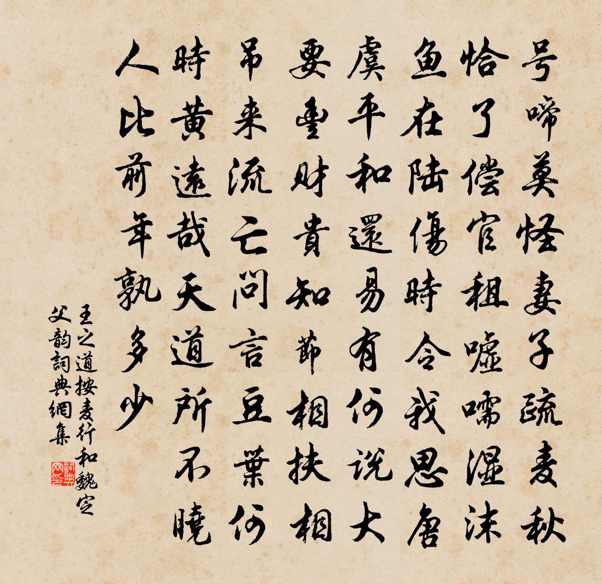 詩詞名句歷史字典書法欣賞書法字典國語詞典說文解字康熙字典古漢語字典標 題 作 者 詩 句 按麥行和魏定父韻作者:王之道 朝代:宋代按麥行和魏定父韻原文號啼莫怪妻子疏,麥秋恰了償官租。噓嚅濕沫魚在陸,傷時令我思唐虞。平和還易有何說,大要豐財貴知節。相扶相吊來流亡,問言豆葉何時黃。遠哉天道所不曉,人比前年孰多少。詩詞問答問:按麥行和魏定父韻的作者是誰?答:王之道問:按麥行和魏定父韻寫於哪個朝代?答:宋代王之道按麥行和魏定父韻書法欣賞按麥行和魏定父韻書法作品詩詞推薦送梁和仲兼屬寄謝吳丈三首趙蕃〔宋代〕不但言歸自乞歸,使家幕府兩相違。換官雖用朝廷法,竊議難逃世俗譏。適我慍於心悄悄,送君往矣柳依依。若見丹丘春夜感懷釋寶曇〔宋代〕雨歇花梢月正明,一川渾是杜鵑聲。此身漂泊知何處,蝶與莊周夢不成。初歸鹹寧宅坐北齋作二首宋庠〔宋代〕宴坐聊為適性場,遍開塵篋治縑緗。偷閒須撰齋中錄,道帙儒經各有房。減字木蘭花歐陽修〔宋代〕留春不住。燕老鶯慵無覓處。說似殘春。一老應無卻少人。風和月好。辦得黃金須買笑。愛惜芳時。莫待無花空折新渠詩蘇軾〔宋代〕新渠之水,其來舒舒。溢流於野,至於通衢。渠成如神,民始不知。問誰為之?邦君趙侯。新渠之田,在渠左右。春風鄭剛中〔宋代〕劉郎桃樹欲撓春,一夜飄零最惱人。不似窮秋作霜露,摧殘蒲柳有誰嗔。題大圓庵李復〔宋代〕星郎步履在清禪,雅結新庵賦大圓。譬喻河沙終未盡,含弘法界外無邊。渾成獨轉離諸相,不立中間絕兩偏。聞說蝶戀花晏幾道〔宋代〕碧玉高樓臨水住,紅杏開時,花底曾相遇。—曲陽春春已暮,曉鶯聲斷朝雲去。遠水來從樓下路,過盡流波,未得謝西台張元伯雪中送詩邵雍〔宋代〕洛城雪片大如手,爐中無火樽無酒。凌晨有人來打門,言送西台詩一首。奉挽近故太夫人史氏二首度正〔宋代〕有子來為牧,孜孜奉母慈。涵濡千里澗,雍睦一家推。壽考國人願,循良聖主知。詔書催令伯,嘆息想遺規。呈陳和叔二首王安石〔宋代〕數椽庳屋茨生草,三畝荒園種晚蔬。永日終無一杯酒,可能留得故人車。已亥雜詩 121龔自珍〔清代〕荒青無縫種交加,月費牛溲定幾車。只是場師消遣法,不求秋實不看花。雲州秋望屈大均〔清代〕白草黃羊外,空聞觱篥哀。遙尋蘇武廟,不上李陵台。風助群鷹擊,雲隨萬馬來。關前無數柳,一夜落龍堆。病後夏初雜書近況十首方回〔宋代〕妙年剛謂世無愁,汗漫猖狂萬里游。夢裡講經天竺國,醉中橫笛岳陽樓。散花女已無蹤矣,老樹精今尚在不。咋舌小池釋行海〔宋代〕白綿飛盡綠絲深,無數魚兒聚藻陰。日夜潺湲聲不斷,分明一片伯牙心。湖州歌九十八首 其三十六汪元量〔宋代〕兩淮極目草芊芊,野渡灰余屋數椽。兵馬渡江人走盡,民船拘斂作官船。奉和聖制答張說扈從南出雀鼠谷宋璟璟〔唐代〕秦地雄西夏,并州近北胡。禹行山啟路,舜在邑為都。忽視寒暄隔,深思險易殊。四時宗伯敘,六義宰臣鋪。征作過象耳山二首薛能〔唐代〕一色青松幾萬栽,異香薰路帶花開。山門欲別心潛願,更到蜀中還到來。到處逢山便欲登,自疑身作住來僧。徒行秋懷四首陳師道〔宋代〕積雨不受暑,既晴還得秋。未免困河魚,寧如喘吳牛。風梧有先聲,巢燕無後留。人生行樂爾,一經今白頭。柳梢青楊無咎〔宋代〕天付風流。相時宜稱,著處清幽。雪月光中,煙溪影里,松竹梢頭。卻憎吹笛高樓。一夜裡、教人鬢秋。不道明朝名句推薦長條短葉翠濛濛,才過西風,又過東風。夏完淳《一剪梅·詠柳》 予獨愛蓮之出淤泥而不染,濯清漣而不妖周敦頤《愛蓮說》 峨嵋山下少人行,旌旗無光日色薄。白居易《長恨歌》 青山橫北郭,白水繞東城李白《送友人》 後不乏人,榮之方久,賢者自苦亦惠嗣。來俊臣《羅織經·固榮卷第六》 雞聲茅店月,人跡板橋霜。溫庭筠《商山早行》 嘆息此人去,蕭條徐泗空李白《經下邳圯橋懷張子房》 聞之而不見,雖博必謬;見之而不知,雖識必妄;知之而不行,雖敦必困。荀子《荀子·儒效》 縱使文章驚海內,紙上蒼生而已。龔自珍《金縷曲·癸酉秋出都述懷有賦》 雪聲偏傍竹,寒夢不離家。戎昱《桂州臘夜》