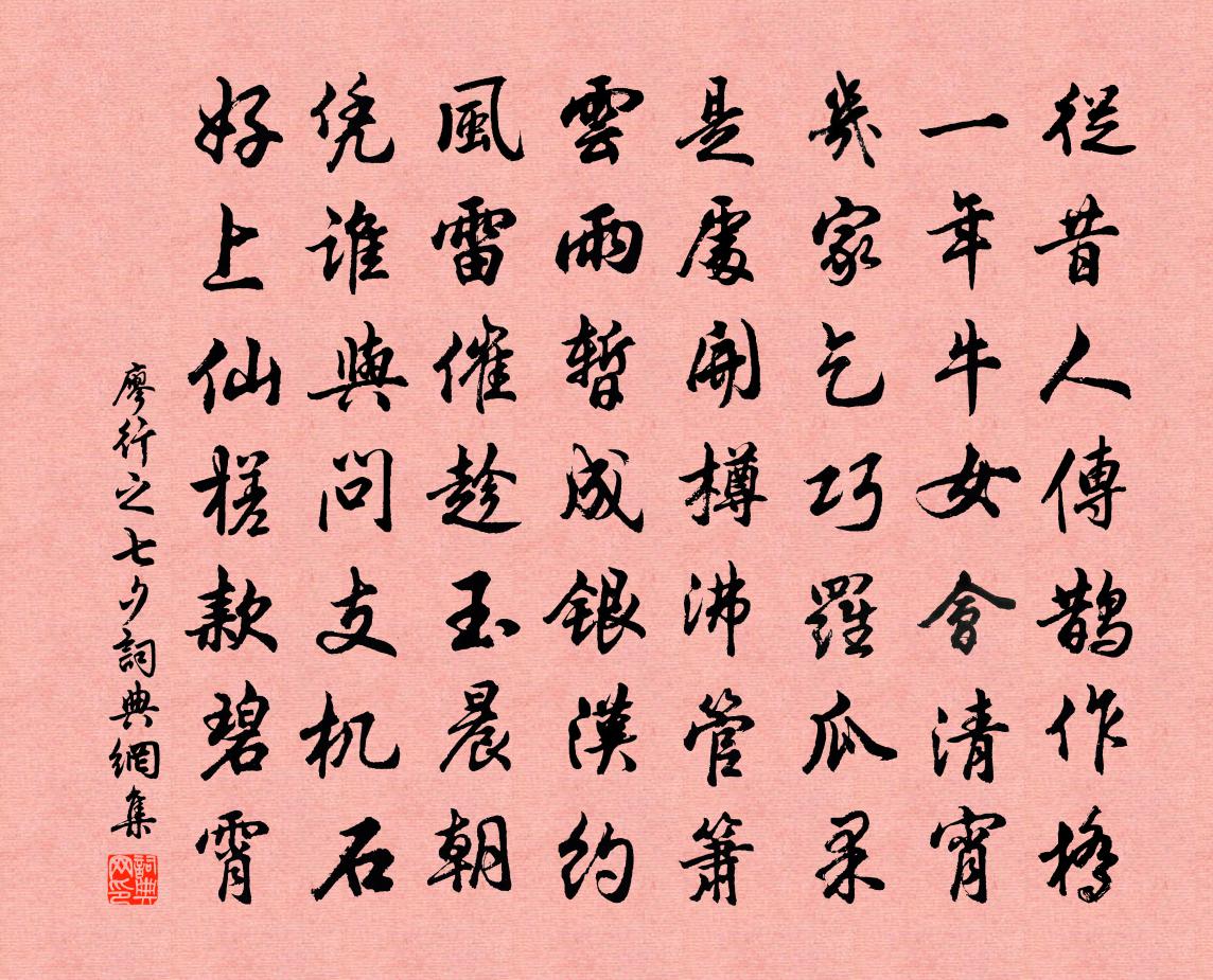 詩詞名句歷史字典書法欣賞書法字典國語詞典說文解字康熙字典古漢語字典標 題 作 者 詩 句 七夕作者:廖行之 朝代:宋代七夕原文從昔人傳鵲作橋,一年牛女會清宵。幾家乞巧羅瓜果,是處開樽沸管簫。雲雨暫成銀漢約,風雷催趁玉晨朝。憑誰與問支機石,好上仙槎款碧霄。詩詞問答問:七夕的作者是誰?答:廖行之問:七夕寫於哪個朝代?答:宋代廖行之七夕書法欣賞七夕書法作品詩詞推薦送高麗二僧南遊齊己〔唐代〕日邊鄉井別年深,中國靈蹤欲遍尋。何處碧山逢長老,分明認取祖師心。沁園春佚名〔宋代〕學富總龜,英蜚漕鶚,正當少年。向山陰發軔,從容蓮幕,結知當路,翠剡爭先。萬斛龍驤,湖襄飛餉,賞秩新綸雪中有戲華岳〔宋代〕一夜風神揭海神,盡將純素掩丹青。四圍白壁成千嶂,萬里紅塵沒一星。搭岸柳條橫玉帶,壓牆梅萼上銀屏。好將奉和族祖紫嚴翁謾興十首汪炎昶〔宋代〕兀兀守陋說,依依望奇功。適幫轍東首,欲至當何從。為謀止一身,茫然發捕風。次韻蘇巨卿於石〔宋代〕誰叩柴門寄我詩,迎門稚子候予歸。青山喚醒十年夢,明月空懷千里思。今晉古秦天地隔,范雎張祿姓名非。人生送韋司馬別何遜〔南北朝〕送別臨曲渚,征人慕前侶。離言雖欲繁,離思終無緒。憫憫分手畢,蕭蕭行帆舉。舉帆越中流,望別上高樓。予起再韻謝張持甫過訪二首劉宰〔宋代〕道自周衰說異同,眼明伊洛振遺風。過人高行非難事,入聖微言本大公。道在鬼神常共在,術窮天地本無窮。三才清心鏡馬鈺〔元代〕養家人,無個省。各炫惺惺,慳貪鄙吝。天來大、割捨驚人,敢不惜性命。這性命。於身緊。一息不來,身為土糞自宣城赴官上京杜牧〔唐代〕瀟灑江湖十過秋,酒杯無日不遲留。謝公城畔溪驚夢,蘇小門前柳拂頭。千里雲山何處好?幾人襟韻一生休?塵冠次程直學對鏡楊公遠〔宋代〕青銅頻啟看,瘦劣沈東陽。鬢染秋霜色,身期晚節香。閒情耽水石,幽夢繞池塘。何似伊川脈,淵源道味長。和聖俞詠昌言五物白鶻圖司馬光〔宋代〕白鶻日邊來,一息萬里遙。橫飛碧海晴,六翮寒蕭蕭。輕如朔雪花,迥與長風飄。傾身疊紺爪,吟嘯何曉哮。瞥來臨江仙(呈祖禹十六叔)晁補之〔宋代〕盡說彭門新半㓨,昆吾剸玉如泥。功名餘事不須為。才情詩里見,風味酒邊知。好在阿鹹同老也,青雲往歲心期。思堂詩曾豐〔宋代〕新築謀為老者安,落成誰料莫近軒。月窺窗牖如顏色,風戰簾帷若笑言。懷裡寂寥霜後橘,階前蕭瑟雨余萱。榮途減字木蘭花(用舊韻戲吳奉議)舒亶〔宋代〕眉山斂額。往事追思空手拍。雁字頻飛。生怕人來說著伊。閒拋繡履。愁殢香衾渾不起。莫似揚州。只作尋常薄倖漢州房公湖孫應時〔宋代〕陰陰老木匝平湖,想見房公用意初。眼底園池那有此,胸中丘壑故須渠。風流正自能傳世,成敗應難盡信書。萬里初二日復雨偶成趙蕃〔宋代〕秋旱連冬勢未平,何斯小雨趁元正。休論忽忽生為樂,且對欣欣木向榮。已分終身樂貧賤,自無岐路覓功名。獨於蝶戀花吳潛〔宋代〕客枕夢回聞二鼓。冷落青燈,點滴空階雨。一寸愁腸千萬縷。更聽切切寒蛩語。世事翻來還復去。造物兒戲,自古大觀祀社稷九首佚名〔宋代〕尊疊芬香,威備肅雍。靈心嘉止,洋洋交通。神歸降禧,年斯屢豈。倉箱千萬,慰予三農。句鄭文寶〔宋代〕越絕曉殘蝴蝶夢,單于秋引畫龍聲。江城口號二首董嗣杲〔宋代〕定江軍門擁雲氣,廬山面目長相朝。閫臣所持止一恕,牆壁何恨粘歌謠。名句推薦紫菊宜新壽,丹萸辟舊邪。趙彥昭《奉和九日幸臨渭亭登高應制》 一聲何滿子,雙淚落君前。張祜《宮詞·故國三千里》 行人無限秋風思,隔水青山似故鄉。戴叔倫《題稚川山水》 香霧雲鬟濕,清輝玉臂寒。杜甫《月夜》 同來望月人何處?風景依稀似去年。趙嘏《江樓舊感 / 江樓感舊》 上邪,我欲與君相知,長命無絕衰。佚名《上邪》 繁飾有命,以教眾愚朴之人。墨子《墨子·36章 非命(中)》 不躓于山,而躓於垤。韓非及後人《韓非子·六反》 柳絲長,春雨細,花外漏聲迢遞。溫庭筠《更漏子·柳絲長》 日暮秋煙起,蕭蕭楓樹林。戴叔倫《過三閭廟》