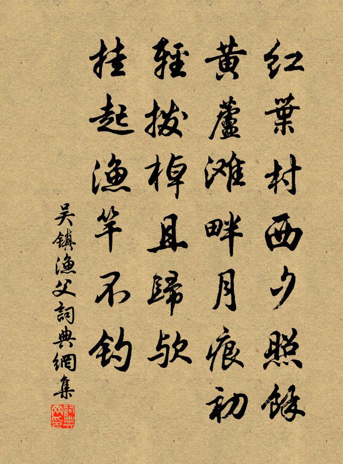 詩詞名句歷史字典書法欣賞書法字典國語詞典說文解字康熙字典古漢語字典標 題 作 者 詩 句 漁父作者:吳鎮 朝代:元代漁父原文紅葉村西夕照餘。黃蘆灘畔月痕初。輕撥棹,且歸歟。掛起漁竿不釣詩詞問答問:漁父的作者是誰?答:吳鎮問:漁父寫於哪個朝代?答:元代問:漁父是什麼體裁?答:詞吳鎮漁父書法欣賞漁父書法作品詩詞推薦王御史野塘圖歌方回〔宋代〕野塘之水兮其色油油,以畜以泄兮灌我良疇。弋有鳧雁兮盟有鷗,我出而仕兮可則進,脫如不可兮還我鋤耰。水之雪韓維〔宋代〕屏翳驅雲結夜陰,素華飄墮惡氛沈。色欺曹國 * 淺,寒入荊王翠被深。天上明河銀作水,海中仙樹玉成林。日高春詠俞桂〔宋代〕盡日看詩只掩扉,出門細雨怕沾衣。杏花已露胭脂色。燕子如何卻未歸。題雙峰顯祖院張伯常〔宋代〕暖脈勻青地上苔,拂塵題柱記花開。海風一夜吹山雨,卻送春寒入寺來。題梁任父同年黃遵憲〔清代〕寸寸山河寸寸金,瓜離分裂力誰任。杜鵑再拜憂天淚,精衛無窮填海心。蝶張明中〔宋代〕攬得風光忘卻愁,千葩萬蕊恣追游。香須點染黃金濕,小翅輕翻白玉柔。舞態恨渠春晝短,狂情不管好花羞。膩酥謝王耿太博惠藤床王虞部惠藤枕魏野〔宋代〕藤床藤枕睡騰騰,軟勝眠莎與曲肱。知似邊韶偏寄惠,夢中長亦感心朋。無題楊冠卿〔宋代〕鶯語丁寧隔曉窗,露翻紅藥斗新妝。玉笙莫作相思調,猶恐春歸得見郎。古松感興皇甫松〔唐代〕皇天后土力,使我向此生。貴賤不我均,若為天地情。我家世道德,旨意匡文明。家集四百卷,獨立天地經。寄言張丞見和次韻答之陳造〔宋代〕張東舊莫逆,雅趣瑟和琴。器用異所宜,渠觀與山林。朝來覽鏡笑,鬢雪無可侵。但辦摩衰眼,送君立班心。詠以人與天地萬物為一體刻印章詩徐元傑〔宋代〕三才中立囿形均,昧者拘拘利乃身。不道有身皆有血,豈應知我不知人。其間一物容虧性,是即四肢頑不仁。洞洞栽梅郭印〔宋代〕平生不愛花,獨喜雪中梅。江皋無人問,移近小亭栽。連朝勤培溉,的皪犯寒開。青枝綴瓊粒,絳萼扶冰腮。奇哉老而健貧而詩自志其喜八首方回〔宋代〕老翁處處有,不健復何為。貧戶家家是,能詩始足奇。東坡捐玉帶,白傅放楊枝。新有僧相識,時來說易詩。花庵二首司馬光〔宋代〕誰謂花庵小,纏容三兩人。君看賓寬上,經月有凝塵。送范中發知蘄州孔武仲〔宋代〕漢南行樂不可復,殿中立班時會君。華省方看列宿貴,名州欻見左符分。飄蓬聚散古難必,塞馬去來烏足雲。出處越州張中舍壽樂堂蘇軾〔宋代〕青山偃蹇如高人,常時不肯入官府。高人自與山有素,不待招邀滿庭戶。臥龍蟠屈半東州,萬室鱗鱗枕其股。背之別友釋文珦〔宋代〕十年蹤跡與君同,今日魂銷執手中。自是交深難話別,不關秋雨又秋風。和虞守釣台四首姜特立〔宋代〕龍袞羊裘孰重輕,當時俱是一書生。相忘道術仍忘勢,超出人間萬古情。過旁羅見靈山趙蕃〔宋代〕過得旁羅上下灘,望中青出是靈山。三年此地四來往,老矣向渠成厚顏。過曹娥廟黃庚〔宋代〕細雨滿山眉黛斂,怒濤千古哭聲寒。須知此廟關風教,莫作尋常神女看。名句推薦不忍覆余觴,臨風淚數行納蘭性德《菩薩蠻·催花未歇花奴鼓》 乘興南遊不戒嚴,九重誰省諫書函。李商隱《隋宮》 不知何處火,來就客心然。沈佺期《寒食》 傷情處,高城望斷,燈火已黃昏。秦觀《滿庭芳·山抹微雲》 其出不出,間不容髮。班固《漢書·傳·賈鄒枚路傳》 腸已斷,淚難收。相思重上小紅樓。辛棄疾《鷓鴣天·晚日寒鴉一片愁》 東武望餘杭,雲海天涯兩渺茫。蘇軾《南鄉子·和楊元素時移守密州》 嗟萬事難忘,惟是輕別。周邦彥《浪淘沙慢·曉陰重》 故人應念,杜鵑枝上殘月。文天祥《酹江月·和友驛中言別》 君子恥其言而過其行。孔子弟子《論語·憲問篇》