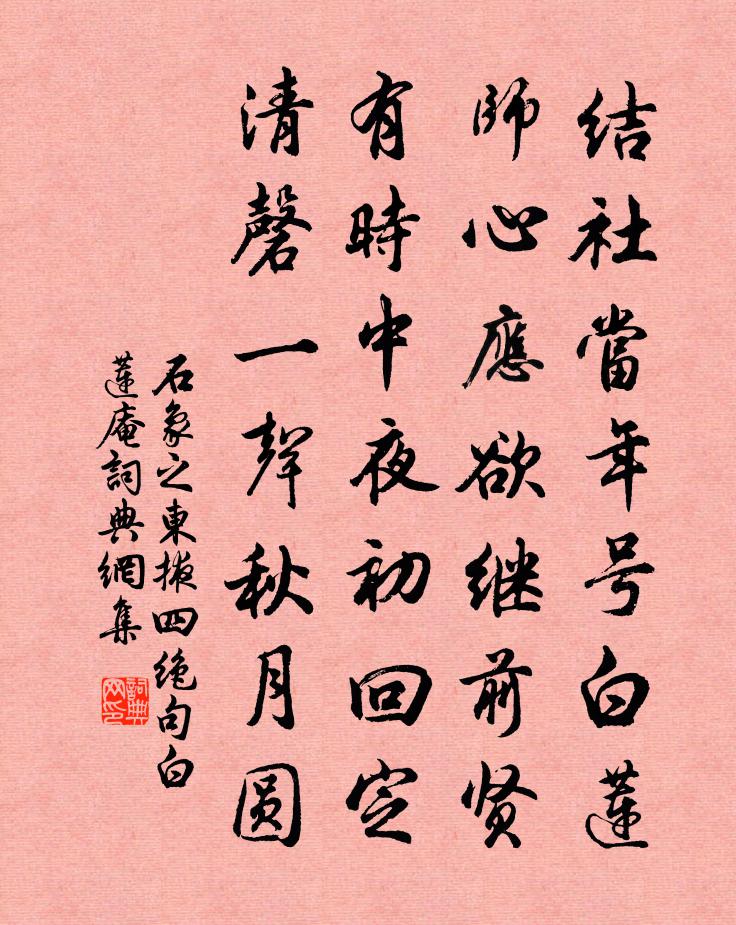 詩詞名句歷史字典書法欣賞書法字典國語詞典說文解字康熙字典古漢語字典標 題 作 者 詩 句 東掖四絕句白蓮庵作者:石象之 朝代:宋代東掖四絕句白蓮庵原文結社當年號白蓮,師心應欲繼前賢。有時中夜初回定,清磬一聲秋月圓。詩詞問答問:東掖四絕句白蓮庵的作者是誰?答:石象之問:東掖四絕句白蓮庵寫於哪個朝代?答:宋代問:東掖四絕句白蓮庵是什麼體裁?答:七絕石象之東掖四絕句白蓮庵書法欣賞東掖四絕句白蓮庵書法作品詩詞推薦池上鷺分賦得明字釋惠崇〔宋代〕雨絕方塘溢,遲徊不復驚。曝翎沙日暖,引步島風清。照水千尋迥,棲煙一點明。主人池上鳳,見爾憶蓬瀛。宮詞一百首岳珂〔宋代〕仙源瓜瓞慶綿綿,玉葉金枝億萬年。天意睦親流聖澤,已增宮院講書員。肩吾生日魏了翁〔宋代〕余晦越鄉別臨賀,郭君出竟送荊州。放麑心事人誇說,得似如今累歲留。袁州慶豐堂十閒詠祖無擇〔宋代〕雨霽輕埃息,閒吟面曲池。游鱗時對擲,雙破碧漣漪。中秋夜客退觀月謾成杜范〔宋代〕檻外不數丈,深窅藏丘壑。璧月懸中天,玉露下叢薄。尺水澄秋光,龜魚共予樂。所樂亦伊何,飲水良自覺。恍若挽惠安林丞劉克莊〔宋代〕策名迫榆景,謝病去松廳。博取儒先說,尤深道德經。族通艾軒譜,葬得竹溪銘。愁絕蟆陵路,哀笳不忍聽。題譙國評事壁蔡襄〔宋代〕長岡隆雄來北邊,勢到合下方迴旋。三世白士猶醉眠,山翁作善天應憐。如彼發源今流泉,子孫何數鷹馬然。有起昌言有詠石發詩三章模寫精楷難復加仆雖未睹司馬光〔宋代〕萬古風濤浸石岩,老苔垂足細{髻吉換監}鬖。傳聞海底珠無數,何事從來散不簪。戒言陸游〔宋代〕饒舌憂患始,銘膺勤戒深。談空摩詰默,對酒子光瘖。久已忘齊語,何嘗解越吟。悠然嫌未足,更撫絕弦琴。挽陳惠倅劉克莊〔宋代〕昔預八仙飲,深知七子才。云何埋玉樹,不復倒金罍。錦制曾三試,羅浮欠一來。吾衰慚誄筆,搔首寄餘哀。墨梅張嵲〔宋代〕山邊幽谷水邊村,曾被疏花斷客魂。猶恨東風無意思,更吹煙雨暗黃昏。宮詞王珪〔唐代〕金作盤龍繡作鱗,壺冰樓閣禁中春。君王避暑來游幸,風月橫秋氣象新。度峽口山贈喬補闕知之王二無競陳子昂〔唐代〕峽口大漠南,橫絕界中國。叢石何紛糾,赤山復翕赩。遠望多眾容,逼之無異色。崔崒乍孤斷,逶迤屢回直。信關玉華洞戴復古〔宋代〕憶昨游桂林,岩洞甲天下。奇奇怪怪生,妙不可模寫。玉華東西岩,具體而微者。神功巧穿鑿,石壁生孔罅。玲瓏御街行(聖壽·二之一·雙調)柳永〔宋代〕燔柴煙斷星河曙。寶輦回天步。端門羽衛簇雕闌,六樂舜韶先舉。鶴書飛下,雞竿高聳,恩霈均寰寓。赤霜袍爛飄風入松 詠俞紹庵秋蟾台沈禧〔元代〕層台高築勢嶄岩。迢遞隔閭閻。不將貯彼狂歌舞,深秋夜、登玩銀蟾。為愛一輪光皎,又看孤影廉纖。桂花香里□伯量同二弟欲見訪湖莊以詩告至褒拂過情輒次曹彥約〔宋代〕清江一曲界間關,倚作琴聲上下灘。鵲報主人知有喜,惠然金玉總稱難。栽松峴馬之純〔宋代〕鐘山山上亦僮僮,吏課何妨使種松。還似農桑分殿最,亦如榆柳計功庸。初時出土平如薺,後日橫空矯似龍。每見范良臣見過雲有食粥之憂以斛米助之因得長句韓元吉〔宋代〕捄飢豈復衛文子,闕食尚憐顏魯公。定知啜粥可餬口,未至復疾號山芎。東方千牘羨飽死,顏氏一瓢嗟屢空。我家梅花絕句陸游〔宋代〕小亭終日倚闌乾,樹樹梅花看到殘。只怪此翁常謝客,元來不是怕春寒。名句推薦且就洞庭賒月色,將船買酒白雲邊。李白《游洞庭湖五首·其二》 紅葉晚蕭蕭,長亭酒一瓢。許渾《秋日赴闕題潼關驛樓 / 行次潼關逢魏扶東歸》 已恨碧山相阻隔,碧山還被暮雲遮。李覯《鄉思》 氣軟來風易,枝繁度鳥遲。李爽《芳樹》 對酒當歌,強樂還無味。柳永《蝶戀花·佇倚危樓風細細》 昔年多病厭芳尊,今日芳尊惟恐淺。錢惟演《木蘭花·城上風光鶯語亂》 春風試手先梅蕊,頩姿冷艷明沙水。趙令畤《菩薩蠻·春風試手先梅蕊》 一顧傾人城,再顧傾人國。李延年《李延年歌》 羈旅長堪醉,相留畏曉鍾。戴叔倫《客夜與故人偶集 / 江鄉故人偶集客舍》 春愁凝思結眉心,綠綺懶調紅錦薦。顧敻《玉樓春·拂水雙飛來去燕》