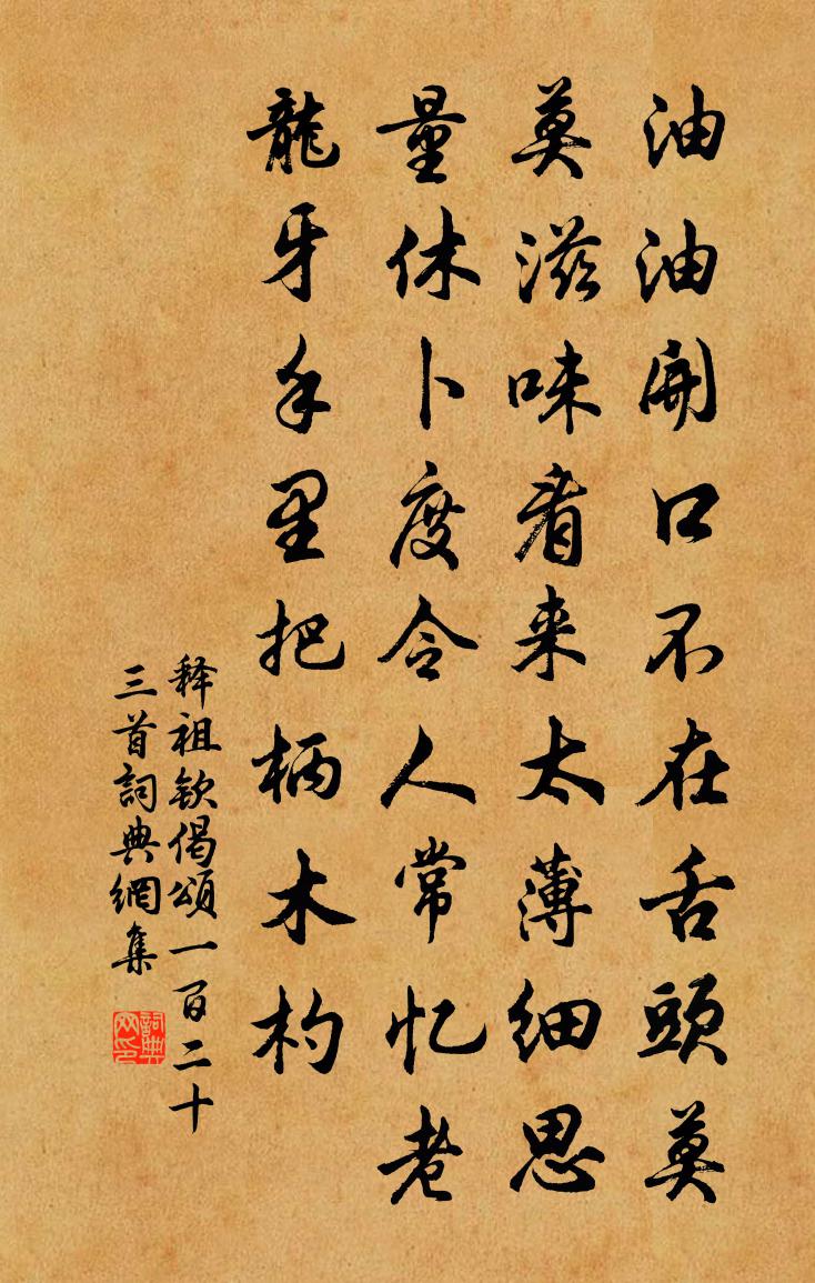 詩詞名句歷史字典書法欣賞書法字典國語詞典說文解字康熙字典古漢語字典標 題 作 者 詩 句 偈頌一百二十三首作者:釋祖欽 朝代:宋代偈頌一百二十三首原文油油,開口不在舌頭。莫莫,滋味看來太薄。細思量,休卜度。令人常憶老龍牙,手裡把柄木杓。詩詞問答問:偈頌一百二十三首的作者是誰?答:釋祖欽問:偈頌一百二十三首寫於哪個朝代?答:宋代釋祖欽偈頌一百二十三首書法欣賞偈頌一百二十三首書法作品詩詞推薦和子瞻次韻陶淵明勸農詩蘇轍〔宋代〕我歸無時,視汝長久。孰為沮溺,風雨相耦。築室車皋,取足南畝。后稷為烈,夫豈一手。句宋高宗〔宋代〕池上疏煙籠翡翠,水邊遲日戲蜻蜓。謝童帥乾送滴酥陳元晉〔宋代〕滴成詩句巧相粘,料得堂深凍未忺。剪水染雲天上手,何因得見玉織織。示至侍首釋如珙〔宋代〕我宗無語亦無法,獼猴各佩古菱花。昏衢燭破無今古,大地眾生盡到家。醜奴兒(次韻何文成燈下鏡中桃花)石孝友〔宋代〕菱花鏡里桃花笑,清影團團。月淡風寒。深夜移燈許細觀。武陵溪上當時事,何處飛鸞。淚紙驚瀾。飄盡紅英不忍歸渡洛水皇甫冉〔唐代〕暝色赴春愁,歸人南渡頭。渚煙空翠合,灘月碎光流。澧浦饒芳草,滄浪有釣舟。誰知放歌客,此意正悠悠。又和饒計使丹青閣韻趙汝騰〔宋代〕久聞傑閣原今酬,亭午登臨到上頭。二水清澄新雨霽,眾峰蒼峭凍雲留。擬賡場圃詩人句,休負煙波墨客愁。信使和中玉使君晚秋開天寧節道場黃庭堅〔宋代〕江南江北盡雲沙,車騎東來風旆斜。倒影樓台開紫府,得霜籬落剩黃花。釣溪築野收多士,航海梯山共一家。想見龍巖山周明仲〔宋代〕靈河直欲貫蒼崖,神力摩挲石島開。冰玉滿懷雲滿袂,分明天上泛槎來。同德麟仲寶過謝公定酌酒賞菊以悲哉秋之為氣李廌〔宋代〕青松多陳根,女桑漫柔枝。虛心任寒暑,寧與鐵炭期。旨酒有妙致,青山多令姿。醉游臥丘壑,於予復何為。以玉蘭贈王習父樓鑰〔宋代〕一種香蘭玉色新,仙家分得蘂宮春。調高韻勝誰能稱,付與能言解語人。靧櫛張鎡〔宋代〕澡灌新宜白氈巾,睡余臞面滌昏塵。三薰衣潤乘沉麝,一沃湯柔和芷辛。衰發任從清鏡脫,壯心不逐故書陳。清平和黃司業喜雪陸九淵〔宋代〕疇昔詩囊未破慳,瓊瑰益自倍枵然。才華甘落諸公後,誠實徒居野老前。臘寺晚成春雪早,梅花靜對雪花妍。從今憶秦娥陸游〔宋代〕玉花驄。晚街金轡聲璁瓏。聲璁瓏。閒敧烏帽,又過城東。富春巷陌花重重。千金沽酒酬春風。酬春風。笙歌圍里題逃戶薛能〔唐代〕幾界瞢農桑,凶年竟失鄉。朽關生濕菌,傾屋照斜陽。雨水淹殘臼,葵花壓倒牆。明時豈致此,應自負蒼蒼。李侯 其二王冕〔元代〕李君瀟灑姿,淪落在羈旅。相見無長言,潸然淚如雨。一身顧何為?七喪未能舉。江山隔中州,遙遙望鄉土。豈以留題浯溪盧察〔宋代〕口後聲名人始貴,真卿筆札次山文。二賢若使生同世,□□口悲不放君。閩中早春張嵲〔宋代〕愁見繁雲貼死灰,驟喜春從天際回。晴雲流爛滿峰起,瀲灩陂塘泉脈來。春歸欲驗將何許,柳腰杏頰知春處。出門雨雪放朝因懷微之白居易〔唐代〕歸騎紛紛滿九衢,放朝三日為泥塗。不知雨雪江陵府,今日排衙得免無?韶州留別張端公使君(時憲宗元和十四年十月)韓愈〔唐代〕來往再逢梅柳新,別離一醉綺羅春。久欽江總文才妙,自嘆虞翻骨相屯。鳴笛急吹爭落日,清歌緩送款行人。已知名句推薦非知之難也,處知則難也。韓非及後人《韓非子·說難》 上無威,下生亂。來俊臣《羅織經·治下卷第三》 外內表里,自相副稱。王充《論衡·卷十三·超奇篇》 錦江近西煙水綠,新雨山頭荔枝熟。張籍《成都曲》 滿月飛明鏡,歸心折大刀。杜甫《八月十五夜月二首》 尺蠖之屈,以求信也;龍蛇之蟄,以存身也。佚名《易傳·繫辭傳下·第五章》 教也者,長善而救其失者也。戴聖《禮記·學記》 竹邊荷外再相逢,又還是、浮雲飛去。趙以夫《鵲橋仙·富沙七夕為友人賦》 成大功者不小苛。劉向《說苑·政理》 但恨處非位,愴悢使心傷。阮籍《詠懷八十二首·其七十九》