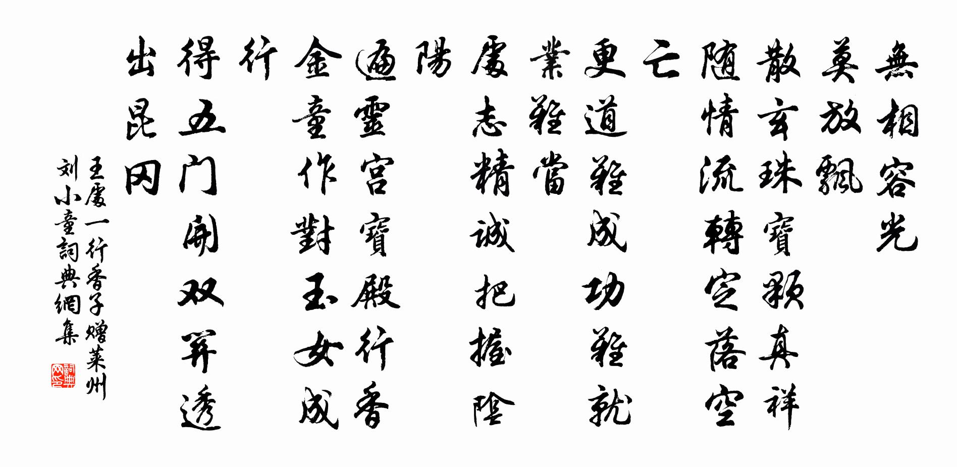 詩詞名句歷史字典書法欣賞書法字典國語詞典說文解字康熙字典古漢語字典標 題 作 者 詩 句 行香子 贈萊州劉小童作者:王處一 朝代:元代行香子 贈萊州劉小童原文無相容光。莫放飄。散玄珠、寶顆真祥。隨情流轉,定落空亡。更道難成,功難就,業難當。處志精誠,把握陰陽。遍靈宮、寶殿行香。金童作對,玉女成行。得五門開,雙關透,出崑岡。詩詞問答問:行香子 贈萊州劉小童的作者是誰?答:王處一問:行香子 贈萊州劉小童寫於哪個朝代?答:元代問:行香子 贈萊州劉小童是什麼體裁?答:詞王處一行香子 贈萊州劉小童書法欣賞行香子 贈萊州劉小童書法作品詩詞推薦口號十首呈程殿撰陳造〔宋代〕歡意長隨夜漏長,隆寬盡貸酒邊狂。東歸只有南窗夢,夜夜掀髯錦瑟傍。新治北窗和何從事詩謝朓〔南北朝〕國小暇日多。民淳紛務屏。辟牖期清曠。開簾候風景。泱泱日照溪。團團雲去嶺。岧嶤蘭橑峻。駢闐石路整。池北自桃川至辰州絕句四十有二趙蕃〔宋代〕雨墮初看珠顆圓,風來忽散縠絲牽。青山四合江如瀉,憶著桐江江上船。雨花台馬之純〔宋代〕居士室中天女現,生公台上雨華懸。只因妙語傾人聽,非有真花墮我前。卻似文章稱錦麗,亦如咳唾說珠圓。不知留別江陵王少府張籍〔唐代〕迢迢山上路,病客獨行遲。況此分手處,當君失意時。寒林遠路驛,晚燒過荒陂。別後空回首,相逢未有期。頌古二十一首釋鼎需〔宋代〕全鋒敵勝鐵牛機,電掣雷奔已是遲。等閒活捉盧陂老,縱饒猛略若為施。君不見,寰中意氣,閫外威權,擬議沖前歸來 其三王冕〔元代〕小齋塵不到,寂寞野人家。下榻來風韻,看書度歲華。已忘巫峽月,空惜武陵花。欲問并州信,故人天一涯。冬至夜白居易〔唐代〕老去襟懷常濩落,病來須鬢轉蒼浪。心灰不及爐中火,鬢雪多於砌下霜。三峽南賓城最遠,一年冬至夜偏長。今宵峨眉真人陳圖南真贊黃庭堅〔宋代〕一藤出山,來正人紀。見藝祖太宗,曰天下定矣。如月在天,去來無疵。巍巍頎頎,為帝王師。聖哲肺腑,天人眉梅花十絕句趙蕃〔宋代〕江上人家煙雨間,意行曾憶犯榛菅。只今冷落人誰問,輸與白鷗相對閒。滿江紅張輯〔宋代〕落葉自語,大書此句於碧崖丹壑間,以堅歸盟。醉發吹涼,但拂劍、狂歌而已。倩誰問、九霄黃鶴,更曾來未。玉高郵因師薄萄蘆雁秋瓜三種敖陶孫〔宋代〕莫話淒涼塞北秋,銜蘆避弋使人愁。與君細展江南畫,水宿沙眠得自由。送侄孫汝白往東嘉問訊陳叔方諸丈戴復古〔宋代〕子去尋名勝,何慚著布衣。出門知所鄉,在旅亦如歸。道誼無窮達,文章有是非。寄聲陳與趙,相賞莫相違。偶成 其七王冕〔元代〕出門無侶杖藜輕,溪上梅花相笑迎。獨鶴遠從天際下,老夫如在畫中行。千峰日出流雲氣,萬壑松鳴雜水聲。巾袂徐審知置酒會者三人以為此春酒以介眉壽分韻趙蕃〔宋代〕餓死因細腰,半額由廣眉。是知風化速,有類形影移。時人走功名,我輩陳詩書。雖病勿是疚,雖貧勿自悲。浪淘沙·損屋一間兒趙縮手〔宋代〕損屋一間兒。好與支持。休教風雨等閒欺。覓個帶修安穩路,休遣人知。須是著便宜。運轉臨時。祆知險里卻防危送王蒙州王安石〔宋代〕請郡東南促去程,提堤江水照紅旌。仁聲已逐春風到,使節猶占夜斗行。箭落皁鵰毚兔避,句傳炎海鱷魚驚。麒麟雜興十二首方回〔宋代〕請託或有求,攀附謂可羨。不羨復不求,貴公何必見。恥折元亮腰,免向宣明面。江淹所賦恨,未必識馮衍。甘作代壽圓嶠顏文昌胡仲弓〔宋代〕長命新詩恰剪裁,瓣香南望祝蓬萊。千齡椿算從天與,九節蒲根著地栽。范不待年甘引去,文雖告老召還來。肉芝春雨絕句陸游〔宋代〕恰喜西窗晚照明,虛檐又報雨來聲。端憂不用占龜兆,壞盡花時自解晴。名句推薦關河底事空留客?歲月無情不貸人。于謙《立春日感懷》 一年三百六十日,多是橫戈馬上行。戚繼光《馬上作》 飢則附人, 飽便高颺房玄齡《晉書·載記·第二十三章》 靜夜沉沉,浮光靄靄,冷浸溶溶月。丘處機《無俗念·靈虛宮梨花詞》 橫笛驚征雁,嬌歌落塞雲。岑參《奉陪封大夫九日登高》 二月黃鶯飛上林,春城紫禁曉陰陰。錢起《贈闕下裴舍人》 星河秋一雁,砧杵夜千家。韓翃《酬程延秋夜即事見贈》 遲遲鐘鼓初長夜,耿耿星河欲曙天。白居易《長恨歌》 多才之士,才儲八斗;博學之德,學富五車。程登吉《幼學瓊林·卷四·文事》 巴山重疊相逢處。燕子占巢花脫樹。張先《漁家傲·和程公辟贈》