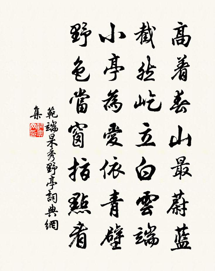 詩詞名句歷史字典書法欣賞書法字典國語詞典說文解字康熙字典古漢語字典標 題 作 者 詩 句 秀野亭作者:范端杲 朝代:宋代秀野亭原文高著春山最蔚藍,截然屹立白雲端。小亭為愛依青壁,野色當窗指點看。詩詞問答問:秀野亭的作者是誰?答:范端杲問:秀野亭寫於哪個朝代?答:宋代范端杲秀野亭書法欣賞秀野亭書法作品詩詞推薦夏雨陸游〔宋代〕東風吹雨溪上來,北山出雲以應之。嚴州城中三日雨,朝暮點滴無休時。向來秧底乾欲裂,白水漫漫俄盈陂。豚肩阮郎歸張掄〔宋代〕炎炎皦日正當中。澄潭忽此逢。金丹乍浴表深功。通明照水紅。丹浴罷,樂無窮。怡然百體融。人間何處不清風。贈同志釋文珦〔宋代〕我本面無生儔,面涉有乖素麵願。百年面直寄耳,倏忽如過電。猶記學語時,老色遽滿面。富貴非所希,吾道在貧寄賈島姚合〔唐代〕疏拙只如此,此身誰與同。高情向酒上,無事在山中。漸老病難理,久貧吟益空。賴君時訪宿,不避北齋風。念奴嬌(二首催雪)朱淑真〔宋代〕冬晴無雪。是天心未肯,化工非拙。不放玉花飛墮地,留在廣寒宮闕。雲欲同時,霰將集處,紅日三竿揭。六花翦清曉升瓊台頂石崖有仙人腳跡高似孫〔宋代〕亂石排天倚嵐壁,苔痕不犯松喬跡。上通群帝集台斗,下鑒十洲通碣石。樹呼清風雜今古,山遺宿潤從開闢。丹翁臨江仙(和毅齊見壽)何夢桂〔宋代〕十月江南風信早,梅枝早D335先春。田園剩得老來身。浪言陶處士,猶是晉朝臣。人道革爻居四九,誰知數在松澤西亭朱繼芳〔宋代〕高人太多事,寒夜本無魚。船子今何許,涇流只似初。白苹秋浩蕩,黃葉晚蕭疎。更有斯亭在,乾坤一草廬。寄題用之太丞真意閣李石〔宋代〕真醫曾活水中龍,三卷奇書玉笈中。酒熟定應登傑閣,與龍對酌海螺紅。送崔叔清游越韋應物〔唐代〕忘茲適越意,愛我郡齋幽。野情豈好謁,詩興一相留。遠水帶寒樹,閶門望去舟。方伯憐文士,無為成滯游。對酒賦(一作贈)友人韋莊〔唐代〕多病仍多感,君心自我心。浮生都是夢,浩嘆不如吟。白雪篇篇麗,清酤盞盞深。亂離俱老大,強醉莫沾襟。次韻和吳侍郎喜令弟學士請告歸省宋庠〔宋代〕秋來遙說灑煩襟,季虎昆龍伴嘯吟。弓影奮疑臨酒釋,荊枝歡意巒叢深。仙山校籍催歸傳,宿館銷魂警曙砧。我亦青感林景熙〔宋代〕柳花袞雪春冥冥,溪風一夜吹為萍。萍隨風去渺流水,人生無根亦如此。故山入夢草芊芊,半窗疏雨寒食天。曉來次韻子有賦著圖書所洪咨夔〔宋代〕富兒種卮敵花君,貧翁結柳呼奴星。物理虧盈蛇夔蚿,惟有讀花可以逃天刑。守玄老死天祿閣,巧宦三入承明庭。直瀆馬之純〔宋代〕直瀆如何計得工,長江雖遠欲相通。比嘗開鑿不勝苦,已復淤填還似空。聞鬼夜中皆有語,棄泥江里解成功。有司六州歌頭(江都)汪元量〔宋代〕綠蕪城上,懷古恨依依。淮山碎。江波逝。昔人非。今人悲。惆悵隋天子。錦帆里。環朱履。叢香綺。展旌旗。盪次滕彥真韻三首趙蕃〔宋代〕我欲湘西看,行須覓渡船。何如臨絕頂,得以盡長川。鷗鷺煙雲表,蚊虻埃壒前。隱寧分大小,那更別山鄽。游張園陸游〔宋代〕冷局歸差早,名園得緩行。穿林山驟出,度硤路微平。霜近柳無色,風生蒲有聲。出門還戃怳,滿路夕陽明。謝幾道見示佳什因次元韻二首王令〔宋代〕篇篇光絕奪春華,中有純音正灴邪。跛鱉久慚追駿足,降旗今已怯崇牙。清新格調空吟諷,猥冗言辭自咄嗟。為我萬年春 贈興國寺修塔僧馬鈺〔元代〕物外高僧,澄澄湛湛真禪剎。真禪剎。心無察察。理趣常搜刷。玉性玲瓏,處處皆通達。皆通達。無拘無轄。壘起名句推薦秋蕭索。梧桐落盡西風惡。黃機《憶秦娥·秋蕭索》 少年辛苦終身事,莫向光陰惰寸功。杜荀鶴《題弟侄書堂》 兵強勝人,人強勝天佚名《逸周書·卷三·文傳解》 君子遺人以財,不若善言。佚名《孔子家語·六本》 自春來、慘綠愁紅,芳心是事可可。柳永《定風波·自春來》 子規夜半猶啼血,不信東風喚不回。王令《送春》 有情芍藥含春淚,無力薔薇臥曉枝。秦觀《春日》 情往似贈,興來如答。劉勰《文心雕龍·物色》 一晌凝情無語,手捻梅花何處。王之道《如夢令·一晌凝情無語》 孤兔淒涼照水,曉風起、銀河西轉。吳文英《玉漏遲·瓜涇度中秋夕賦》