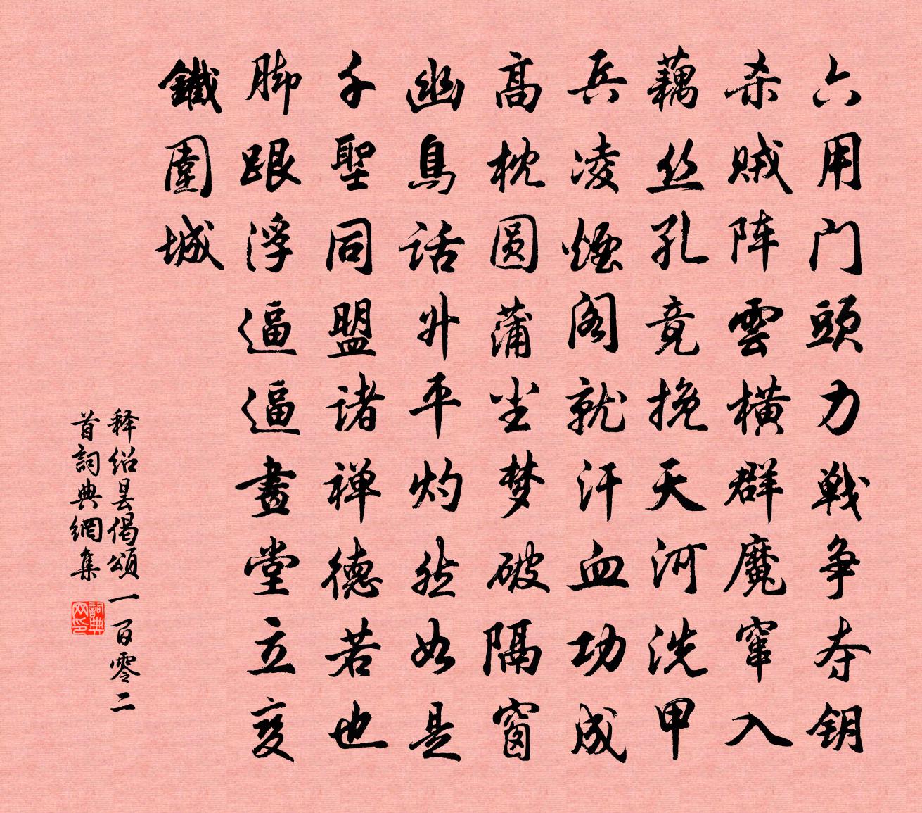 詩詞名句歷史字典書法欣賞書法字典國語詞典說文解字康熙字典古漢語字典標 題 作 者 詩 句 偈頌一百零二首作者:釋紹曇 朝代:宋代偈頌一百零二首原文六用門頭,力戰爭奪,鑰殺賊陣雲橫。群魔竄入藕絲孔,竟挽天河洗甲兵。凌煙閣就,汗血功成。高枕圓蒲塵夢破,隔窗幽鳥話昇平。灼然如是,千聖同盟。諸禪德,若也腳跟浮逼逼,畫堂立變鐵圍城。詩詞問答問:偈頌一百零二首的作者是誰?答:釋紹曇問:偈頌一百零二首寫於哪個朝代?答:宋代釋紹曇偈頌一百零二首書法欣賞偈頌一百零二首書法作品詩詞推薦感寓陸游〔宋代〕人生難控摶,古謂七十稀。壽夭雖小異,要亦同所歸。君看銜山日,耿耿有餘暉。投床方息偃,晨起復求衣。萬家寶鏡吟柴元彪〔宋代〕荊山已童若耶涸,若耶可采山可鑿。金精少皞不敢秘,鑒壞飛就歐冶錯。祝融煽焰千丈芒,玄冥洗光萬里爍。冷侵杭州北郭戴氏荷池送侯愉崔國輔〔唐代〕秋近萬物肅,況當臨水時。折花贈歸客,離緒斷荷絲。誰謂江國永,故人感在茲。道存過北郭,情極望東菑。喬木導引佚名〔宋代〕膺乾興運,辰火正心房。宗祀繼文王。典容希闊成昭備,彬郁暉光。因心崇孝申郊侑,內外罄齋莊。神靈歡嘉昌綿癸巳歲邑中大歉三七侄捐金散谷以濟艱食因成吳芾〔宋代〕吾家謂侄非常兒,自幼讀書嘗下帷。平居事母盡孝道,力供子職曾無違。辛勤農畝三十載,頓立門戶成家肥。恥同仙跡岩題詩二十三首無骨篛佚名〔宋代〕許氏功成獲上升,曾遺一劑語丁寧。山生紺篛奇無骨,洞隱金丹顯有靈。松竹欹岩非易取,煙霞塞道卒難經。有緣春遊二林寺白居易〔唐代〕下馬二林寺,翛然進輕策。朝為公府吏,暮是靈山客。二月匡廬北,冰雪始消釋。陽叢抽茗牙,陰竇泄泉脈。熙熙明州進芝草並圖夏竦〔宋代〕四明開奧壤,三秀髮靈芝。舅蓋殊形聳,無根瑞氣滋,晨敷台嶺異,日茂下房奇。善氣方回復,充圖獻玉墀。偈頌六十八首釋法薰〔宋代〕秋聲滿林壑,秋雨滴梧桐。門外未歸客,飄泊在途中。歸也,歸也,通身白汁,下載清風。朝天子劉克莊〔宋代〕宿雨頻飄灑。歡喜西疇耕者。終朝連夜。有珠璣鳴瓦。漸白水、青秧鷗鷺下。老學種花兼學稼。心兩掛。這幾樹、金剛隨機無盡頌非說所說分第二十一釋印肅〔宋代〕無說名真說,唯有□迦葉。無聞而聞聞,四七當頭別。和之美舟行雜詩八首罾魚者司馬光〔宋代〕弱絛絓輕絲,盡日寒溪側。護少近知無,溪魚皆爾識。秋興亭孫杓〔宋代〕前有長江後有湖,天將此景屬吾徒。當時想未見秋興,謾說南樓天下無。滿庭芳 贈姜王二先生馬鈺〔元代〕人人須道,次*須知。始初屏子休妻。次則離家乞食。無作無為。但見老人童稚,便須當、禮樂先施。行大善,但金縷曲/賀新郎劉辰翁〔宋代〕拍瓮春醅動。洞庭霜、壓綠堆黃,林苞堪貢。況有老人潭邊菊,搖落賞心入夢。數百歲、半來許中。兒女牽衣團欒金陵江上遇蓬池隱者(時於落星石上以紫綺裘換酒為歡)李白〔唐代〕心愛名山游,身隨名山遠。羅浮 * 台,此去或未返。遇君蓬池隱,就我石上飯。空言不成歡,強笑惜日晚。綠水過七里瀨楊時〔宋代〕扁舟東下幾時還,一席飛帆插羽翰。回首嚴陵台上月,清風千古逼人寒。孟子天民陳普〔宋代〕皇天賦予各成形,萬理兼該備自身。所謂天民非有別,能全所賦以為人。導引佚名〔宋代〕天儀安豫洽無為。九域被雍熙。鸞刀親割升圭瓚,清廟展孝思。簫韶九變皇靈格,嘏告顯深慈。精誠動感歸能饗,寄尋梅戴復古〔宋代〕寄聲說與尋梅者,不在山邊即水涯。又恐好枝為雪壓,或生幽處被雲遮。蜂黃塗額半含蕊,鶴膝翹空疏帶花。此是名句推薦男兒何不帶吳鉤,收取關山五十州。李賀《南園十三首·其五》 分明一覺華胥夢,回首東風淚滿衣。趙鼎《鷓鴣天·建康上元作》 洞門高閣靄餘輝,桃李陰陰柳絮飛。王維《酬郭給事 / 贈郭給事》 但見宵從海上來,寧知曉向雲間沒。李白《把酒問月·故人賈淳令予問之》 樓前柳,憔悴幾秋風。賀鑄《小重山·花院深疑無路通》 萬里浮雲卷碧山,青天中道流孤月。李白《答王十二寒夜獨酌有懷》 淡盪春光寒食天。玉爐沉水裊殘煙。夢回山枕隱花鈿。李清照《浣溪沙·淡盪春光寒食天》 獨自下層樓,樓下蛩聲怨。程垓《卜運算元·獨自上層樓》 虎踞龍蟠何處是,只有興亡滿目。辛棄疾《念奴嬌·登建康賞心亭呈史致道留守》 春衫著破誰針線,點點行行淚痕滿。黃公紹《青玉案·年年社日停針線》