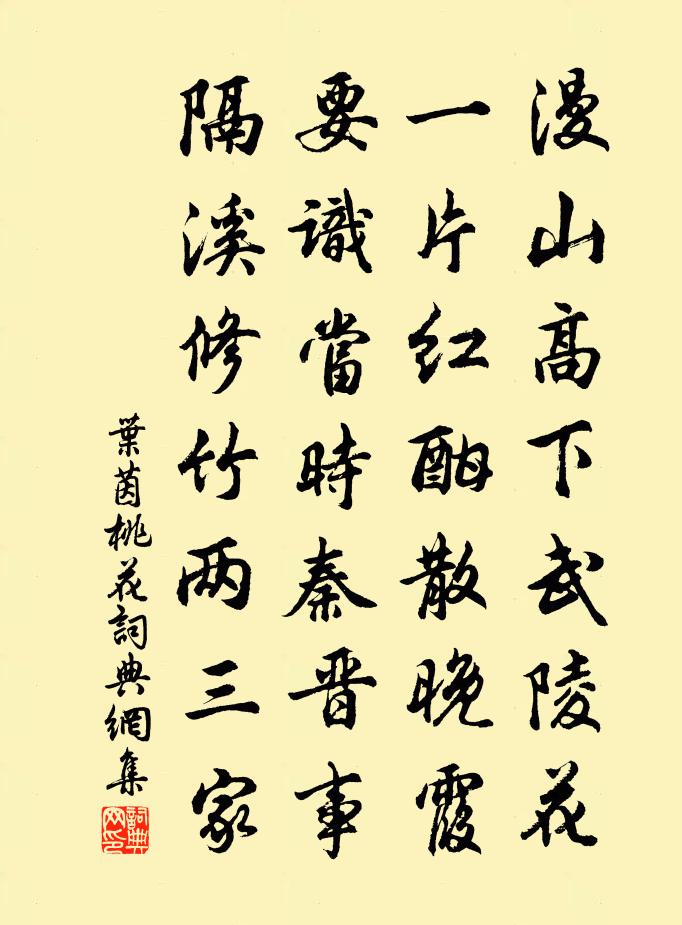 詩詞名句歷史字典書法欣賞書法字典國語詞典說文解字康熙字典古漢語字典標 題 作 者 詩 句 桃花作者:葉茵 朝代:宋代桃花原文漫山高下武陵花,一片紅酣散晚霞。要識當時秦晉事,隔溪修竹兩三家。詩詞問答問:桃花的作者是誰?答:葉茵問:桃花寫於哪個朝代?答:宋代葉茵桃花書法欣賞桃花書法作品詩詞推薦暮春即事葉采〔宋代〕雙雙瓦雀行書案,點點楊花入硯池。閒坐小窗讀周易,不知春去幾多時。早行陸游〔宋代〕江路迢迢馬首東,臨川一夢又成空。日高未泫晨霜白,風勁先消卯酒紅。山市人經饑饉後,孤生身老道途中。著身九月初四日大風雨近重陽無酒夜成二首方回〔宋代〕怕見秋深秋又深,青燈白髮厭愁霖。百年剩幾重陽日,萬事都無一稱心。自揣老懷饒感慨,可須佳節強登臨。在陳送無相祖老真骨歸塔王銍〔宋代〕去來一念等孤雲,只履西歸道更尊。落葉滿山新塔就,雨花盈幾故經存。風清罷放林間鶴,月冷空啼嶺上猿。白髮奉和四月三日上陽水窗賜宴應制得春字孫逖〔唐代〕今日逢初夏,歡游續舊旬。氣和先作雨,恩厚別成春。鳳吹臨清洛,龍輿下紫宸。此中歌在藻,還見躍潛鱗。臨水亭丘均閭〔唐代〕高館基曾山,微冪生花草。傍對野村樹,下臨車馬道。清朗悟心術,幽遐備瞻討。回合峰隱雲,聯綿渚縈島。氣似嵩山十志十首草堂盧鴻一〔唐代〕草堂者,蓋因自然之谿阜,前當墉洫;資人力之締構,後加茅茨。將以避燥濕,成棟宇之用;昭簡易,葉乾坤之德南鄉子(送客過余溪,聽天隱二玉鼓胡琴·般涉調)張先〔宋代〕相併細腰身。時樣宮妝一樣新。曲項胡琴魚尾撥,離人。入塞弦聲水上聞。天碧染衣巾。血色輕羅碎摺裙。百卉已少年游·楓林紅透晚煙青蔣捷〔宋代〕楓林紅透晚煙青,客思滿鷗汀。二十年來,無家種竹,猶借竹為名。春風未了秋風到,老去萬緣輕。只把平生,閒九龍帳歌佚名〔唐代〕誰謂九龍帳,惟貯一歸郎。招隱亭王灼〔宋代〕層崖壓西城,半空矗孤峭。何人結斯宇,想見胸次妙。叢林開蒙密,江山得樞要。拂拂幽草香,嘖嘖群鳥叫。我作贈崔咨議李白〔唐代〕綠驥本天馬,素非伏櫪駒。長嘶向清風,倏忽凌九區。何言西北至,卻走東南隅。世道有翻覆,前期難豫圖。希君送鄧舍人將漕西淮用舍人坐上詩韻虞儔〔宋代〕西湖煙柳勝陽關,遮斷淮南大小山。詩好固應傾座上,酒行猶喜到花間。君王納諫寧容去,風雨愁予豈坐慳。未用羑里城范成大〔宋代〕陵谷遷移尚故壚,天盈商罪未蠲除。古今行客同嗤罵,何止三篇泰誓書。如夢令丘崈〔宋代〕門外綺羅入繡。堂上華燈入晝。領略一番春,共醉連宵歌酒。今後。今後。如此遨頭少有。題梅山趙蕃〔宋代〕望覺林巒合,行知隴畝分。轉亭橋跨壑,入寺閣連雲。薪水僮奴事,經禪長少勤。令人生愛敬,何止息塵氛。送人及第歸海東張喬〔唐代〕東風日邊起,草木一時春。自笑中華路,年年送遠人。古邑二首宋祁〔宋代〕古邑蓬池上,私居市道鄰。初拋三釜粟,來作一廛民。乞火黔薪突,繙經振隙塵。何從復何去,更欲問圓神。甲申上元前聞家君不快,西歸見梅有感二首楊萬里〔宋代〕千里來為五斗謀,老親望望且歸休。春光盡好關儂事?細雨梅花只做愁。虎丘新復古石井泉,太守沈虞卿舍人勸農過之范成大〔宋代〕傳聞公作新亭好,先報儂家拄杖知。便擬挈瓶來煮茗,繞闌乾角遍尋詩。名句推薦孤芳一世,供斷有情愁,消瘦損,東陽也,試問花知否曹組《驀山溪·梅》 小憐初上琵琶,曉來思繞天涯。王安國《清平樂·春晚》 問姓驚初見,稱名憶舊容。李益《喜見外弟又言別》 最愛湖東行不足,綠楊陰裏白沙堤。白居易《錢塘湖春行》 這次第,怎一個愁字了得!李清照《聲聲慢·尋尋覓覓》 故人應念,杜鵑枝上殘月。文天祥《酹江月·和友驛中言別》 燕草如碧絲,秦桑低綠枝。李白《春思》 當年不肯嫁春風,無端卻被秋風誤。賀鑄《芳心苦·楊柳回塘》 無數春筍滿林生,柴門密掩斷行人。杜甫《詠春筍》 故園書動經年絕,華發春唯滿鏡生。崔塗《春夕》