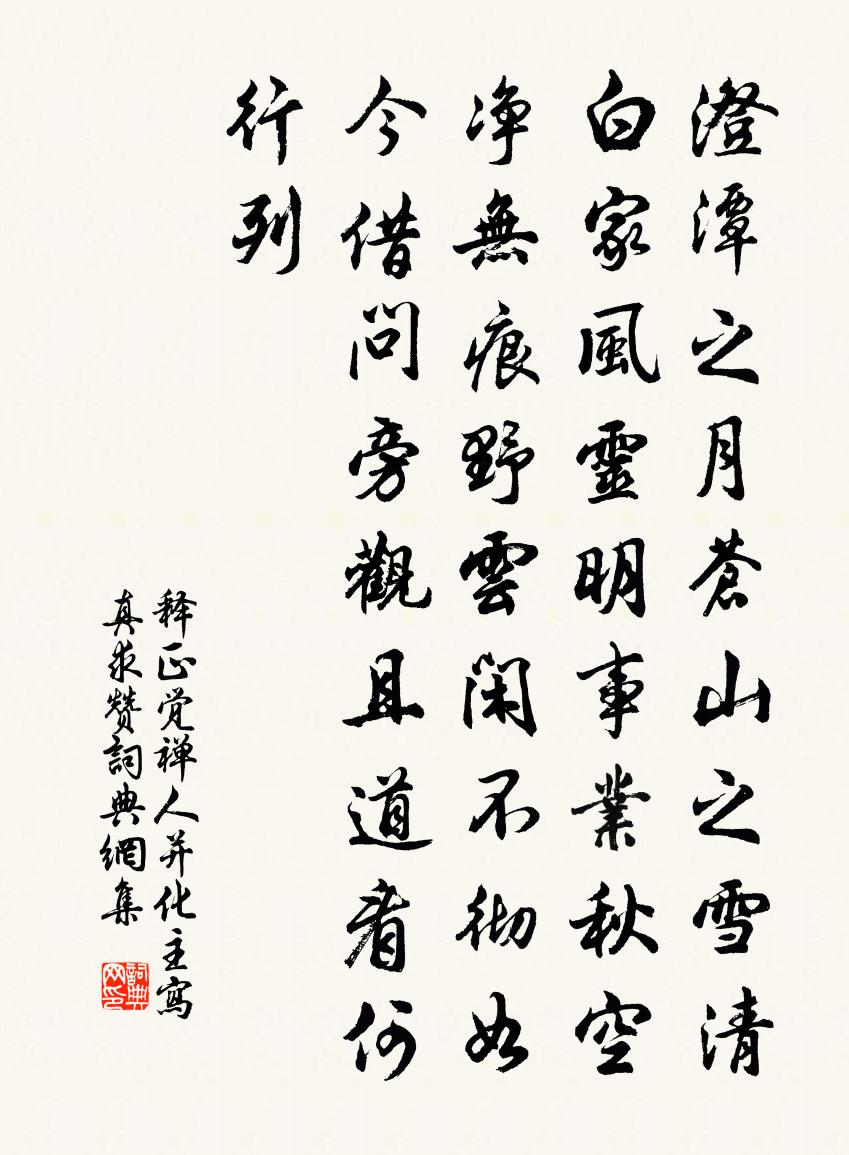 詩詞名句歷史字典書法欣賞書法字典國語詞典說文解字康熙字典古漢語字典標 題 作 者 詩 句 禪人並化主寫真求贊作者:釋正覺 朝代:宋代禪人並化主寫真求贊原文澄潭之月,蒼山之雪。清白家風,靈明事業。秋空淨無痕,野雲閒不徹。如今借問旁觀,且道看何行列。詩詞問答問:禪人並化主寫真求贊的作者是誰?答:釋正覺問:禪人並化主寫真求贊寫於哪個朝代?答:宋代釋正覺禪人並化主寫真求贊書法欣賞禪人並化主寫真求贊書法作品詩詞推薦和河南鄭尹新歲對雪白居易〔唐代〕白雪吟詩鈴閣開,故情新興兩裴回。昔經勤苦照書卷,今助歡娛飄酒杯。楚客難酬郢中曲,吳公兼占洛陽才。銅街景仁召飲東園呈彥升次道君錫才元子容司馬光〔宋代〕去冬辱嘉招,寒風方贔屭。今秋侍高宴,晴日正澄麗。雖無花花繁,且有丘樊思。雖無山泉樂,暫違塵土氣。仆休三男詞楊維楨〔元代〕君不見羌胡之妻產龍鷲,駱家之婦生虎狸。造物好或怪,痴兒以為奇。金村鐵婦不畫眉,健手能運千斤椎。懷妊弗病退陸游〔宋代〕病退身仍健,春回日漸長。神訶金鼎藥,龍出玉函方。美睡三竿日,安禪半篆香。殘年已如許,幸復起膏肓。鷓鴣天佚名〔宋代〕冷落人間晝掩門。泠泠殘粉縠成紋。幾枝疏影溪邊見,一拂清香馬上聞。冰作質,月為魂。蕭蕭細雨入黃昏。人間游南嶂同孫信道陳與義〔宋代〕遙瞻南嶂深復深,雙崖與天藏太陰。青鞋濟勝不能懶,踏破積雪窮崎嶔。空中朽樹抱孤筱,無竅蒼壁生橫林。孤禽七言四韻十六首張伯端〔宋代〕休煉三黃及四神,若尋眾藥便非真。陰陽得類歸交感,二八相當自合親。潭底日紅陰怪滅,山頭月白藥苗新。時人聞杜鵑王炎〔宋代〕稻身出水綠初齊,憶在田間把一犁。留滯天涯歸未得,杜鵑何苦向人啼。送林自知自幕中歸常亭真德秀〔宋代〕始吾與林子,周旋大江東。子方清且貧,簡瓢屢雲空。勁氣凜不折,耿耿如長虹。明年擢高科,對策大明宮。一尉詠飲馬李世民〔唐代〕駿骨飲長涇,奔流灑絡纓。細紋連噴聚,亂荇繞蹄縈。水光鞍上側,馬影溜中橫。翻似天池裡,騰波龍種生。和錢大虛清映亭韻李流謙〔宋代〕西風振槁如發蒙,危亭創見心眼工。融成水月一合相,有似猛火烹鉛銅。是時素節屬重九,喚客一醉萸菊同。夜深再用前韻簡丁端叔陳傅良〔宋代〕事到難時意轉佳,聲名早已動皇華。撥煩自古書生短,只合橫經住絳紗。挽萬監丞益之文天祥〔宋代〕文華時輩右,質樸古風餘。壁上舂陵記,屏間太極圖。雲山居士屋,風雪故人書。一夢中觀化,堯夫以後無。寄信州交代錢德循孔武仲〔宋代〕處君以西軒之爽氣,贈君以仙府之名花。名花芬敷隨曉日,爽氣蕭颯凌朝霞。山川從此增秀色,塵埃不復留君家。丞相信庵趙公哀詩五首劉克莊〔宋代〕丙午遭逢瑟改調,先皇記憶忝弓招。明揚雖曰由師錫,密啟端因侍燕朝。早識武侯比龍鳳,晚為公旦序鴟鴞。吾貧遣興三絕1舒岳祥〔宋代〕小小茅齋傍茂林,朝朝暮暮有鳴禽。道人心事無憎愛,終夜聞梟也好音。幽居即事陸游〔宋代〕酒能忘事物,不過在醉時。麴孽力既盡,萬緒如盎絲。阿堵雅見疏,歡伯難與期。自憐善用短,時誦止酒詩。楊伯子過訪翌日以兩詩見貽因次韻答張鎡〔宋代〕晴色今朝好,春光恰半頭。波清如釣渭,圃事勝封留。瘦覺中黃合,閒宜大白浮。無端同志侶,相過結詩愁。寄陳莘村林景英〔宋代〕玄冬梅半日,光接太丘星。雪月往來夢,溪山長短亭。利名成露草,行止付風萍。三十年來友,無如老典型。閉門齊己〔唐代〕外事休關念,灰心獨閉門。無人來問我,白日又黃昏。燈集飛蛾影,窗銷迸雪痕。中心自明了,一句祖師言。名句推薦蔞蒿滿地蘆芽短,正是河豚欲上時。蘇軾《惠崇春江晚景 / 惠崇春江曉景》 寒色孤村幕,悲風四野聞。洪升《雪望》 忍淚不能歌,試托哀弦語晏幾道《生查子·墜雨已辭雲》 驚回千里夢,已三更。起來獨自繞階行。岳飛《小重山·昨夜寒蛩不住鳴》 寥落古行宮,宮花寂寞紅。元稹《行宮》 盡道有些堪恨處,無情,任是無情也動人。秦觀《南鄉子·妙手寫徽真》 唯見鴻雁飛,令人傷懷抱。高適《登百丈峰二首》 今夫山一卷石之多,及其廣大,草木生之,禽獸居之,寶藏興焉。子思《中庸·第二十六章》 新知遭薄俗,舊好隔良緣。李商隱《風雨》 傷心秦漢經行處,宮闕萬間都做了土。張養浩《山坡羊·潼關懷古》