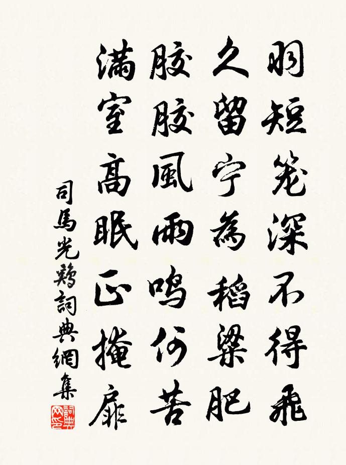 詩詞名句歷史字典書法欣賞書法字典國語詞典說文解字康熙字典古漢語字典標 題 作 者 詩 句 雞作者:司馬光 朝代:宋代雞原文羽短籠深不得飛,久留寧為稻粱肥。膠膠風雨鳴何苦,滿室高眠正掩扉。詩詞問答問:雞的作者是誰?答:司馬光問:雞寫於哪個朝代?答:宋代問:司馬光的名句有哪些?答:司馬光名句大全司馬光雞書法欣賞雞書法作品詩詞推薦答元奉禮同宿見贈白居易〔唐代〕相逢俱嘆不閒身,直日常多齋日頻。曉鼓一聲分散去,明朝風景屬何人?四五用喜雪韻四首吳潛〔宋代〕覆蓋無分實與虛,太平有象史官書。園林底用夸末至,山水惟應訪遂初。潤到青蔬尤脆美,老添蒼檜更扶疎。是中鳳銜杯(二之二·大石調)柳永〔宋代〕追悔當初孤深願。經年價、兩成幽怨。任越水吳山,似屏如障堪遊玩。奈獨自、慵抬眼。賞煙花,聽弦管。圖歡笑哭?十五章辛棄疾〔宋代〕世無扁和手,遺恨歸砭劑。嗟誰使之然,刻舟寧復記。凱歌十首呈賈樞使劉克莊〔宋代〕將謂長淮已蕩平,豈知什塹又顛坑。從今莫近他城子,怕有南人夜斫營。和劉學錄韻陳宓〔宋代〕兩堤已著金絲縷,平岸行看翠羽茵。春晝漸長無一事,艤舟日日待詩人。西陵觀梅武衍〔宋代〕障霜篝日奪天機,九月梅花賞玉蕤。到了不如春意勝,水邊風韻兩三枝。余在北門時每立春必前索宮中春詞十餘解今逢宋祁〔宋代〕星杓夜壓禁城東,葭縠晨飛玉管中。撲撲煙花千戶暖,嘈嘈歌吹九門風。翻憂晁說之〔宋代〕歲暮窮途惱白頭,況加一歲更荒州。家禽聚處無居屋,野水分時便斷流。何物不堪供佛淚,誰人可與共咨謀。一生疇依王柏〔宋代〕於穆文王,順帝之則。身蒙大難,小心翼翼。三分有二,以服事殷。可謂至德,萬邦儀刑。句韓璜〔宋代〕願為靖節妃。曉晴度青城繩橋二絕句程公許〔宋代〕怒濤噴雪戰魚龍,架篾成橋裊半空。世路險夷那不有,此心安處本來同。水次秋蚊可畏施樞〔宋代〕利觜似花鷹,針膚不暫停。有生何蠢蠢, * 在冥冥。亂舞 * 水,喧聲接曉汀。風威秋晚勁,看汝易飄零。題張子正觀察溪風亭郭仲荀〔宋代〕廣岸流波遠,清飈襟袖開。登臨忘畏景,宴息絕纖埃。逐渡輕雲去,零空細雨來。斯亭不受暑,歸客意裴回。即事李流謙〔宋代〕雪巘雲林共莽然,世間那有此江天。曉檣攙日何時到,夜柁鳴風幾夕眠。閒卜家書燈似粟,略開旅抱酒如泉。輕鷗贈劉南郡委連詩沈約〔南北朝〕遠漢景德。盛楚連徽。灼灼中壘。入奧知微。殊源別派。復屬清輝。伊我蘭執。升堂啟扉。劉仙嚴胡銓〔宋代〕縣崖怪石水潺湲,宜有神龍隱此間,窮勝不妨歸險洞,尋春那止看群山。攀龍行即天邊去,躍馬聊同野外還。好景送高記室廣州幕宋祁〔宋代〕楚國王孫後,梁台賦客賢。貪磨盾鼻檄,重冠玳簪筵。去路南溟地,離魂北斗天。庾鮭三種嫩,虞璧一雙鮮。颶影秋螢引劉禹錫〔唐代〕漢陵秦苑遙蒼蒼,陳根腐葉秋螢光。夜空寥寂金氣淨,千門九陌飛悠揚。紛綸暉映互明滅,金爐星噴鐙花發。露華送道琚上人還金陵皎然〔唐代〕一與鐘山別,山中得信稀。經年求法後,及夏問安歸。野實充甘膳,池花當彩衣。慈親莫返拜,外禮欲無為。名句推薦寂歷秋江漁火稀,起看殘月映林微。湯顯祖《江宿》 相馬失之瘦,相士失之貧。司馬遷《史記·滑稽列傳》 厭見千門萬戶,經過北里南鄰。王維《田園樂七首·其一》 見善而怠,時至而疑,知非而處,此三者,道之所止也。姜子牙《六韜·文韜·明傳》 秋容淺淡映重門,七節攢成雪滿盆。曹雪芹《詠白海棠》 侈而墮者貧,而力而儉者富。韓非及後人《韓非子·顯學》 天涯失鄉路,江外老華發。李白《江南春懷》 提出西方白帝驚,嗷嗷鬼母秋郊哭。李賀《春坊正字劍子歌》 駸駸嬌眼開仍,悄無人至還凝佇。文徵明《青玉案·庭下石榴花亂吐》 相尋夢裡路,飛雨落花中。晏幾道《臨江仙·鬥草階前初見》