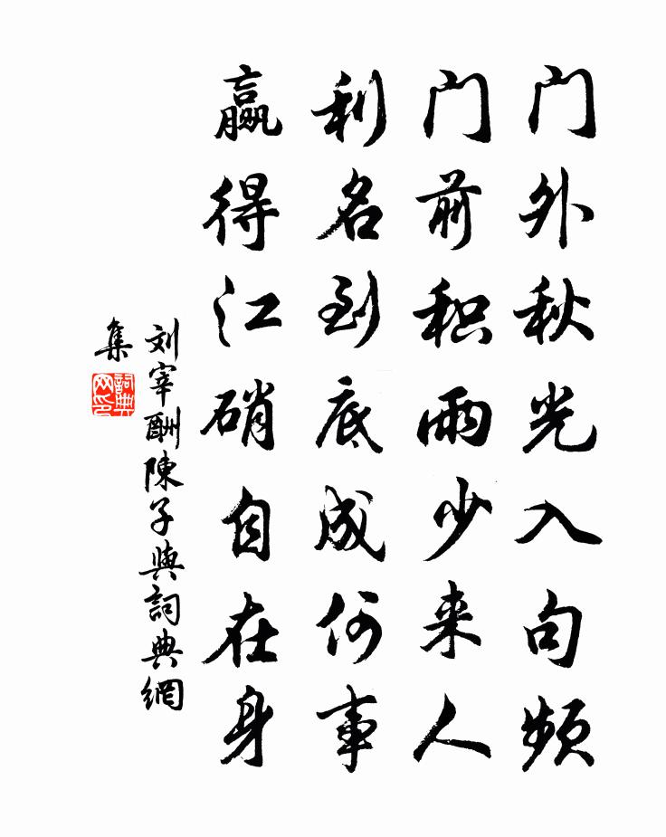 詩詞名句歷史字典書法欣賞書法字典國語詞典說文解字康熙字典古漢語字典標 題 作 者 詩 句 酬陳子與作者:劉宰 朝代:宋代酬陳子與原文門外秋光入句頻,門前積雨少來人。利名到底成何事,贏得江硝自在身。詩詞問答問:酬陳子與的作者是誰?答:劉宰問:酬陳子與寫於哪個朝代?答:宋代劉宰酬陳子與書法欣賞酬陳子與書法作品詩詞推薦從軍行·吹角動行人王維〔唐代〕吹角動行人。喧喧行人起。笳悲(一作應)馬嘶亂。爭渡金(一作黃)河水。日暮沙漠陲。戰聲(一作力戰)煙塵春日偶成程顥〔宋代〕雲淡風輕近午天,傍花隨柳過前川。時人不識余心樂,將謂偷閒學少年。月坡亭李耆明見菊毛幵〔宋代〕初陽散微和,晞露耿餘明。引花吸其精,助我養修齡。人生憑化遷,日夜枯與榮。聊為寂寞游,放此真率情。次韻何子應留詩為別王灼〔宋代〕出頭自合持文柄,失腳因循作吏師。記取舂陵好邦伯,臨風對月有清詩。題誠齋像二首劉克莊〔宋代〕歐陽公屋畔人,呂東萊派外詩。海外鹹推獨步,江西橫出一枝。劭農翠山賦唐律二首吳潛〔宋代〕小隊旌旗上翠岩,松風十里鎖禪關。水深水淺高低澗,春淡春濃遠近山。鄉思猛隨蒼鳥去,客心暫與白雲閒。天公病起賈島〔唐代〕高丘歸未得,空自責遲回。身事豈能遂,蘭花又已開。病令新作少,雨阻故人來。燈下南華卷,袪愁當酒杯。飛仙吟送張道士白玉蟾〔宋代〕夜騎玉鰲採明月,蘂殿瑤台寒徹骨。三十六天不閉門,風吹琪花散飛雪。簫韶鳴處隊仗多,八萬霓裳歌一闋。紫皇述祖德詩謝靈運〔南北朝〕小序太元中。王父龕定淮南。負荷世業。專主隆人。逮賢相徂謝。君子道消。拂衣蕃岳。考卜東山。事同樂生之時頌古五首釋原妙〔宋代〕盡枯腸喪盡機,通身不掛一毫絲。清風步步隨身轉,明月誰分上下池。更漏子賀鑄〔宋代〕芳草斜曛。映畫橋□□,翠閣臨津。數闋清歌,兩行紅粉,厭厭別酒初醺。芳意贈我殷勤。羅巾雙黛痕。便蘭舟獨筠溪八景詩谷岫陵雲陳著〔宋代〕毓秀山根插翠峰,如陵如阜起嶐嵷。堆高鹿苑沖銀漢,積擬鉅橋跨玉虹。斂厚難輸王廩粟,歲豐長守大夫松。乾坤探春令(賞梅十首)趙長卿〔宋代〕冰檐垂箸,雪花飛絮,時方嚴肅。向尋常搖曳,凡花野草,怎生敢夸紅綠。江梅孤潔無拘束。只溫然如玉。自一般贈文應上人(一作贈高僧)孟郊〔唐代〕棲遲青山巔,高靜身所便。不踐有命草,但飲無聲泉。齋性空轉寂,學情深更專。經文開貝葉,衣制垂秋蓮。厭此初到江州寄翰林張李杜三學士白居易〔唐代〕早攀霄漢上天衢,晚落風波委世途。雨露施恩無厚薄,蓬蒿隨分有榮枯。傷禽側翅驚弓箭,老婦低顏事舅姑。碧落金山寺程公許〔宋代〕畫圖省識金山面,短褐風吹入畫圖。玉鏡台空螺髻直,海潮音散蜃樓孤。歸田擬共江神約,鼓枻容追越相逋。百一閨怨俞桂〔宋代〕鳳幃曉起鬢{上髟下龍}松,枕肉初生酒暈紅。一把柳絲挪在手,沉吟無語對春風。晚晴宋肇〔宋代〕古道遙臨水,荒城早閉門。亂山銜落照,歸鳥下空園。江口漁人舫,崖腰桑樹村。客愁何可奈,有酒莫空樽。春遊南靜川王禹偁〔宋代〕南過高車嶺,川原似掌平。峰巒開畫障,畎畝列棋枰。帝女柔桑綠,王孫野莫生。提壺催我醉,戴勝勸人耕。商嶺勸農和江萬里韻劉崇卿〔宋代〕年來兵餉瘠吾農,在遣仁侯作歲豐。燕寢書清塵不到,螺江春滿澤無窮。詩陶幽雅熙熙俗,文續周書噩噩風。別乘名句推薦孤眠鸞帳里,枉勞魂夢,夜夜飛揚。佚名《鳳歸雲·閨怨》 青山依舊在,幾度夕陽紅。楊慎《臨江仙·滾滾長江東逝水》 萬種思量,多方開解,只恁寂寞厭厭地。柳永《憶帝京·薄衾小枕涼天氣》 悠悠天宇曠,切切故鄉情。張九齡《西江夜行》 碧水丹山映杖藜,夕陽猶在小橋西。沈周《題畫》 盡無言、閒品秦箏,淚滿參差雁呂渭老《薄倖·青樓春晚》 思則有備,有備無患左丘明《左傳·襄公·襄公十一年》 東門之楊,其葉牂牂。佚名《東門之楊》 草春榮而冬枯,至於極枯,則又生矣王永彬《圍爐夜話·第六九則》 山外青山樓外樓,西湖歌舞幾時休?林升《題臨安邸》