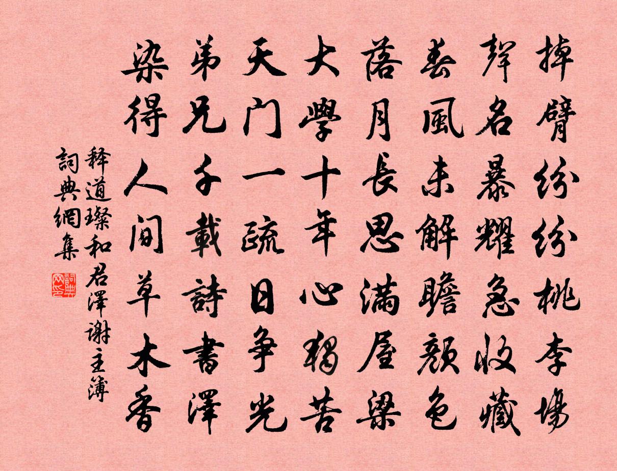 詩詞名句歷史字典書法欣賞書法字典國語詞典說文解字康熙字典古漢語字典標 題 作 者 詩 句 和君澤謝主簿作者:釋道璨 朝代:宋代和君澤謝主簿原文掉臂紛紛桃李場,聲名暴耀急收藏。春風未解瞻顏色,落月長思滿屋樑。大學十年心獨苦,天門一疏日爭光。弟兄千載詩書澤,染得人間草木香。詩詞問答問:和君澤謝主簿的作者是誰?答:釋道璨問:和君澤謝主簿寫於哪個朝代?答:宋代釋道璨和君澤謝主簿書法欣賞和君澤謝主簿書法作品詩詞推薦沁園春(餞鄭金部去國)黃師參〔宋代〕谷口高人,偶溯明河,近尺五天。見紫霄宮闕,空中突兀,玉皇姬侍,雲里蹁躚。滴露研朱,披肝作紙,細寫靈均寄樂天元稹〔唐代〕閒夜思君坐到明,追尋往事倍傷情。同登科後心相合,初得官時髭未生。二十年來諳世路,三千里外老江城。猶應輥金丸楊真人〔元代〕一更里,擒意馬。猿猴兒,莫顛耍。大悟來,心地覺清涼,管自然都放下。本來面目常瀟灑。真清淨,更幽雅。更木蘭花慢(看春有感)呂勝己〔宋代〕平生花恨少,又那得、酒中愁。自禪板停參, * 悟罷,身世忘憂。南柯舊時太守,盡當年、富貴即時休。莫羨痴江城子袁易〔元代〕爛鋪蜀錦寫烏絲。憶傾卮。燕來時。猶記半揎,雲袖見凝脂。燕子只今何處去,庭院悄,誤心期。綠蕪凋盡眾芳遲令人王氏輓詞樓鑰〔宋代〕嫁早仍知孝,夫賢自不貧。事姑如事母,憂物勝憂身。鳳誥恩榮渥,鳩桑德意均。孺哀聲不絕,淚柏不成春。宿靜林寺靈一〔唐代〕山寺門前多古松,溪行欲到已聞鍾。中宵引領尋高頂,月照雲峰凡幾重。上巳賜宴瓊林與二府諸公游水心憩於西軒晏殊〔宋代〕三月楊花飛似雪,內園桂樹綠成陰。何妨寫盡憑高意,十步虹橋徹水心。水調歌頭(書懷)曾覿〔宋代〕溪山多勝事,詩酒辨清游。主人為我,增茸台榭足凝眸。仿佛玉壺天地,隱見瀛洲風月,千首傲王侯。誰與共登眺雨師雷神七首佚名〔宋代〕眾萬之吒,動之潤之。昭格孔時,維神之依。冷然後先,肆我肯顧。是耶非耶,紛其來下。用鍾侍郎韻贈懶谷洪咨夔〔宋代〕 * 竹几妙高台,瞑坐何能放眼開。門外白雲多事在,又將飛雨出山來。清平樂·畫堂晨起李白〔唐代〕畫堂晨起,來報雪花墜。高捲簾櫳看佳瑞,皓色遠迷庭砌。盛氣光引爐煙,素草寒生玉佩。應是天仙狂醉,亂把白十二月二日夜夢遊沈氏園亭陸游〔宋代〕城南小陌又逢春,只見梅花不見人。玉骨久成泉下土,墨痕猶鎖壁間塵。陽關詞陳剛中〔宋代〕客舍休悲柳色新,東西南北一般春。若知四海皆兄弟,何處相逢非故人。海棠陳與義〔宋代〕春雨夜有聲,連林杏花落。海棠已復動,寒食豈寂寞。人間有此麗,赴我隔年約。花葉兩分明,春陰耿簾幙。東風大秀宮黃庭堅〔宋代〕玉笥山前大白峰,望仙橋下水溶溶。前溪流水後溪月,五步白雲三步松。半夜佩環朝上闕,插天樓閣度疏鍾。夢余壽范漕吳泳〔宋代〕入窗月疎疎,滿坐春盎盎。事機盡盤錯,收入經濟藏。魚方在沸鼎,獨以袽沃漲。靜言平寇功,當置裴李上。偈頌二百零五首釋正覺〔宋代〕不落階級,卓卓超出三際。曷用安排,十方自然畐塞。五色線不我羈縻,七寶冠是誰嚴飾。論語絕句一百首張九成〔宋代〕箾韶深寓舜之心,夫子聞之感亦深。三月遂忘於肉味,誰知千古遇知音。贈郭相士俊夫劉克莊〔宋代〕東郭無全履,南轅似轉蓬。自慚老中壘,莫誤小林宗。若見同胞子,為言禿鬢翁。衰年不堪玩,一病一龍鍾。名句推薦香幃風動花入樓,高調鳴箏緩夜愁。王昌齡《青樓怨》 滄海桑田,謂世事之多變;河清海晏,兆天下之昇平。程登吉《幼學瓊林·卷一·地輿》 君子惜名,小人愛身。來俊臣《羅織經·保身卷第七》 多私者不義,揚言者寡信。戴聖《大戴禮記·文王官人第七十二》 何時一樽酒,重與細論文。杜甫《春日憶李白》 大仇必去,小人勿輕,禍不可伏。來俊臣《羅織經·固榮卷第六》 數枝門柳低衣桁,一片山花落筆床。岑參《山房春事二首》 六月禾未秀,官家已修蒼。聶夷中《田家》 情人怨遙夜,竟夕起相思。張九齡《望月懷遠》 還怕掩、深院梨花,又作故人清淚。吳文英《無悶·催雪》