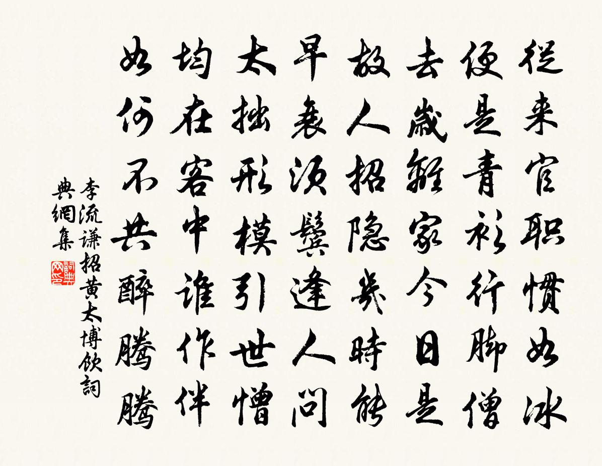 詩詞名句歷史字典書法欣賞書法字典國語詞典說文解字康熙字典古漢語字典標 題 作 者 詩 句 招黃太博飲作者:李流謙 朝代:宋代招黃太博飲原文從來官職慣如冰,便是青衫行腳僧。去歲離家今日是,故人招隱几時能。早衰須鬢逢人問,太拙形模引世憎。均在客中誰作伴,如何不共醉騰騰。詩詞問答問:招黃太博飲的作者是誰?答:李流謙問:招黃太博飲寫於哪個朝代?答:宋代李流謙招黃太博飲書法欣賞招黃太博飲書法作品詩詞推薦掃徑晁公溯〔宋代〕掃徑通春屐,開林啟夕扉。浮鷗避人去,輕燕引雛飛。尊俎深留客,風塵漸息機。不妨坐至晚,少待月同歸。挽鬍子瑞孫應時〔宋代〕耆舊長庚月,斯人馬少游。平生自繩尺,方寸不戈矛。細細巾箱字,琅琅燈火秋。子孫森滿眼,齎志可無酬。雪十韻吳融〔唐代〕灑密蔽璇穹,霏霏杳莫窮。遲於雨到地,疾甚絮隨風。四野蒼茫際,千家晃朗中。夜迷三繞鵲,晝斷一行鴻。結片風流子·秋郊即事納蘭性德〔清代〕平原草枯矣,重陽後、黃葉樹騷騷。記玉勒青絲,落花時節,曾逢拾翠,忽聽 * 。今來是、燒痕殘碧盡,霜影亂耕樂詩四首袁甫〔宋代〕少時操筆代躬耕,老鶴如今太瘦生。已識箇中真樂地,誰雲骨相費生成。月漉漉篇李賀〔唐代〕月漉漉,波煙玉。莎青桂花繁,芙蓉別江木。粉態夾羅寒,雁羽鋪煙濕。誰能看石帆?乘船鏡中入。秋白鮮紅死,聞田老死於臨安劉宰〔宋代〕見說聞龐質粹溫,他年準擬大吾門。可憐不識家翁面,虛作人間一世孫。依韻和永叔戲作梅堯臣〔宋代〕琵琶轉撥聲繁促,學作飢禽啄寒木。木蠹生蟲細穴深,長啄歊鏗未充腹。攏弦疊響入眾耳,發自深林答空谷。上弦記夢黃庭堅〔宋代〕眾真絕妙擁靈君,曉然夢之非紛紜。窗中遠山是眉黛,席上榴花皆舞裙。借問琵琶得聞否,靈君色莊妓搖手。兩客題薦福寺僧棲白上人院李頻〔唐代〕空門有才子,得道亦吟詩。內殿頻征入,孤峰久作期。高名何代比,密行幾生持。長愛喬松院,清涼坐夏時。三月三日雨作遣悶十絕句楊萬里〔宋代〕犀日何緣似個長,睡鄉未苦怯茶槍。春風解惱詩人鼻,非葉非花只是香。次韻劉貢父題文潞公草書蘇轍〔宋代〕鷹揚不滅少年時,墨作龍蛇紙上飛。應笑學書心力盡,臨池寫遍未裁衣。鷓鴣天(叔母生日前數月,西叔方以女妻唐述之,故未聊云云)魏了翁〔宋代〕遙想庭闈上壽時。芝蘭玉樹儼成圍。問娘鼎鼎修何行,一樣都生及第兒。春淡沲,日熹微。兩頭娘子玉東西。一杯菩薩蠻程垓〔宋代〕夜來花底鶯饒舌。把人心事分明說。許大好因緣。只成容易傳。春闌無好計。唯有歸來是。從此玉台前。曉妝休太贈餘子畏陳藻〔宋代〕相識紅泉舊日多,年年地上漸消磨。眼青好我今無幾,頭白逢君喜若何。縱道索居無伴侶,卻能默悟自雄豪。細君寄八十五侄李處權〔宋代〕把玩新詩病眼開,家風端有謫仙才。只應魚蟹留人住,肯為溪山喚我來。客舍更堪秋乍入,鬢毛無奈老相催。重陽次韻張姑夫感舊晁說之〔宋代〕聞道江頭柳色新,可憐不識洛陽塵。景龍門外千鍾酒,葆籙宮前萬國人。此日淒涼徒費淚,即時興復愧遺民。浮家玉樓春·洛陽正值芳菲歐陽修〔宋代〕洛陽正值芳菲節,穠艷清香相間發。遊絲有意苦相縈,垂柳無端爭贈別。杏花紅處青山缺,山畔行人山下歇。今宵扇宋伯仁〔宋代〕師璋今有幾家同,名重蒲葵價亦穹。髹柄但夸千縷骨,不知曾未掩西風。越山釋智愚〔宋代〕翠螺簇簇繞湖濱,寒影清磨古鑒塵。休問岡頭望夫石,人間恐有斷腸人。名句推薦一生大笑能幾回,斗酒相逢須醉倒。岑參《涼州館中與諸判官夜集》 勤苦守恆業,始有數月糧。黃燮清《秋日田家雜詠》 還怕兩人俱薄命,再緣慳、剩月零風裡。納蘭性德《金縷曲·亡婦忌日有感》 良農不為水旱不耕,良賈不為折閱不市。荀子《荀子·修身》 長江後浪推前浪,世上新人趕舊人。佚名《增廣賢文·上集》 未成林,難望鳳來棲,聊醫俗。陸容《滿江紅·詠竹》 閣雪雲低,卷沙風急,驚雁失序。吳文英《永遇樂·探梅次時齋韻》 埋沒錢塘歌吹里,當年卻是皇都。魏大中《臨江仙·埋沒錢塘歌吹里》 馬思邊草拳毛動,雕眄青雲睡眼開。劉禹錫《始聞秋風》 海闊山遙,未知何處是瀟湘柳永《玉蝴蝶·望處雨收雲斷》