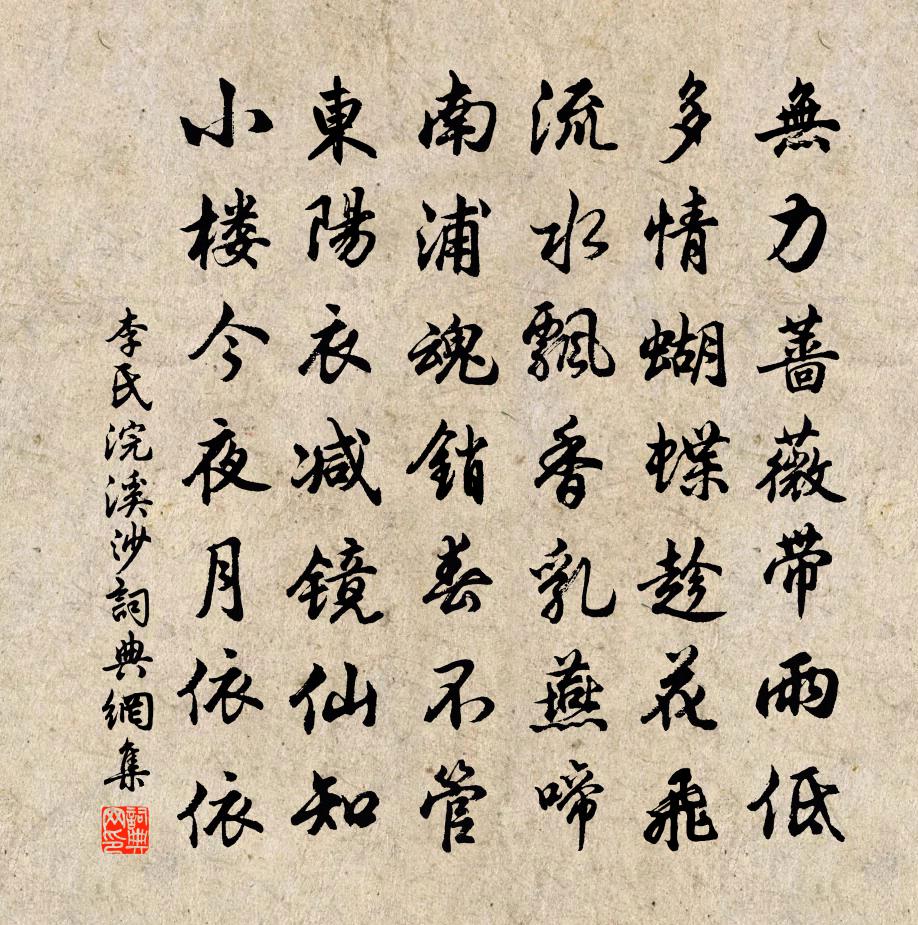 詩詞名句歷史字典書法欣賞書法字典國語詞典說文解字康熙字典古漢語字典標 題 作 者 詩 句 浣溪沙作者:李氏 朝代:宋代浣溪沙原文無力薔薇帶雨低。多情蝴蝶趁花飛。流水飄香乳燕啼。南浦魂銷春不管,東陽衣減鏡仙知。小樓今夜月依依。詩詞問答問:浣溪沙的作者是誰?答:李氏問:浣溪沙寫於哪個朝代?答:宋代問:浣溪沙是什麼體裁?答:詞李氏浣溪沙書法欣賞浣溪沙書法作品詩詞推薦水調歌頭(壽丘漕·九月初三)李劉〔宋代〕端正九秋月,今夜始生明。揚輝毓秀,飄然海上跨長鯨。認得靈均初度,直用望舒為御,重耀紫樞庭。何事乘槎使寄題劉仲叟澤州園亭梅堯臣〔宋代〕城臨太行谷,谷暖宜草木。既移洛陽花,又種阮家竹。五色雜黃紅,一林常翠綠。其間廣亭開,亦欲危榭築。春歸寄同志釋智圓〔宋代〕靜院無來客,相懷日又曛。數峰寒有雪,一榻靜眠雲。幾歡淳風喪,寧容俗態群。終期一相訪,對坐議新文。句舒坦〔宋代〕沙岸金籠樹,燈汀玉涌濤。感遇之卅八陳子昂〔唐代〕仲尼探元化。幽鴻順陽和。大運自盈縮。春秋遞來過。盲飆忽號怒。萬物相紛劘。溟海皆震盪。孤鳳其如何。偈頌七十六首釋師觀〔宋代〕朝朝相似,日日一般。年窮歲盡,盡底掀翻。依舊孟春猶寒。徐氏拜榮堂馬廷鸞〔宋代〕銀黌三組歸去來,繡衣朱轂胡為哉。富貴薰天無足道,人間至樂歸老萊。青衫隨分當彩衣,阿母一笑生兒痴。筍生虞美人·許時閉戶間疏散魏了翁〔宋代〕許時閉戶間疏散。風月無人管。自從陽律一番新。又把前迴風月、送西鄰。浮雲富貴非公願。只願公身健。更教剩句張洎〔宋代〕風物一堆灰。題蒼梧部陳執中〔宋代〕莫訝南方景物疏,為君聊且話蒼梧。地傾二面城池壯,江迸三流氣色麄。山畜火光因政出,石藏牛影為仙呼。官廳出京元好問〔金代〕從宦非所堪,長告欣得請。驅馬出國門,白日觸隆景。半生無根著,飄轉如斷梗。一昨隨牒來,六月阻歸省。城居逍遙詠宋太宗〔宋代〕世利貪拘束,欺心自不知。一真求意在,四敘絕參差。頓悟超諸聖,娛情改換痴。生前如似夢,願重細推之。上平江徐侍郎十絕句曾協〔宋代〕槐鼎虛班側席求,已應難遂寇恂留。不如黃髮貂蟬底,長占青雲最上頭。病因飲致方回〔宋代〕痰鎖卦喉管,瘡釘突齒齦。猥勤無算爵,肯顧不貲身。未即容殂謝,徒令受楚辛。果能深避地,何敢妄尤人。故太學徐君哀辭方回〔宋代〕蹈海沈江合比蹤,子陽蛙坎可能容。自聞門外韓擒虎,豈乏雲間陸士龍。信矣百年誰不死,哀哉三子亦相從。爛為戊申年七夕五絕薛映〔宋代〕銀河耿耿露溥溥,彩縷金針玉佩環。天媛貪忙為靈匹,幾時留巧與人間。夜句三首陳師道〔宋代〕老樹仍孤秀,秋蟾只獨明。何須夜來雨,郤聽枕前聲。清溪胡溥〔宋代〕楊柳汀洲綠四圍,沙中禽鳥雜相依。煙留群鷺和鷗臥,霞帶孤鴻與鶩飛。最高樓(壬辰壽王城山八十)劉辰翁〔宋代〕朱頂字,八十正平頭。添作八千秋。無能也自收郿塢,到今恨不貶潮州。看幾人,炎又冷,老還羞。也不學、太公四不可吟邵雍〔宋代〕言不可妄,行不可隳。命不可忽,天不可違。名句推薦人之初,性本善。王應麟《三字經·全文》 生前心已碎,死後性空靈。曹雪芹《紅樓夢·第五回》 近淚無乾土,低空有斷雲。杜甫《別房太尉墓》 今日雲景好,水綠秋山明。李白《九日》 欸乃一聲山水綠。回看天際下中流,岩上無心雲相逐柳宗元《漁翁》 欲窮千里目,更上一層樓。王之渙《登鸛雀樓》 問世間,情是何物,直教生死相許?元好問《摸魚兒·雁丘詞 / 邁陂塘》 君王遊樂萬機輕,一曲霓裳四海兵。李約《過華清宮》 福輕乎羽,莫之知載;禍重乎地,莫之知避。莊子《莊子·內篇·人間世》 皮之不存,毛將安傅?左丘明《左傳·僖公·僖公十四年》