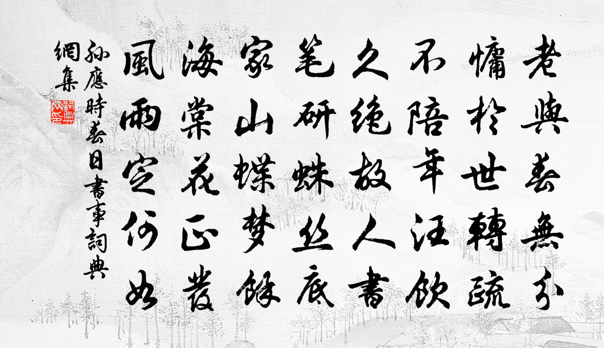 詩詞名句歷史字典書法欣賞書法字典國語詞典說文解字康熙字典古漢語字典標 題 作 者 詩 句 春日書事作者:孫應時 朝代:宋代春日書事原文老與春無分,慵於世轉疏。不陪年汪飲,久絕故人書。筆研蛛絲底,家山蝶夢餘。海棠花正發,風雨定何如。詩詞問答問:春日書事的作者是誰?答:孫應時問:春日書事寫於哪個朝代?答:宋代孫應時春日書事書法欣賞春日書事書法作品詩詞推薦後九首劉克莊〔宋代〕痛定偶成短夢,驚回如近清光。黃帕牙篦開卷,絳紗玉斧照廊。賜房玄齡李世民〔唐代〕太液仙舟迥,西園引上才。未曉徵車度,雞鳴關早開。聞晦庵罷宜春留南昌亟往見之將至貴溪逆風大趙蕃〔宋代〕下水放輕舠,真期快意遭。那知吾道蹇,還值逆風鏖。空闊初憑棹,淵洄竟倚篙。三山信非遠,弱水謾增勞。題石民瞻畫鶴溪圖仇遠〔宋代〕鶴溪近與練湖連,一境秋水清無邊。依稀淮岸瀟湘浦,慣見月虹書畫船。山翁幾年吳下客,溪草溪花未相識。筆床汝州梅堯臣〔宋代〕主人少聽我,為言風土殊。美哉面有顙,生此頸若壺。噫號無冬夏,歲禱無嗟吁。只憐郡池上,不異山林居。上巳觀花思友人邵雍〔宋代〕上巳觀花花意穠,今年正與昔年同。當時同賞知何處,把酒獨能對遠風。和穎上人南徐十詠其五望海樓梅堯臣〔宋代〕嘗聞觀蹄涔,詎識海水大。浩浩與天同,滔滔眾流會。平吞江作練,遠瀉河如帶。終日郡樓間,欲取長鯨鱠。紀事二十四首梁啓超〔清代〕匆匆羽檄引歸船,臨別更慳一握緣。今生知否能重見,一撫遺塵一惘然。和天休龍圖經句署懷舊憶道卿舍人並見寄宋祁〔宋代〕帝梧春早二鸞飛,羈羽孤翻得樹遲。今日並巢阿閣畔,依然同識舊棲枝。月下獨酌其一李白〔唐代〕花間一壺酒,獨酌無相親。舉杯邀明月,對影成三人。月既不解飲,影徒隨我身。暫伴月將影,行樂須及春。我歌用名世弟韻許月卿〔宋代〕大圭白璧男兒事,小酌青燈兄弟情。倚閣煙雲生另浦,高林風月滿疏欞。人生工業何損益,外物本心須重輕。志節錢塘江朱繼芳〔宋代〕極浦無高樹,蒼茫只遠空。潮來江水黑,日出海門紅。兩岸東西浙,千帆來去風。中原山色外,殘夢逐歸鴻。見歐制乾陽枋〔宋代〕那師萬里走東南,性學精微聞兩三。風月歸來深體認,簞瓢自樂細沈涵。岩前靜索龜圖秘,蜀口驚呼蟻戰酣。欲覓喜魯直還用前韻再作晁說之〔宋代〕梵志問故鄰,木蘭坐舊床。去恨已斷絕,歸意更淒涼。再用前韻袁甫〔宋代〕逾年政化一無成,敢道民和獄論清。不以旁人評得失,個別一點自知明。遇仙槎 和師韻馬鈺〔元代〕三光固下元,六度清中闕。九轉上元燈,照見長生月。無分晝夜明,光彩連綿發。顯出個胎仙,生死今番越。感詠十解寄呈楊安撫白玉蟾〔宋代〕風吹五花輦,露綴九光輿。夜半紅塵起,琴高失鯉魚。和許給事傷牛尚書劉斌〔唐代〕名臣不世出,百工之所求。況乃非常器,遭逢興運秋。符彩照千里,銓衡綜九流。經綸資百物,樽俎寄皇猷。韶濩湖上臥病喜陸鴻漸至李冶〔唐代〕昔去繁霜月,今來苦霧時。相逢仍臥病,欲語淚先垂。強勸陶家酒,還吟謝客詩。偶然成一醉,此外更何之。和溫仲舒寄贈四錫〔宋代〕桐江秋水錦鱗肥,閒釣煙波是見機。野步共游芳草徑,吟情對啟白雲扉。醉來拾筆題紅葉,睡覺憑欄望翠微。官滿名句推薦燕子斜陽來又去,如此江山。朱彝尊《賣花聲·雨花台》 恭者不侮人,儉者不奪人。孟子《孟子·離婁章句上·第十六節》 燕歌未斷塞鴻飛,牧馬群嘶邊草綠。李益《塞下曲·其一》 何意更觴昌歜酒,為君擊節一長歌。趙蕃《端午三首》 東風吹雨過青山,卻望千門草色閒。盧綸《長安春望》 近水樓台先得月,向陽花木易為春。蘇麟《斷句》 應知早飄落,故逐上春來。何遜《詠早梅 / 揚州法曹梅花盛開》 賭勝馬蹄下,由來輕七尺。李頎《古意》 近寒食人家,相思未忘苹藻香。史達祖《壽樓春·尋春服感念》 牧童歸去橫牛背,短笛無腔信口吹。雷震《村晚》