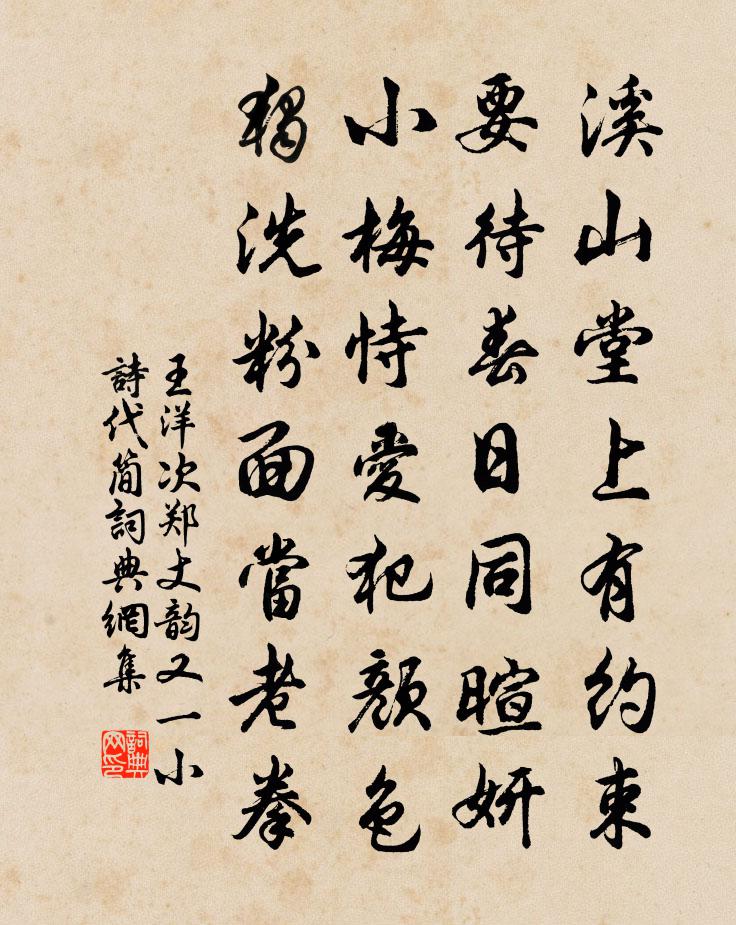 詩詞名句歷史字典書法欣賞書法字典國語詞典說文解字康熙字典古漢語字典標 題 作 者 詩 句 次鄭丈韻又一小詩代簡作者:王洋 朝代:宋代次鄭丈韻又一小詩代簡原文溪山堂上有約束,要待春日同暄妍。小梅恃愛犯顏色,獨洗粉面當老拳。詩詞問答問:次鄭丈韻又一小詩代簡的作者是誰?答:王洋問:次鄭丈韻又一小詩代簡寫於哪個朝代?答:宋代王洋次鄭丈韻又一小詩代簡書法欣賞次鄭丈韻又一小詩代簡書法作品詩詞推薦喜晴姜特立〔宋代〕日出天開眼,雲收見物華。不餐還自飽,無酒卻須賒。綠遍千絲柳,紅添幾樹花。如何酬造物,爛醉是生涯。雙池蘇軾〔宋代〕汧流入城郭,斖斖渡千家。不見雙池水,長漂十里花。臨終偈釋梵卿〔宋代〕五陰山頭乘駿馬,一鞭策起疾如飛。臨行莫問棲真處,南北東西隨處歸。風入松 辟兵青龍,食蘿蔔有感謝應芳〔元代〕青龍地脈土酥香。產玉似崑岡。可憐不入瑤池宴,到冰壺、風味淒涼。忽憶故園時序,春盤春酒羔羊。青絲生菜韭謁山齋先生易尚書樂雷發〔宋代〕淳熙人物到嘉熙,聽說山齋亦白髭。文字盡傳融水後,精神如戰辟雍時。靈椿終不爭朝菌,蓍草惟堪養壽龜。細嚼園中讀書高斯得〔宋代〕南樓幽簾雖粗適,猶嫌塵務妨閒逸。讀書老圃四無大,啼鳥落花春寂寂。試垂修綆汲義泉,更把長才斸玄窟。已無隱真洞趙汝造〔宋代〕鼎湖劍佩有遺蹤,唐室真人羽化同。九轉蕊成丹灶冷,五雲車去玉堂空。仙家日月蓬壺裡,塵世煙化夢寐中。徒有秋夜旅中戴復古〔宋代〕旅食思鄉味,砧聲起客愁。夜涼風動竹,人靜月當樓。浮世百年夢,他鄉幾度秋。店翁新酒熟,一醉更何求。寄谷山長老齊己〔唐代〕游遍名山祖遍尋,卻來塵世渾光陰。肯將的的吾師意,擬付茫茫弟子心。豈有虛空遮道眼,不妨文字問知音。滄浪挽林知縣朝奉詞戴栩〔宋代〕兩拜恩綸世澤垂,皇天老眼未嫌遲。百年忽失古君子,四海難逢今吏師。祖奠兼排遮道帳,影祠別寫憩棠碑。湖堤贈王居士王安石〔宋代〕武林王居士,與子俱學佛。以財供佛事,不自費一物。搗練子王哲〔元代〕水中金。忒幽深。玄玄妙妙怎生尋。*哩,哩*。從初得,到如今。西風時復送清音。*哩,哩*。記小圃花果二十首劉克莊〔宋代〕古有如瓶李,得之海上仙。如何阿戎輩,鑽核怕人傳。悼亡九首張耒〔宋代〕亦知存沒等浮雲,鮮笑多悲失道真。卻恐荒唐齊物叟,鼓盆真是已傷神。飲張壹齋月台潘璵〔宋代〕同上最高台,山頭晚色開。風才驅雨去,月漸出雲來。世事悲秋扇,吟情付酒杯。誰家砧杵動,寒計又相催。愧謝詩河湄鬼〔唐代〕我本邯鄲士,祇役死河湄。不得家人哭,勞君行路悲。石門陸游〔宋代〕昔讀康樂詩,夢到石門山。中有醉道士,倒珮落其冠。來游一一是,嵌岩如屋寬。噴薄三百尺,萬珠落珊珊。峭壁一百五日作宋祁〔宋代〕客舍已蕭寂,況逢龍忌辰。何煩申火禁,自有不黔人。次韻李商叟見示趙蕃〔宋代〕路熟江郊不待尋,每來真得慰余心。新詩自作彈丸羨,舊帖不教魚蠹侵。莫嘆高山與流水,難迷美玉及精金。頻年暮雲辭白玉蟾〔宋代〕雲行太虛中,薄暮何冥冥。仰望青松梢,上有白雪翎。千岸舞落葉,萬樹羅翠屏。流水咽寒澗,湛露濡香蘅。幽人名句推薦雲橫秦嶺家何在?雪擁藍關馬不前。韓愈《左遷至藍關示侄孫湘》 河水洋洋,北流活活詩經《碩人》 遠水難救近火,遠親不如近鄰。佚名《增廣賢文·上集》 君寵益嬌態,君憐無是非。王維《西施詠》 閏余成歲,律呂調陽。周興嗣《千字文·全文》 是是、非非謂之知,非是、是非謂之愚。荀子《荀子·修身》 斜陽照墟落,窮巷牛羊歸。王維《渭川田家》 春已歸來,看美人頭上,裊裊春幡。辛棄疾《漢宮春·立春日》 有桃花紅,李花白,菜花黃。秦觀《行香子·樹繞村莊》 美惡既殊,情貌不一,有溫良而為詐者,有外恭而內欺者,有外勇而內怯者,有盡力而不忠者。諸葛亮《將苑·卷一·知人性》