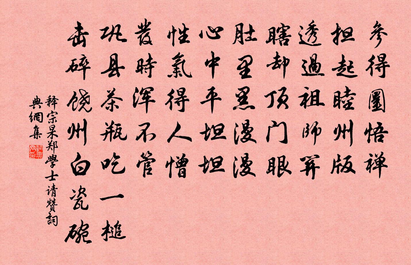 詩詞名句歷史字典書法欣賞書法字典國語詞典說文解字康熙字典古漢語字典標 題 作 者 詩 句 鄭學士請贊作者:釋宗杲 朝代:宋代鄭學士請贊原文參得圜悟禪,擔起睦州版。透過祖師關,瞎卻頂門眼。肚裡黑漫漫,心中平坦坦。性氣得人憎,發時渾不管。鞏縣茶瓶吃一槌,擊碎饒州白瓷碗。詩詞問答問:鄭學士請贊的作者是誰?答:釋宗杲問:鄭學士請贊寫於哪個朝代?答:宋代釋宗杲鄭學士請贊書法欣賞鄭學士請贊書法作品詩詞推薦和孫司門寄寬堂詩二首杜范〔宋代〕官喜文書少,塵迷歲月遷。豈無車可出,儻有約宜堅。傍水尋疎影,裁詩續舊編。孤山須竟日,去莫買遊船。太后閣春帖子趙湘〔唐代〕玉律生陽早,金鋪上日遲。枝間雙鵲語,應是報春祺。偈頌六十七首釋原妙〔宋代〕參須實參,悟須實悟。動轉施為,輝今耀古。若是操心不正,悟處不真。妝妝點點,鬥鬥釘釘,被人輕輕拶著,未托宿孤山道觀邵棠〔宋代〕弊裘相伴宿煙霞,燒藥余香戀碧紗。客里不知春幾許,起來和月數梅花。楊都官日嚴赴鄆州宋祁〔宋代〕連年三換左朱輪,正用台郎第二人。帷殿程書清刻永,家床添笏賜袍新。潤波仍跨洪河曲,敏政將肥瘠魯民。趣引題僧夢微房修睦〔唐代〕東海日未出,九衢人已行。吾師無事坐,苔蘚入門生。雨過閒花落,風來古木聲。天台頻說法,石壁欠題名。偈頌八十七首釋慧開〔宋代〕今朝三月初十,擊鼓禪徒畢集。欲知時節因緣,雨落階頭便濕。會即各自歸堂,不地何勞久立。送劉大諫赴漳州四首兼寄建州太守趙左司仲並〔宋代〕胄甲漢中壘,聲高昔諫垣。幾年清議在,萬事此心存。臨遣再三意,褒嘉數十言。疾驅公未可,半路趣回轅。夢與數客劇飲或請賦詩予已大醉縱筆書一絕覺陸游〔宋代〕高談雄辯憑陵酒,豪竹哀絲蹴蹋春。占斷名園排日醉,不教虛作太平人。送高才卿守永康二首洪咨夔〔宋代〕同社紛紛早上坡,一麾獨愛晚婆娑。矜春桃李好能幾,飽雨稻梁收更多。管攝三才還正大,陶鎔萬象是中和。西風挽鬍子瑞孫應時〔宋代〕耆舊長庚月,斯人馬少游。平生自繩尺,方寸不戈矛。細細巾箱字,琅琅燈火秋。子孫森滿眼,齎志可無酬。和馬少伊韻范成大〔宋代〕氣壓伊吾一劍鳴,風生銅柱百蠻驚。君家自有堂堂陣,我欲周旋恐曳兵。戲書歐陽修〔宋代〕支離多病嘆衰顏,賴得群居一笑歡。人老思家甚年少,身閒泥酒過春寒。來時御柳天街凍,歸去梨花禁◇殘。縱使桓妒妻梅堯臣〔宋代〕昔聞桓司馬,娶妾貌甚都。其妻南郡主,悍妒誰與俱。持刀擁群婢,逕往將必屠。妾時在窗前,解鬟臨鏡梳。鬒髮京邸漫題馬廷鸞〔宋代〕不遑將母兄嗟弟,無能以為爾與余。獨坐小樓風雨急,江南歲晚雁何如。烈女李三行胡天游〔清代〕大海何漫漫,千年不能移。太山自言高,精衛銜石飛。朝見精衛飛,暮見精衛飛。吐血填作塸,一旦成路蹊。豈唯次韻魏君寶光黃雲觀古風曹彥約〔宋代〕重湖鏡展心生涼,五老壁立背負芒。中間只作如許屋,一觀雖小意堂堂。書生相業線不絕,故侯墨妙燈不滅。與山清隱齋飲酒徐沖淵〔宋代〕暖風薄衣輕煙散,晴日遊絲飛絮亂。竹窗午夢啼鳥驚,松軒晚飲幽人喚。一壺碧酒如春濃,萬斛羇愁若冰泮。興來跋禪會圖釋紹曇〔宋代〕禪既強名,會亦妄立。一火無知,打棚雜劇。百樣喬妝誑世人,千般怪語瞞天日。若是本色行家,不打這般鼓笛。湯泉洪咨夔〔宋代〕水府燃犀處,扶桑浴日時。能觀雷復地,始信坎生離。淨垢元無著,溫涼祗自知。驪山殷鑑在,莫受阿環緇。名句推薦流芳未及歇,遺掛猶在壁。潘安《悼亡詩三首》 寸寸微雲,絲絲殘照,有無明滅難消。賀雙卿《鳳凰台上憶 * ·寸寸微雲》 貧而無諂,富而無驕孔子弟子《論語·學而篇》 惟順於父母,可以解憂。孟子《孟子·萬章章句上·第一節》 將軍金甲夜不脫,半夜軍行戈相撥,風頭如刀面如割。岑參《走馬川行奉送出師西征 / 走馬川行奉送封大夫出師西征》 閣雪雲低,卷沙風急,驚雁失序。吳文英《永遇樂·探梅次時齋韻》 為君憔悴盡,百花時。溫庭筠《南歌子·倭墮低梳髻》 天涯倚樓新恨,楊柳幾絲碧。晏幾道《六么令·雪殘風信》 佇倚危樓風細細。望極春愁,黯黯生天際。柳永《蝶戀花·佇倚危樓風細細》 烽火照西京,心中自不平。楊炯《從軍行》