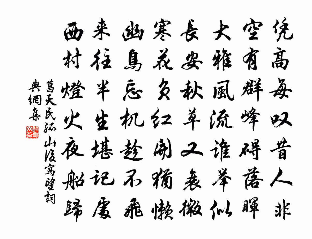 詩詞名句歷史字典書法欣賞書法字典國語詞典說文解字康熙字典古漢語字典標 題 作 者 詩 句 孤山後寫望作者:葛天民 朝代:宋代孤山後寫望原文憑高每嘆昔人非,空有群峰礙落暉。大雅風流誰舉似,長安秋草又衰微。寒花負紅開猶懶,幽鳥忘機趁不飛。來往半生堪記處,西村燈火夜船歸。詩詞問答問:孤山後寫望的作者是誰?答:葛天民問:孤山後寫望寫於哪個朝代?答:宋代葛天民孤山後寫望書法欣賞孤山後寫望書法作品詩詞推薦元宵燈謎曹雪芹〔清代〕朝罷誰攜兩袖煙?琴邊衾里無兩緣。嘵籌不用雞人報,五更無煩侍女添。焦首朝朝還暮暮,煎心日日復年年。光陰木蘭花慢(生日謝寄居見任官載酒三十七歲)魏了翁〔宋代〕怕年來年去,漸雅志、易華顛。嘆夢裡青藜,間邊銀信,望外朱轓。十年竟成何事,雖萬鍾、於我曷加焉。海上潮芥庵自述李洪〔宋代〕不厭城隅僻,新成芥子庵。負暄真化國,空想極毗嵐。日月須彌頂,風雲鈷鉧潭。冬窮數九九,玄旨扣三三。何假包顒叟輓詞二首葉適〔宋代〕風沙江上宅,斥鹵望中村。密竹元遮徑,崇蘭早映門。笑談看磊落,材力可騰掀。誰復知心事,滄波霧雨昏。理考輓詞陳杰〔宋代〕藝祖的孫傳,仁皇享國年。思文重揭日,皇武再中天。多難扶三正,彌留痛八埏。乾坤理最大,高益帝王前。次韻毛君山房即事十首蘇轍〔宋代〕禽哢秋來不復圓,桐陰霜後亦成穿。黃花強欲招酣飲,白髮偏工報老年。薌林五十詠企疏堂楊萬里〔宋代〕堂上清如水,薌林對兩疏。只今詩社裡,盡作企疏圖。石州慢(九日)秦觀〔宋代〕深院蕭條,滿地蒼苔,一叢荒菊。含霜冷蕊,全無佳思,向人搖綠。客邊節序,草草付與清觴,孤吟只把羈懷觸。開府潞公太師得謝西歸謹賦七言四韻詩五首拜蘇頌〔宋代〕官崇真是帝王師,八十歸休亦未遲。不似孔光辭位日,早於姜望出封時。儀形昔已圖麟閣,稿草今應集鳳池。故府赤壁賦中四句取之無禁陳普〔宋代〕竹聲梅影芰荷香,滿檐連車不是贓。無奈浮雲並糞土,百年瞬息萬人忙。天仙子張孝祥〔宋代〕三月灞橋煙共雨。拂拂依依飛到處。雪逑輕揚弄精神,撲不住。留不住。常系柔腸千萬縷。只恐舞風無定據。容易漁家傲(旅中遠思)趙長卿〔宋代〕客里情懷誰可表。淒涼舉目知多少。強飲強歌還強笑。心悄悄。從頭徹底思量了。當日相逢非草草。果然恩愛成煩八哀詩故右僕射相國張公九齡杜甫〔唐代〕相國生南紀,金璞無留礦。仙鶴下人間,獨立霜毛整。矯然江海思,復與雲路永。寂寞想土階,未遑等箕潁。上君郊居秋日酬奚贊府見寄楊巨源〔唐代〕繁菊照深居,芳香春不如。聞尋周處士,知伴庾尚書。日晚汀洲曠,天晴草木疏。閒言揮麈柄,清步掩蝸廬。野老和韓丞相玉汝登見山閣李復〔宋代〕丹青岌業冠鰲丘,地辟天開洗百憂。萬竅倚空號一噫,八川盤野會千流。浮雲晚日悲余翠,廢苑荒陵怨暮秋。自昔浪淘沙劉志淵〔元代〕休執相皆空。徒滯頑空。勞勞不見有中空。空里混成神妙體,空乃不空。此理是真空。物物明空。念無念念不爭空普慈郡池板橋頹壞更為石橋郭印〔宋代〕蓮塘十畝方,中作長橋渡。荒荒歲月老,烈烈風雨蠹。板面拆已穿,梁脊橈而腐。我來日曳杖,往往不能步。平生有感葛紹體〔宋代〕過了青梅杏子紅,擔頭和雨賣怱怱。催人節物如流水,流到東頭更向東。惜黃花(重陽)史浩〔宋代〕秋光將老。黃花開早。露浥清曉,金錢萬疊猶小。簪遍碧雲鬟,壓倒烏紗帽。更把來、玉觴同釂。過□添爐鼎,朱登湘陰北寺江亭孔武仲〔宋代〕古縣峨新剎,孤亭占上頭。野苔侵坐綠,江水帶天流。絲斷湘靈瑟,苹荒帝子洲。人寰真是夢,頃刻已千秋。名句推薦漸行漸遠漸無書,水闊魚沉何處問。歐陽修《玉樓春·別後不知君遠近》 美人慵翦上元燈,彈淚倚瑤瑟。朱敦儒《好事近·春雨細如塵》 已知泉路近,欲別故鄉難。夏完淳《別雲間》 何處可為別,長安青綺門。李白《送裴十八圖南歸嵩山二首》 秋風清,秋月明,落葉聚還散,寒鴉棲復驚。李白《三五七言 / 秋風詞》 不知何歲月,得與爾同歸?韋承慶《南中詠雁詩》 賭勝馬蹄下,由來輕七尺。李頎《古意》 桃花一簇開無主,可愛深紅愛淺紅?杜甫《江畔獨步尋花·其五》 對朝雲靉靆,暮雨霏微,亂峰相倚。黃庭堅《醉蓬萊》 萬里想龍沙,泣孤臣吳越張元乾《石州慢·己酉秋吳興舟中作》