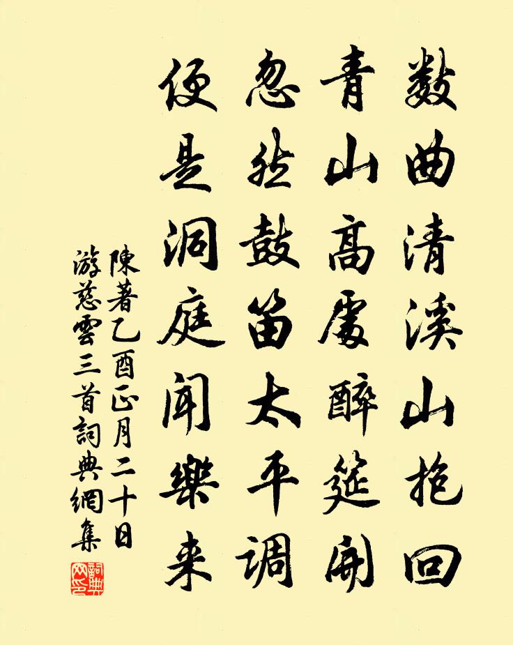 詩詞名句歷史字典書法欣賞書法字典國語詞典說文解字康熙字典古漢語字典標 題 作 者 詩 句 乙酉正月二十日游慈雲三首作者:陳著 朝代:宋代乙酉正月二十日游慈雲三首原文數曲清溪山抱回,青山高處醉筵開。忽然鼓笛太平調,便是洞庭聞樂來。詩詞問答問:乙酉正月二十日游慈雲三首的作者是誰?答:陳著問:乙酉正月二十日游慈雲三首寫於哪個朝代?答:宋代陳著乙酉正月二十日游慈雲三首書法欣賞乙酉正月二十日游慈雲三首書法作品詩詞推薦絕句六十四首張伯端〔宋代〕雪山一味好醍醐,傾入東陽造化爐。若過崑崙西北去,張騫方得見 * 。洞仙歌蔡伸〔宋代〕鶯鶯燕燕。本是于飛伴。風月佳時阻幽願。但人心堅固後,天也憐人,相逢處、依舊桃花人面。綠窗攜手,簾幕重寺莊范成大〔宋代〕大麥成苞小麥深,秧田水滿綠浮針。今年一飽全無慮,寬盡歸舟去客心。念奴嬌續雪谷〔宋代〕砌紅慵掃,問東風、應念西園廖落。簾卷垂陽鶯囀巧,才見還因飛卻。拈指光陰,關心節序,總在鞦韆索。翻翻雙陪范宣城北樓夜宴張祜〔唐代〕華軒敞碧流,官妓擁諸侯。粉項高叢鬢,檀妝慢裹頭。亞身摧蠟燭,斜眼送香球。何處偏堪恨,千回下客籌。頌古一百首釋智愚〔宋代〕青山白雲,碧溪蘿月。畫虎成狸,只得一橛。依韻酬常循州徐夤〔唐代〕早年花縣拜潘郎,尋忝飛鳴出桂堂。日走登天長似箭,人同紅樹豈經霜。帆分南浦知離別,駕在東州更可傷。公論頌古二十一首釋正覺〔宋代〕 * 不眨眼,救人須出手。論實不論虛,合升始為斗。長安清明韋莊〔唐代〕蚤是傷春夢雨天,可堪芳草更芊芊。內官初賜清明火,上相閒分白打錢。紫陌亂嘶紅叱撥,綠楊高映畫鞦韆。遊人次韻趙德麟雪中惜梅且餉柑酒三首蘇軾〔宋代〕閬苑千葩映玉宸,人間只有此花新。飛霙要欲先桃李,散作千林火迫春。酬劉猛見送元稹〔唐代〕種花有顏色,異色即為妖。養鳥惡羽翮,剪翮不待高。非無剪傷者,物性難自逃。百足雖捷捷,商羊亦翹翹。伊余晚秋郊居八首趙蕃〔宋代〕九日黃花信昔談,是身何自見江南。故今開晚方為貴,失所胡為浪不堪。觀陳諫議祠有感張致遠〔宋代〕權門車馬日騑騑,獨犯天顏咫尺威。願借君王斬馬劍,何慚妻子泣牛衣。丹書到死成羅織,青史平生賴發揮。遙望青玉案 癸未道間李曾伯〔宋代〕棲鴉啼破煙林暝。把旅夢、俄驚醒。猛拍征鞍登小嶺。峰迴路轉,月明人靜,幻出清涼境。馬蹄踏碎瓊瑤影。任露思佳客·閏中秋吳文英〔宋代〕丹桂花開第二番。東籬展卻宴期寬。人間寶鏡離仍合,海上仙槎去復還。分不盡,半涼天。可憐閒剩此嬋娟。素娥船子和尚贊釋慧遠〔宋代〕老手當年靠夾山,全機喪盡結深冤。父南子北家何在,撥轉天關地軸翻。牡丹開已數日方盛麗未艾也成二絕錢時〔宋代〕未到牡丹春未好,花開恰莫怨春遲。金沙玉板相扶擁,正是東君極盛時。菊李嶠〔唐代〕玉律三秋暮,金精九日開。榮舒洛媛浦,香泛野人懷。靃靡寒潭側,丰茸曉岸隈。黃花今日晚,無復白衣來。書事二首劉克莊〔宋代〕空空都沒一行書,行行徒矜九尺軀。面上帶妖真可恥,腳中有鬼不容扶。末年鐵拐傳仙訣,他日金錐抉冢珠。泉下雜詩李濤〔唐代〕滔滔東流水,赴海無歸期。亭亭右轉日,今茲復來茲。人生寄天地,百年七十稀。思慮復營營,恐為達士嗤,名句推薦萬事莫貴於義。墨子《墨子·47章 貴義》 過江千尺浪,入竹萬竿斜。李嶠《風》 世事洞明皆學問,人情練達即文章。曹雪芹《紅樓夢·第五回》 公生明,偏生暗荀子《荀子·不苟》 碧虛無雲風不起,山上長松山下水。劉禹錫《八月十五夜桃源玩月》 籬落疏疏一徑深,樹頭花落未成陰。楊萬里《宿新市徐公店》 軍歌應唱大刀環,誓滅胡奴出玉關。徐錫麟《出塞》 客子過壕追野馬,將軍韜箭射天狼。李夢陽《秋望》 寒食不多時,牡丹初賣。晁沖之《感皇恩·寒食不多時》 報導山中去,歸時每日斜皎然《尋陸鴻漸不遇》