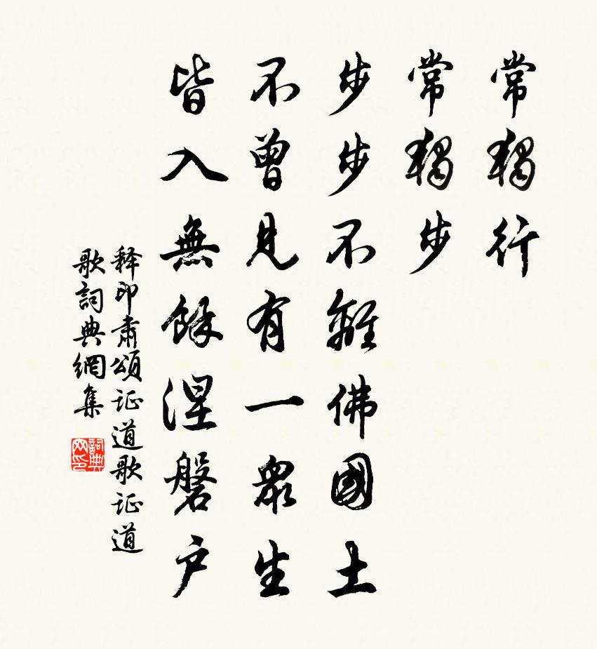 詩詞名句歷史字典書法欣賞書法字典國語詞典說文解字康熙字典古漢語字典標 題 作 者 詩 句 頌證道歌證道歌作者:釋印肅 朝代:宋代頌證道歌證道歌原文常獨行,常獨步,步步不離佛國土。不曾見有一眾生,皆入無餘涅磐戶。詩詞問答問:頌證道歌證道歌的作者是誰?答:釋印肅問:頌證道歌證道歌寫於哪個朝代?答:宋代釋印肅頌證道歌證道歌書法欣賞頌證道歌證道歌書法作品詩詞推薦武侯王令〔宋代〕三顧雖然志意深,出非由道此何心。平時胸腹能多少,且與群兒梁父吟。上廣東運副馬少卿壽十口號曾豐〔宋代〕壽星瑞世現光明,俄轉桐江作客星。千載嚴陵後身出,風標氣概兩亭亭。脫京口出隘難文天祥〔宋代〕袖攜匕首學銜枚,橫渡城關馬欲猜。夜靜天昏人影散,北軍鼾睡正如雷。公子歐陽修〔宋代〕黃山開苑獵初回,絳樹分行舞遞來。下馬春場雞◇距,鳴弦初日雉驚媒。犀投博齒呼成白,橋隔車音聽似雷。不問吳克明廣文見和再用韻答之辛棄疾〔宋代〕彼茁江漢姿,當春風露足。美芹或以獻,深愧野人腹。君詩窮草木,命騷可奴僕。更憐無俗韻,愛竹不愛肉。渠儂銀城舊縣李士會〔宋代〕人民城郭駭俱非,從此西遷西復西。曾是萬家雄井邑,依然一段好山溪。津無可鎖沈江渚,市不聞鍾委草泥。碑碣玉女搖仙佩 次重陽韻馬鈺〔元代〕我今得遇,把氣財並酒色,心中常滌。縛馬擒猿,牢封緊閉。唯恐精光覷滴。漸漸知空寂。況余今已向,下坡年曆大理黃丞宗旦通判潁州楊億〔宋代〕曾隨征虜出蕭關,又案公田汝水灣。南畝萬箱增地利,西清三刻對天顏。一麾通守彤襜貴,九棘憑刑赤筆閒,閭里感遇二十五首張耒〔宋代〕風霜凜已高,歲月逝雲邁。蕭條陋巷士,藜藿守耿介。欲吐胸中語,旁人笑言大。漆室非近憂,宜遭鄰里怪。裴端公使院,賦得隔簾見春雨包何〔唐代〕細雨未成霖,垂簾但覺陰。唯看上砌濕,不遣入檐深。度隙沾霜簡,因風潤綺琴。須移戶外屨,檐溜夜相侵。同年楊謹仲示薌林諸帖皆以老杜相期惟童敏德周必大〔宋代〕過江人物向汪曾,一世龍門未易登。常恐斯文無砥柱,獨推佳句有師承。波瀾正使來西蜀,廉陛何妨逼少陵。天遣補樂府十篇帝陶唐氏之樂歌曹勛〔宋代〕萬方億寧,亦莫我敢承。如天運,如日之升。孰知其極兮,不可得而名不可得而稱。挽周希舜二首吳芾〔宋代〕傾蓋如前日,分攜忽累年。我方來舊治,公已辟新阡。宿草荒三徑,寒雲慘一川。善人無復見,回首已茫然。乙巳暮春初六日晚對新月汪莘〔宋代〕春來風雨耿黃昏,初見青青月一痕。憶自消魂南浦後,不禁描出向前村。滿江紅慢姬翼〔元代〕一片頑心,何樓子、無窮生滅。被化機、般弄馳騁,許多顛*。販骨如山成底事, * 似海難超越。痛亘初、靈物端午詞御閣晏殊〔宋代〕五彩絲長系臂初,萬年芳樹影扶疏。豈勞方士標神篆,自有真靈衛帝居。再題小西湖姚勉〔宋代〕深深晴日漲湖煙,開著蓬窗飽看蓮。只怕客來童放鶴,又催花里棹歸船。次韻李侯喜雨牟巘五〔宋代〕誰似當年召信臣,天教來此活疲民。水鄉怕旱相傳古,甘澍隨車總是春。坐看豐登成樂歲,只將愷悌對明神。已聞句馮京〔宋代〕當時已自傳衣缽,羞愧猶為食肉僧。上塘值清明八首曹勛〔宋代〕客路逢寒食,清明未到家。起居須藥餌,飲食任魚暇。水淨垂垂柳,風遲艷艷花。興來隨處樂,不復問年華。名句推薦耕犁千畝實千箱,力盡筋疲誰復傷?李綱《病牛》 一場愁夢酒醒時,斜陽卻照深深院。晏殊《踏莎行·小徑紅稀》 槲葉落山路,枳花明驛牆。溫庭筠《商山早行》 何時一樽酒,重與細論文。杜甫《春日憶李白》 謗書盈篋不復辯,脫身來看江南山。謝逸《送董元達》 本來無一物,何處惹塵埃!惠能《菩提偈》 修身以敬,勿托以尊。房玄齡《晉書·列傳·第八章》 藍橋何處覓雲英。只有多情流水、伴人行。蘇軾《南歌子·寓意》 見楊柳飛綿滾滾,對桃花醉臉醺醺。王實甫《十二月過堯民歌·別情》 光陰荏苒,日月如梭。施耐庵《水滸傳·第六十二回》
