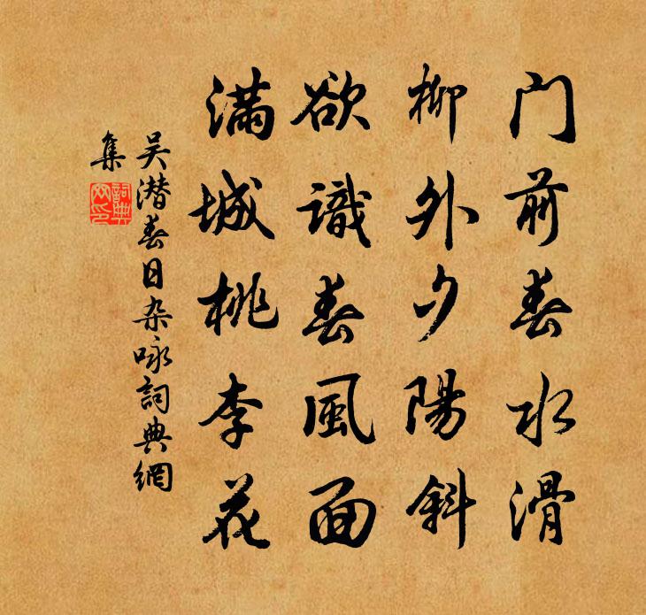 詩詞名句歷史字典書法欣賞書法字典國語詞典說文解字康熙字典古漢語字典標 題 作 者 詩 句 春日雜詠作者:吳潛 朝代:宋代春日雜詠原文門前春水滑,柳外夕陽斜。欲識春風面,滿城桃李花。詩詞問答問:春日雜詠的作者是誰?答:吳潛問:春日雜詠寫於哪個朝代?答:宋代問:吳潛的名句有哪些?答:吳潛名句大全吳潛春日雜詠書法欣賞春日雜詠書法作品詩詞推薦看澗水自警張鎡〔宋代〕昔往靈隱山,寺前貪看水。木陰鑒暉彩,泓渟絕塵滓。游鯈慣餅餌,敲欄聚如蟻。坐玩豈不佳,直須波浪起。開閘春日小園即事十首方回〔宋代〕長憶江湖看雨時,插天掛尾玉龍垂。歸來老手今無用,養小魚蝦掘小池。題名琉璃院今改名景祥院徐夤〔唐代〕一條溪繞翠岩隈,行腳僧言勝五台。農罷樹陰黃犢臥,齋時山下白衣來。松因往日門人種,路是前生長老開。三卷春中湘中題嶽麓寺僧舍羅隱〔唐代〕蟾宮虎穴兩皆休,來憑危欄送遠愁。多事林鶯還謾語,薄情邊雁不回頭。春融只待乾坤醉,水闊深知世界浮。欲共持節和王樞密三首曹勛〔宋代〕稍陪酬唱與榮觀,聲並琳琅和八鑾。可但文華迎日麗,自然符采照人寒。笑談殊喜親犀麈,接侍終慚戴鶡冠。公等送侄孫周上人歸剡余亦入吳門釋行海〔宋代〕三十餘年不在家,齒搖發白眼昏花。如今送子東歸去,心逐征帆過白沙。送王殿丞知眉山縣司馬光〔宋代〕疇昔侍嚴親,俱為采服人。游蘭已多益,得桂復同春。風樹悲馭異,萍波聚散頻。峽中盡遺事,何處不沾巾。走筆酬黎德夫釋紹嵩〔宋代〕索寞門長掩,圖書是舊貧。無因從發藥,有命懶謀身。寥落悲前事,英雄嘆後塵。裁詩托幽思,幽思忽相親。醉花陰(生日)王之望〔宋代〕弧門此日猶能記。嘆居諸難系。彈指片聲中,不覺流年,五十還加二。兒童壽酒邀翁醉。笑欣欣相戲。休畫老人星晚泊三高亭葛紹體〔宋代〕不釣鱸魚只釣鰲,一絲彈壓幾風濤。城西山影蘸空碧,星斗逼人相與高。句樊賓〔宋代〕恥見橫人欺楚約,忍聞稚子勸君行。同伯潛諸公聯騎出城東南亞次衫字韻廖行之〔宋代〕怯曉征衣襲小衫,山頭淡月照聯驂。晴光忽散湘江上,秋色疑連夢澤南。後約吹香舒藻思,同游載酒款犀談。遙知句張釜〔宋代〕冥搜無好語。李侍郎修路陳袖〔宋代〕路余百里兩山間,水驛山程總不安。誰把千金平滑蹬,免教一葉委驚灘。行人感嘆何時已,賢守功名百世看。次第真宗奉聖祖玉清昭應宮十一首真宗〔宋代〕無骨之內,強名之名。監觀萬宇,統治九清。真期保祐,瑞命昭明。乾乾翼翼,祗答財成。贈滕宗諒呂岩〔唐代〕華州回道人,來到岳陽城。別我游何處,秋空一劍橫。義靈廟迎享送神曲游九言〔宋代〕北固山兮朝暉,鼛鼓奏兮吹篪。盼夫君兮來止,紛老稚兮扶攜。斂芳馨兮薦豆,君弗語笑兮我懷淒。聊相羊兮引釂莫田劉子翬〔宋代〕打麥蓬蓬響莫田。兒童拾穟笑爭先。市頭米價新來減,一醉瓷甌五六錢。挽樓文昌母安康太夫人汪氏孫應時〔宋代〕中外三孤遺,康寧百歲期。榮於列女傳,美矣二南詩。蟬蛻無餘戀,龍淵有合時。十經湯沐賜,風木更須悲。答公孫及李復〔宋代〕輾轉臥不周,遙夜何漫漫。娟娟竹間月,照我影零亂。繁蟲哀陰壁,輕風泛幃幔。節物自感人,寤言興永嘆。頹坐名句推薦去年上巳洛橋邊,今年寒食廬山曲。宋之問《寒食江州滿塘驛》 海畔尖山似劍鋩,秋來處處割愁腸。柳宗元《與浩初上人同看山寄京華親故》 離恨又迎春,相思難重陳。和凝《菩薩蠻·越梅半拆輕寒里》 古戍三秋雁,高台萬木風。屈大均《魯連台》 曉月墜,宿雲微,無語枕頻欹。李煜《喜遷鶯·曉月墜》 冥冥寒食雨,客意向誰親?劉一止《冥冥寒食雨》 同心一人去,坐覺長安空。白居易《別元九後詠所懷》 志士仁人無求生以害仁,有殺身以成仁。孔子弟子《論語·衛靈公篇》 婿為燕國王,身被詔獄加。李白《秦女休行》 高山安可仰,徒此揖清芬李白《贈孟浩然》