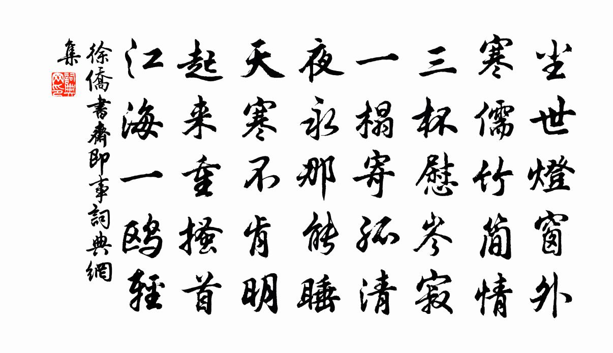 詩詞名句歷史字典書法欣賞書法字典國語詞典說文解字康熙字典古漢語字典標 題 作 者 詩 句 書齋即事作者:徐僑 朝代:宋代書齋即事原文塵世燈窗外,寒儒竹簡情。三杯慰岑寂,一榻寄孤清。夜永那能睡,天寒不肯明。起來重搔首,江海一鷗輕。詩詞問答問:書齋即事的作者是誰?答:徐僑問:書齋即事寫於哪個朝代?答:宋代徐僑書齋即事書法欣賞書齋即事書法作品詩詞推薦白髮嘆五邁〔宋代〕日月轉四時,團團輾清昊。人生一世間,輕塵棲弱草。寒暑不相貸,容鬢豈常好。嗟予涉世紛,聞道苦不早。塵勞泊頭陀寺蘇泂〔宋代〕世上身名孰是非,維舟日日釣魚磯。長江天闊不知處,夏口青山人夜歸。鵲橋仙 讀畫齋叢書本元草堂詩餘卷上滕賓〔元代〕斜陽一抹,青山數點。萬里澄江如練。東風吹落櫓聲遙,又喚起、寒雲一片。殘鴉古渡,荒雞村店。漸覺樓頭人遠花時與錢尊師同醉因成二十字韓偓〔唐代〕橋下淺深水,竹間紅白花。酒仙同避世,何用厭長沙。聖人之孝十首湯林同〔宋代〕奉先思孝也,不祀豈其情。以至使毫眾,而甘為葛耕。時事劉克莊〔宋代〕問訊班春守,牢辭餽歲人。翁年十分老,時事一番新。和季弟韻二十首劉克莊〔宋代〕何處有禾三百廛,芋區止在舍西邊。室如蒙叟生虛白,詩賽唐人選極玄。耐久不如常友石,固窮未肯便兄錢。春晴盆池王之道〔宋代〕剜苔得古鑒,湛湛清不渾。大哉壺中天,勿與俗子言。誰能時汲井,注茲老瓦盆。欲觀從容鯈,無羨橫海鯤。雜曲歌辭。舞馬千秋萬歲樂府詞張說〔唐代〕金天誕聖千秋節,玉醴還分萬壽觴。試聽紫騮歌樂府,何如騄驥舞華岡。連騫勢出魚龍變,蹀躞驕生鳥獸行。歲歲滿江紅(吳江秋夜)汪元量〔宋代〕一個蘭舟,雙桂槳、順流東去。但滿目、銀光萬頃,淒其風露。漁火已歸鴻雁汊,棹歌更在鴛鴦浦。漸夜深、蘆葉阮郎歸張掄〔宋代〕豪家大廈敞千楹。風搖玉柄輕。金盆弄水復敲冰。熱從何處生。低草舍,小茅亭。如何安此身。元來一念靜無塵。九月二十五日雞鳴前起待旦陸游〔宋代〕堪笑枯腸漸畏茶,夜闌坐起聽城笳。爐溫自撥深培火,燈暗猶垂半結花。斷夢不妨尋枕上,孤愁還似客天涯。掃塵侍宴桃花園詠桃花應制蘇頲〔唐代〕桃花灼灼有光輝,無數成蹊點更飛。為見芳林含笑待,遂同溫樹不言歸。過萬丈潭觀山呈圓機晁說之〔宋代〕棄捐蹤跡盡悠悠,山水之恩亦太優。成熟此生無再辱,發揚何事敢他求。乘閒今日聯高足,就隱明年獨遠遊。潭面次陳一鶚韻張九成〔宋代〕大道若坦塗,踐履何早晚。榛荊蔽不掃,日夜勞勤墾。聖門一以披,即日到堂閫。但辦不已心,此道誰雲遠。譬如侯革以詩風示次韻晁公溯〔宋代〕少陵有幽事,止共阮生論。把酒與賢樂,為邦漸主恩。欻傾賓客坐,知出聘君門。勝識中郎面,區區對虎賁。子暢慰曹用贈沅陵韻作詩見示亦用韻奉酬趙蕃〔宋代〕元佑於今幾故家,要尋遺事渺難涯。虛名可愧鐵爐冒,實美當知丙穴嘉。柱後惠文余故窘,伍符尺籍子無嗟。神仙詠閒姜特立〔宋代〕一年閒有十年功,十歲如將百歲同。此去得閒猶未已,向前日月盡壺中。絕句二首孫發〔宋代〕林亭長夏愛濃陰,來引茶甌一散襟。忽去卻來蜂個個,自啼還住鳥深深。金剛隨機無盡頌非說所說分第二十一釋印肅〔宋代〕即自謗如來,何因得辨才。和風三二月,花發為誰開。名句推薦朝作輕寒暮作陰,愁中不覺已春深。屈大均《壬戌清明作》 路遙知馬力,日久見人心。佚名《增廣賢文·上集》 末路驚風雨,窮邊飽雪霜文天祥《除夜》 無處不傷心,輕塵在玉琴。納蘭性德《菩薩蠻·蕭蕭幾葉風兼雨》 別有幽愁暗恨生,此時無聲勝有聲。白居易《琵琶行 / 琵琶引》 往者不可諫,來者猶可追。孔子弟子《論語·微子篇》 尺蠖之屈,以求信也;龍蛇之蟄,以存身也。佚名《易傳·繫辭傳下·第五章》 恨入空帷鸞影獨,淚凝雙臉渚蓮光,薄情年少悔思量。顧敻《浣溪沙·荷芰風輕簾幕香》 抽刀斷水水更流,舉杯銷愁愁更愁。李白《宣州謝朓樓餞別校書叔雲 / 陪侍御叔華登樓歌》 微風搖紫葉,輕露拂朱房。沈約《詠芙蓉》