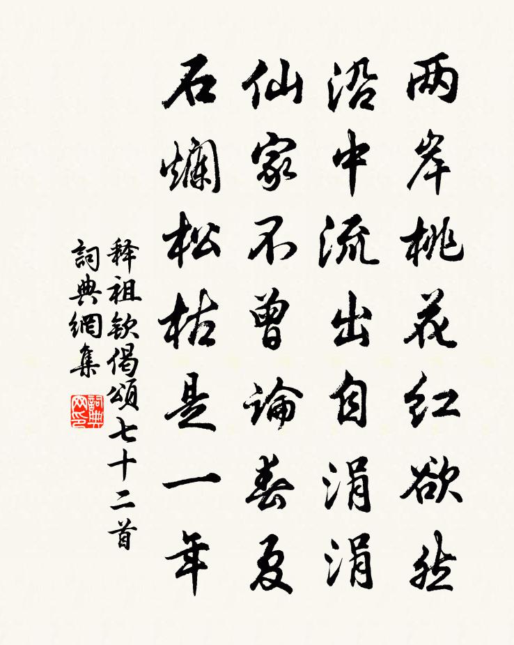 詩詞名句歷史字典書法欣賞書法字典國語詞典說文解字康熙字典古漢語字典標 題 作 者 詩 句 偈頌七十二首作者:釋祖欽 朝代:宋代偈頌七十二首原文兩岸桃花紅欲然,沿中流出自涓涓。仙家不曾論春夏,石爛松枯是一年。詩詞問答問:偈頌七十二首的作者是誰?答:釋祖欽問:偈頌七十二首寫於哪個朝代?答:宋代釋祖欽偈頌七十二首書法欣賞偈頌七十二首書法作品詩詞推薦送蜀僧去塵蘇洵〔宋代〕十年讀《易》費膏火,盡日吟詩愁肺肝。不解丹青追世好,欲將芹芷薦君盤。誰為善相寧嫌瘦,復有知音可廢彈。漁村雜句十首薛嵎〔宋代〕猿鶴何曾肯受羈,仙來亭畔立多時。物情未到忘機地,步步行行只自疑。張升甫惠新筍走筆代簡謝之強至〔宋代〕粉籜迎霜嫩更勻,中廚未有許嘗新。明朝便好供佳客,只恨杯羹欠紫蓴。雉胡飛王炎〔宋代〕飛飛野雉雄挾雌,相與孳尾為之妃。人生誰不有配偶,我生垂老為鰥夫。永巷蛾眉幾千指,一妻一妾庶人禮。壯年贈僧五首。神照上人(照以說壇為佛事)白居易〔唐代〕心如定水隨形應,口似懸河逐病治。曾向眾中先禮拜,西方去日莫相遺。隱將峽口占二絕陳文蔚〔宋代〕小似武夷深更幽,地肋九曲一溪流。誅茆結屋雖成左,贏得青山自在游。約僧宿北山庵先寄平甫王令〔宋代〕上人合動山間興,吾恨衰遲學謝安。納屐操筇那有限,吹雲落雨漫無端。先戚報信春枝破,預想分題雪屋寒。林下再和村邊解嘲鄭清之〔宋代〕造化真機動靜便,誰雲巧智可同年。藍田日暖煙生玉,閩嶠霜濃木有綿。萬象為春皆是物,一花不實豈其天。吾身黃倅生日送茶壽之胡寅〔宋代〕北苑仙芽紫玉方,年年包篚貢甘香。顧君飲罷風生腋,飛到蓬萊日月長。林少伊直院母夫人柳氏輓詞蘇籀〔宋代〕遐年畀東榻,流慶羨停儲。吊者九皋唳,幽夫百歲居。魚軒川上逝,石窌墓前書。絕妙斯銘勒,寧惟崔蔡如。明德皇太后輓歌詞五首楊億〔宋代〕母儀垂二紀,坤順翊玄功。望斷蒼梧野,尊歸長樂宮。金塗烘曉日,椒壁起香風。奄忽違塵世,攀號泣舜瞳。漢宮春(梅)曹冠〔宋代〕一品天香。似蕊真仙質,宮額新妝。先春為傳信息,壓盡群芳。化工著意,賦陽和、欺雪凌霜。應自負,孤標介潔代顏聖聞次韻即事釋紹嵩〔宋代〕渡口水流急,憑欄凝睇勞。遠山楓外淡,矮竹苣邊高。古來叢青藹,鯿魚噀白濤。幽閒無個事,痛飲讀離騷。宮亭湖黃庭堅〔宋代〕左手作圓右手方,世人機敏便可爾。一風分送南北舟,斟酌鬼神宜有此。江津留語同濟僧,他日求我於宮亭。吁嗟京湖宣閫第九文天祥〔宋代〕正當艱難時,豈無濟時策。連檣荊州船,悠悠回赤壁。別舍弟杜荀鶴〔唐代〕欲住住不得,出門天氣秋。惟知偷拭淚,不忍更回頭。此日只愁老,況身方遠遊。孤寒將五字,何以動諸侯。中屠御史袖詩來訪和韻以謝王義山〔宋代〕雲卿曾屈帥垣尊,詎謂如今古道存。驄馬行行人且避,如休容易到山村。病中絕句范成大〔宋代〕盆傾瓴建夜翻渠,繞屋蛙聲一倍粗。想見西堂渾不睡,明朝踏濕看菖蒲。桃源憶故人 砭頑洪希文〔元代〕西風搖落梧桐井。氣入韓堂淒冷。百鍊江心銅鏡。照盡孤鸞影。利錐早脫囊中穎。躍冶怎逃頑*。獨抱素心誰省。庚申元日口號陸游〔宋代〕南陌東阡自在身,耄年喜見歲華新。洛中九老非吾侶,且作山陰十老人。名句推薦江皋樓觀前朝寺,秋色入秦淮。徐再思《人月圓·甘露懷古》 高風吹玉柱,萬籟忽齊飄司空曙《風箏》 受人之託,忠人之事馮夢龍《警世通言·卷三十四》 不枉東風吹客淚。相思難表,夢魂無據,惟有歸來是。歐陽修《青玉案·一年春事都來幾》 江晚正愁予,山深聞鷓鴣。辛棄疾《菩薩蠻·書江西造口壁》 知之盛者,莫大於成身,成身莫大於學。呂不韋《呂氏春秋·紀·孟夏紀》 窗白一聲雞,枕函聞馬嘶。顧貞觀《菩薩蠻·山城夜半催金柝》 而今燈漫掛。不是暗塵明月,那時元夜。蔣捷《女冠子·元夕》 林中有奇鳥,自言是鳳凰。阮籍《詠懷八十二首·其七十九》 嶺樹重遮千里目,江流曲似九迴腸。柳宗元《登柳州城樓寄漳汀封連四州》