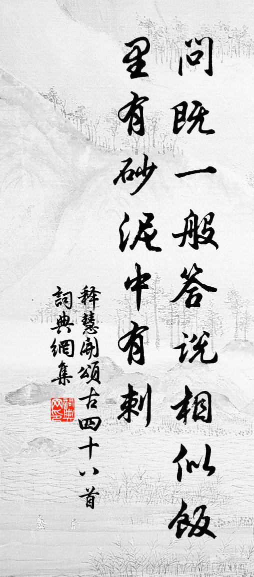 詩詞名句歷史字典書法欣賞書法字典國語詞典說文解字康熙字典古漢語字典標 題 作 者 詩 句 頌古四十八首作者:釋慧開 朝代:宋代頌古四十八首原文問既一般,答說相似。飯里有砂,泥中有刺。詩詞問答問:頌古四十八首的作者是誰?答:釋慧開問:頌古四十八首寫於哪個朝代?答:宋代釋慧開頌古四十八首書法欣賞頌古四十八首書法作品詩詞推薦寒食日看花王建〔唐代〕早入公門到夜歸,不因寒食少閒時。顛狂繞樹猿離鎖,跳躑緣岡馬斷羈。酒污衣裳從客笑,醉饒言語覓花知。老來郊廟朝會歌辭建隆乾德朝會樂章二十八首佚名〔宋代〕壺關方逆命,投袂起親征。虎旅聊攻伐,梟巢遽蕩平。天威清朔漠,仁澤被黎氓。按節皇興復,洋洋載頌聲。補陀山陳允平〔宋代〕茫茫東海東,古洞石玲瓏。蓬島三山近,華夷一水通。魚龍多變化,日月自虛空。此境元非幻,人心隱顯中。臨江仙馬鈺〔元代〕乞覓殘餘真活計,無羞無恥無榮。捨身豈是餵飢鷹。亦非為虎食,不著假身形。萬種塵勞齊放下,自然神氣靈靈。奉和門下相公送西川相公兼領相印出鎮全蜀詩十八韻杜牧〔唐代〕盛業冠伊唐,台階翊戴光。無私天雨露,有截舜衣裳。蜀輟新衡鏡,池留舊鳳凰。同心真石友,寫恨蔑河梁。 * 次韻楊廷秀郎中游西湖十絕喻良能〔宋代〕袢暑渾如深甑炊,涼颸一餉最先知。憑誰為覓丹青手,畫我談詩剝芡時。題陳粹升卿芝草圖二首曾協〔宋代〕別駕陰功草木知,一朝變化出神奇。乍驚蓂苹還同長,更羨卿雲向下垂。文筆分明傳異狀,畫圖次第記當時。嘉祥和羅巨濟山居十詠楊萬里〔宋代〕園花皆手植,梅葉獨禁寒。色與香無價,飛和雪作團。數枝橫翠竹,一夜遶朱欄。不惜吟邊苦,收將句里看。浴蠶李復〔宋代〕柳暖柔可結,川晴流放光。系柳浴晴川,簇簇古渡傍。春陽涵余潤,斕斑色青蒼。衣被天壤周,卵化初微芒。金菊對芙蓉劉清夫〔宋代〕淺拂春山,慢橫秋水,玉纖閒理絲桐。按清冷繁露,淡佇悲風。素弦瑤軫調新韻,顫翠翹、金簇芙蓉。疊蠲重鎖,木蘭花晏幾道〔宋代〕阿茸十五腰肢好,天與懷春風味早。畫眉勻臉不知愁,殢酒薰香偏稱小。東城楊柳西城草,月會花期如意少。思量憶秦娥賀鑄〔宋代〕著春衫。玉鞭鞭馬南城南。南城南。柔條芳草,留駐金銜。粉娥采葉供新蠶。蠶飢略許攜纖纖。攜纖纖。湔裙淇上五更仇遠〔宋代〕杭城打六更,市樓已攢點。流年莫催人,老色將冉冉。南奔書懷(一作自丹陽南奔道中作。蕭士贇雲是偽作)李白〔唐代〕遙夜何漫漫,空歌白石爛。甯戚未匡齊,陳平終佐漢。欃槍掃河洛,直割鴻溝半。歷數方未遷,雲雷屢多難。天人夜呈欽止審知時欽止歸自三衢趙蕃〔宋代〕政爾相從問阿兄,忽聞門外竹車鳴。對床縱復無今雨,展卷不妨同短檠。頗念興乘聊一詣,卻憐侍立苦頻更。風微贈島雲禪師曇域〔唐代〕遠庵枯葉滿,群鹿亦相隨。頂骨生新發,庭松長舊枝。禪高太白月,行出祖師碑。亂後潛來此,南人總不知。宿山院釋智圓〔宋代〕一宿無塵境,相留靜話長。秋聲歸古木,月色滿空廊。嵐氣侵衣潤,溪泉漱齒涼。終期整缾錫,來此掩閒房。席太君輓辭二首楊時〔宋代〕稟粹猗蘭秀,來嬪洛水濱。一窺識公輔,三徒得儒真。畫翣流雲氣,松阡臥石麟。哀榮今日事,誰復繼前塵。送襄錦二上人之鄞釋文珦〔宋代〕春風湖上別,攜手欲何之。細問重來日,那曾有定期。舟行江路水,錫掛海峰遲。若有東南使,相逢即寄詩。答祖太博借山居要術余靖〔宋代〕經濟諒周當世務,收藏敢秘老農書。相逢莫羨山居好,歸去蓬山有直廬。名句推薦獨睡起來情悄悄,寄愁何處好。納蘭性德《謁金門·風絲裊》 無人信高潔,誰為表予心?駱賓王《詠蟬 / 在獄詠蟬》 月華如練,長是人千里。范仲淹《御街行·秋日懷舊》 寒笛對京口,故人在襄陽。劉昚虛《暮秋揚子江寄孟浩然》 垂下簾櫳。雙燕歸來細雨中。歐陽修《採桑子·群芳過後西湖好》 西門秦氏女,秀色如瓊花。李白《秦女休行》 白日登山望烽火,黃昏飲馬傍交河。李頎《古從軍行》 十日雨絲風片裡,濃春艷景似殘秋。王士禎《秦淮雜詩二十首·其一》 燕子來時新社,梨花落後清明。晏殊《破陣子·春景》 故國傷心,新亭淚眼,更灑瀟瀟雨。王瀾《念奴嬌·避地溢江書於新亭》