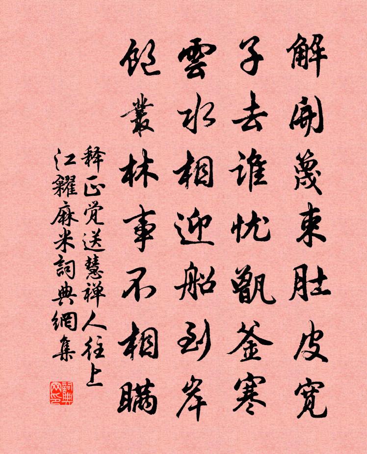 詩詞名句歷史字典書法欣賞書法字典國語詞典說文解字康熙字典古漢語字典標 題 作 者 詩 句 送慧禪人往上江糴麻米作者:釋正覺 朝代:宋代送慧禪人往上江糴麻米原文解開篾束肚皮寬,子去誰憂甑釜寒。雲水相迎船到岸,飽叢林事不相瞞。詩詞問答問:送慧禪人往上江糴麻米的作者是誰?答:釋正覺問:送慧禪人往上江糴麻米寫於哪個朝代?答:宋代釋正覺送慧禪人往上江糴麻米書法欣賞送慧禪人往上江糴麻米書法作品詩詞推薦楊伯子過訪翌日以兩詩見貽因次韻答張鎡〔宋代〕句業誠淵海,愚方一葦航。空成由也瑟,難應女媧簧。擬易乾坤別,傳家父子香。整翰從此去,拭眥望朝陽。次韻游龍門十絕洪咨夔〔宋代〕拍手東風喚白猿,劃開元蓋洞天門。可能路指虛無去,兩腳須留點地跟。春日五首楊時〔宋代〕一番微雨一番晴,淡淡春容照眼明。庭外幽花自開落,飛揚無處覓殘英。頌古五十三首釋文禮〔宋代〕長汀汀上風顛子,曳杖回頭等阿誰。向道那人元不在,汝須知有轉身時。李總乾遺詩十四句師於一句之下加頌七句釋印肅〔宋代〕昏迷曾未警,勞我個眼睛。絲毫全不漏,雲月事猶新。達士知幾者,常看無字經。打動禾山鼓,舞起道吾神。呈澤中明府董穎〔宋代〕能延倉卒客,不以在亡辭。錯倒蔡邕屣,初無匡鼎詩。病多殊怕酒,算少敢談棋。願見纖纖玉,經紅擘荔枝。雪十二韻可止〔唐代〕落處鹹過尺,翛然物象淒。瑞凝金殿上,寒甚玉關西。潤比江河普,明將日月齊。凌雲花頂膩,鎖徑竹梢低。出谷遣興陸游〔宋代〕小麥登場雨熟梅,閉門病眼每慵開。酒杯不解為愁敵,書卷才開作睡媒。骨朽空名垂斷簡,冢荒殘碣臥蒼苔。紛紛曾欽道家山圖王之道〔宋代〕永叔愛清潁,明仲樂陽羨。投老獲所歸,為計亦良便。何如強健時,從官山水縣。升虛得吉卜,怳若地祗薦。曾侯小疾請告宋庠〔宋代〕晝枕高舂體不勤,客來猶復著綸巾。冒榮初牒無三最,寧是朝家予告人。前恩陽尉周邦舉出予兄激仲所書其父竹軒記求晁公溯〔宋代〕眼看數竿今白頭,高標直節氣橫秋。果能似此孤竹子,何羨渭川千畝侯。侍香金童王哲〔元代〕大道修持,物物俱盡悔。莫起黑煙生**。雲水淨清須慷慨。逸優遊、做成奇駭。壘這功行,便恰如山與海。得*春詞毛滂〔宋代〕柏酒勤稱壽,椒塗蚤卻寒。靜無遊樂事,殊闊濯龍歡。念奴嬌松洲〔宋代〕麥場桑隴,道都是、六代宮城遺蹟。夢裡江山經幾覺,還似堠旁征驛。燕去燕來,花開花謝,那個成端的。人煙牢竹溪評余近詩發藥甚多次韻劉克莊〔宋代〕盡卸絲鞭並席帽,全裝雨笠與煙簑。國南秦疇壇方築,塞北燕然石未磨。本草書難壽炎帝,長繩擊不信羲和。回仙迎善財歸南樓釋梵琮〔宋代〕古寺閒房共掩扉,相逢彼此罷參歸。時難只得同香火,莫信閒人說是非。雨二首曾幾〔宋代〕秋冬久不雨,氣濁喜雲生。麥隴崇朝潤,茅檐徹夜聲。初來斷幽徑,漸密雜疏更。賴有牆陰薺,離離已可烹。唐多令 梅隱庵席上,贈歌者陸文圭〔元代〕花下笑聲微。鶯喉高又低。怪穿花、粉蝶成圍。唯有禪心清似水,相對坐,兩忘機。莫道絮沾泥。狂風也解飛。恨上馮使君山水障子貫休〔唐代〕憶山歸未得,畫出亦堪憐。崩岸全隳路,荒村半有煙。筆句岡勢轉,墨搶燒痕顛。遠浦深通海,孤峰冷倚天。柴棚送強甫赴惠安六言十首劉克莊〔宋代〕宰社如宰天下,其難舉者莫勝。忍事吸醋三斗,不飲強飯二升。名句推薦佯愛人,不得復憎也;佯憎人,不得復愛也。韓非及後人《韓非子·外儲說右下》 行違神祇,天則罰之;禮義有愆,夫則薄之。范曄《後漢書·列傳·列女傳》 寄言燕雀莫相啅,自有雲霄萬里高。李白《觀放白鷹二首》 天外黑風吹海立,浙東飛雨過江來。蘇軾《有美堂暴雨》 憶與君別年,種桃齊蛾眉。李白《獨不見》 交河城邊鳥飛絕,輪台路上馬蹄滑。岑參《天山雪歌送蕭治歸京》 驚風飄白日,忽然歸西山曹植《贈徐幹詩》 美色不同面,皆佳於目;悲音不共聲,皆快於耳王充《論衡·卷三十·自紀篇》 近來何處有吾愁,何處還知吾樂。辛棄疾《念奴嬌·賦雨岩》 武皇去金閣,英威長寂寞江淹《銅爵妓》