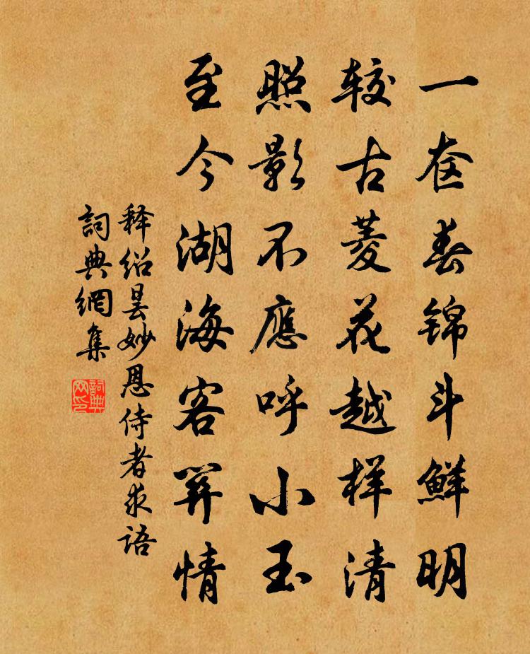 詩詞名句歷史字典書法欣賞書法字典國語詞典說文解字康熙字典古漢語字典標 題 作 者 詩 句 妙恩侍者求語作者:釋紹曇 朝代:宋代妙恩侍者求語原文一奩春錦斗鮮明,較古菱花越樣清。照影不應呼小玉,至今湖海客關情。詩詞問答問:妙恩侍者求語的作者是誰?答:釋紹曇問:妙恩侍者求語寫於哪個朝代?答:宋代釋紹曇妙恩侍者求語書法欣賞妙恩侍者求語書法作品詩詞推薦頌古一百二十一首釋宗杲〔宋代〕眼光爍破四天下,婆子拳頭沒縫罅。當機覿面事如何,猛虎脊樑誰解跨。大雨踰旬既止復作江遂大漲陸游〔宋代〕一春少雨憂旱暵,熟睡湫潭坐龍嬾。以勤贖嬾護其短,水浸城門渠不管。傳聞霖潦千里遠,榜舟發粟敢不勉。空村韓員外夫人清河縣君崔氏輓歌二首岑參〔唐代〕令德當時重,高門舉世推。從夫榮已絕,封邑寵難追。陌上人皆惜,花間鳥亦悲。仙郎看隴月,猶憶畫眉時。遽聞太皇太后閣六首蘇軾〔宋代〕日永蠶收簇,風高麥上場。朝來藉田令,菰黍獻時芳。和陳傳道秋日十詠之六秋風賀鑄〔宋代〕紛紛脫柯葉,袞袞斷根蓬。不待吹揚力,隨風亦自東。淳熙三年發皇后冊寶十三首佚名〔宋代〕規殿沉沉,葉氣旻旻。明章婦順,表正人倫。躡是左墄,暨於中庭。尚宮阿相,罔有弗欽。題張氏勤有堂馬廷鸞〔宋代〕世間義理盡無涯,桃李春風總一家。最恨一般浮淺學,賣花擔上漫看花。宣州九日聞崔四侍御與宇文太守游敬亭余時登響山不同此李白〔唐代〕九日茱萸熟,插鬢傷早白。登高望山海,滿目悲古昔。遠訪投沙人,因為逃名客。故交竟誰在,獨有崔亭伯。重陽鄂渚贈祥公貫休〔唐代〕寂寥堆積者,自為是高僧。客遠何人識,吟多冷病增。松煙青透壁,雪氣細吹燈。猶賴師於我,依依非面朋。聖俞會飲歐陽修〔宋代〕傾壺豈徒強君飲,解帶且欲留君談。洛陽舊友一時散,十年會合無二三。京師旱久塵土熱,忽值晚雨涼纖纖。滑公滁陽春日懷果園閒宴(園中雜樹,多手植也)李紳〔唐代〕西園到日栽桃李,紅白低枝拂酒杯。繁艷只愁風處落,醉筵多就月中開。勸人莫折憐芳早,把燭頻看畏曉催。聞道招司馬實游夏圃邵雍〔宋代〕兩霽景自好,秋深天未寒。可能乘興否,夏圃上盤桓。途中寄懷羅隱〔唐代〕不知何處是前程,合眼騰騰信馬行。兩鬢已衰時未遇,數峰雖在病相攖。塵埃鞏洛虛光景,詩酒江湖漫姓名。試哭謝豈庵餉澄粉圓子張鎡〔宋代〕老蚌嘗聞生合浦,射彩飛芒互吞吐。都緣晝夜兩跳丸,縈繞須彌照寰宇。金鴉遠逐銀蟾蜍,傳孕億萬皆成珠。荒寒朝謁歸省文書吳潛〔宋代〕面擁旌旗鼓樂隨,誰知錦被裹瘡痍。吏那秋斂充春賦,兵待朝輸作暮炊。縮手判支窮措大,攢眉書準老沙彌。此是題尤使君郡圃十二詩霞起堂李庚〔宋代〕赤城古洞天,彤霞照山谷。爛爛九光垂,餘輝借草木。伊予有個疾,企望常不足。待與馬練師,耘芝灌松竹。聽軒轅先生琴虛中〔唐代〕訣妙與功精,通宵膝上橫。一堂風冷淡,千古意分明。坐客神魂凝,巢禽耳目傾。酷哉商紂世,曾不遇先生。近節楊萬里〔宋代〕節里非無事,忙中自有閒。因風煩白鳥,折簡喚青山。詩卷一兩冊,齋房三四間。興來長得句,卻道在塵寰。正月十九日四更起讀朱文公年譜至天大明賦十方回〔宋代〕四世東南保太平,有君無相廟堂輕。具知人眼識朱子,獨趙汝愚陳俊卿。題金陵雜興詩後十八首李璉〔宋代〕細竹千竿殿影斜,龍顏曾此著袈裟。寺樓杳杳鐘聲過,疑有宮娥出晚花。名句推薦成大功者不小苛。劉向《說苑·政理》 突營射殺呼延將,獨領殘兵千騎歸。李白《從軍行》 鳧脛雖短,續之則憂;鶴脛雖長,斷之則悲。莊子《莊子·外篇·駢拇》 小軒獨坐相思處,情緒好無聊。石孝友《眼兒媚·愁雲淡淡雨瀟瀟》 北風其涼,雨雪其雱。佚名《北風》 此去經年,應是良辰好景虛設。柳永《雨霖鈴·寒蟬淒切》 君子務修其內而讓之於外。荀子《荀子·儒效》 況是清明好天氣,不妨游衍莫忘歸。程顥《郊行即事》 軍井成而後飲,軍食熟而後飯,軍壘成而後舍,勞佚必以身同之。尉繚《尉繚子·戰威》 相思相見知何日?此時此夜難為情!李白《三五七言 / 秋風詞》