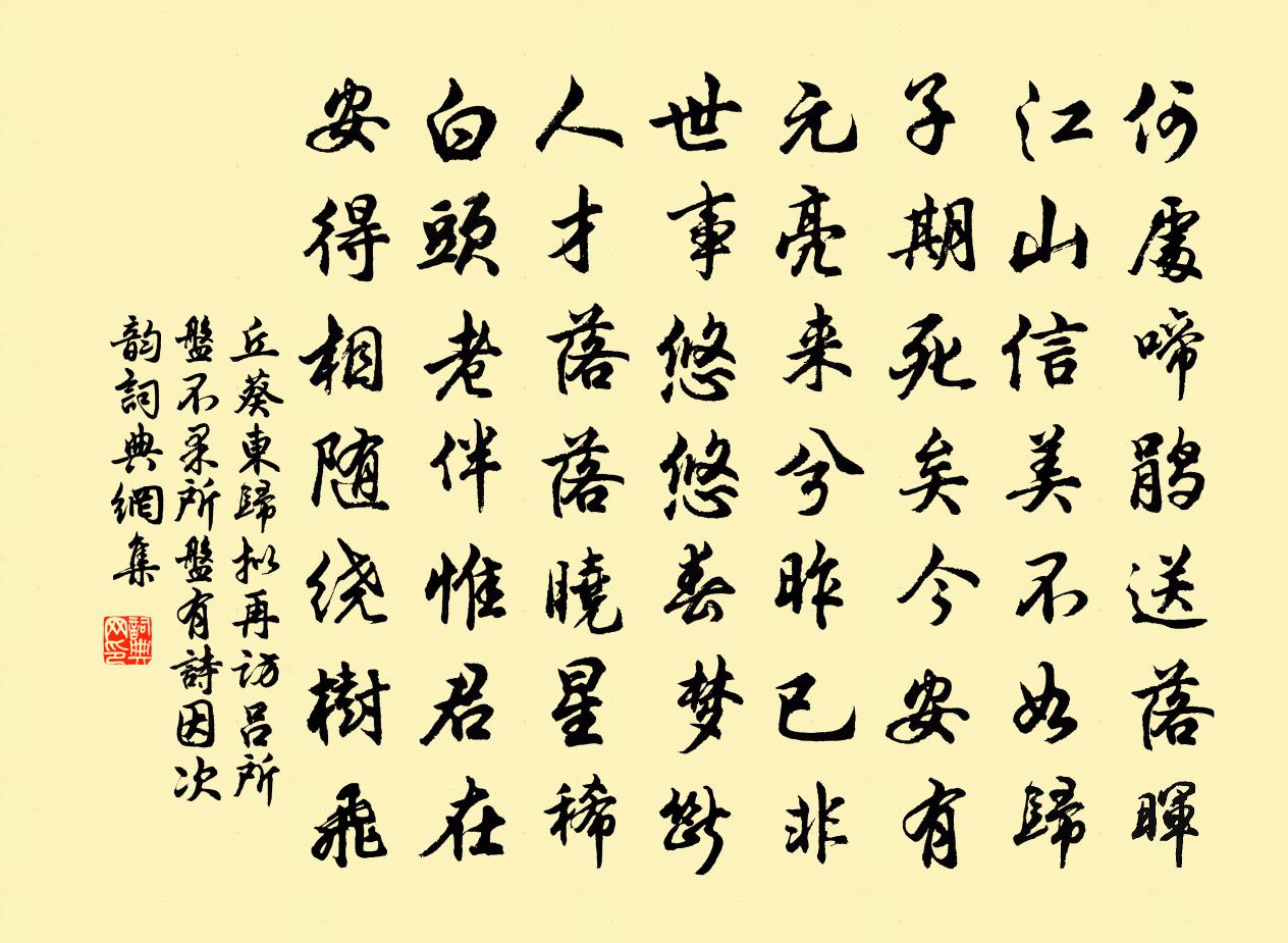 詩詞名句歷史字典書法欣賞書法字典國語詞典說文解字康熙字典古漢語字典標 題 作 者 詩 句 東歸擬再訪呂所盤不果所盤有詩因次韻作者:丘葵 朝代:宋代原文何處啼鵑送落暉,江山信美不如歸。子期死矣今安有,元亮來兮昨已非。世事悠悠春夢斷,人才落落曉星稀。白頭老伴惟君在,安得相隨繞樹飛。詩詞問答問:《東歸擬再訪呂所盤不果所盤有詩因次韻》的作者是誰?答:丘葵問:該詩寫於哪個朝代?答:宋代書法欣賞東歸擬再訪呂所盤不果所盤有詩因次韻書法作品詩詞推薦瑞鶴仙(貴妃生辰)曹勛〔宋代〕小梅凝秀色,泛霽靄晴和,春容初透。璇霄降仙格,覺蔥蔥佳氣,先驚花柳。芝蘭戶牖。慶稟質、天長地久。有當癸酉歲元日中書致齋感事晏殊〔宋代〕一葉春王拆瑞筇,八齋西省夕香濃。多年不宿金閨署,半夜再聞長樂鍾。卻展舊編探史漢,更慚高步接夔龍。十思獨行白居易〔唐代〕暗誦黃庭經在口,閒攜青竹杖隨身。晚花新筍堪為伴,獨入林行不要人。東綠翁叔祖得園池之勝於萬山深處將拔宅而居徐瑞〔宋代〕兩僮自足負琴書,載具何勞遠借車。客至未妨投轄飲,地荒正好帶經鉏。欲從隱者歸盤谷,尚念先人有敝廬,擇勝以偈問文準禪師僧某〔宋代〕寒食因悲郭外春,墅田無處不傷神。林間壘壘添新冢,半是去年來哭人。虞美人佚名〔宋代〕當年合德並飛燕。涎涎無人見。清魂淪入海棠枝。料想天寒同著、翠羅衣。同心佩帶連環玉。並髻雲鬟綠。誰教紅頌古二十八首釋道川〔宋代〕休爭自己與山河,撥動干戈不奈何。看取將軍施武略,兩條寒劍定龍蛇。相思曲戴叔倫〔唐代〕高樓重重閉明月,腸斷仙郎隔年別。紫蕭橫笛寂無聲,獨向瑤窗坐愁絕。魚沈雁杳天涯路,始信人間別離苦。恨滿和李侍郎移竹鄭將〔宋代〕仲夏竹迷日,長竿帶筍移。地生宜雨潤,根淺畏風吹。斸破尚未階蘚,添成宿鳳枝。子猷清灑意,應與渭川期。三七侄入新屋吳芾〔宋代〕我昔行年近六旬,辛勤才有屋容身。汝成廣廈年方壯,端是吾家有福人。正氣歌文天祥〔宋代〕余囚北庭,坐一土室。室廣八尺,深可四尋。單扉低小,白間短窄,污下而幽暗。當此夏日,諸氣萃然:雨潦四集嵩山十二首自峻極中院步登太室中峰歐陽修〔宋代〕系馬青松陰,躡屣蒼崖路。驚鳥動林花,空山答人語。雲霞不可攬,直入冥冥霧。嘉熙元日施樞〔宋代〕先春一日紀正元,熙號初更氣候暄。萬象光隨黃道轂,千官班湊紫宸門。梅迎霽色來窗底,柳挽和風到水根。但原六亭宴雪史彌寧〔宋代〕雪天領客倚清狂,戰退玄冥酒百缸。柳絮輥風粘凍壁,梨花撒雨響寒窗。瓊田隱隱迷翹鷺,玉砌狺狺走吠龍。一稔代書寄友人邵雍〔宋代〕當年有志高天下,嘗讀前書笑謝安。豈謂此身甘老朽,尚無閒地可盤桓。棋逢敵手才堪著,琴少知音不願彈。非止漁家傲可旻〔宋代〕西望樂邦雲杳隔。一鉤新月彎彎白。意欲往生何計策。勞魂魄。彌陀一念聲千百。金殿玉樓為屋宅。七重行樹強松哭李遠盧尚書〔唐代〕昨日舟還浙水湄,今朝丹旐欲何為。才收北浦一竿釣,未了西齋半局棋。洛下已傳平子賦,臨川爭寫謝公詩。不堪勖劍曹唐〔唐代〕古物神光雪見羞,未能擎出恐泉流。暗臨黑水蛟螭泣,潛倚空山鬼魅愁。生怕雷霆號澗底,長聞風雨在床頭。垂情種菜劉子翬〔宋代〕傍舍植柔蔬,攜鋤理荒穢。桔槔勤俯仰,一雨功百倍。翰來綠映土,新葉搖肺肺。牛羊勿踐畦,肉食屠爾輩。和文與可洋川園池三十首 篔簹谷蘇軾〔宋代〕漢川修竹賤如蓬,斤斧何曾赦籜龍。料得清貧饞太守,渭濱千畝在胸中。名句推薦淡薄之士,必為濃艷者所疑洪應明《菜根譚·概論》 三春已暮花從風,空留可憐與誰同。蕭衍《東飛伯勞歌》 三杯吐然諾,五嶽倒為輕。李白《俠客行》 桂魄初生秋露微,輕羅已薄未更衣。王維《秋夜曲》 床空委清塵,室虛來悲風。潘安《悼亡詩三首》 雨打梨花深閉門,忘了青春,誤了青春。唐寅《一剪梅·雨打梨花深閉門》 冰泮寒塘水綠,雨余百草皆生。韋應物《三台》 鵬北海,鳳朝陽。辛棄疾《鷓鴣天·送廓之秋試》 客里看春多草草,總被詩愁分了張炎《清平樂·采芳人杳》 其餘七匹亦殊絕,迥若寒空動煙雪。杜甫《韋諷錄事宅觀曹將軍畫馬圖》