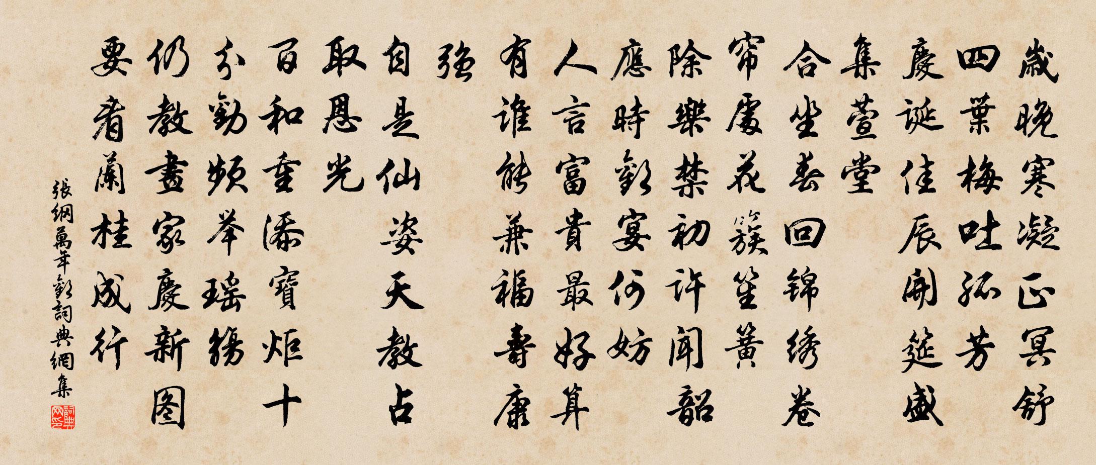 詩詞名句歷史字典書法欣賞書法字典國語詞典說文解字康熙字典古漢語字典標 題 作 者 詩 句 萬年歡作者:張綱 朝代:宋代萬年歡原文歲晚寒凝,正冥舒四葉,梅吐孤芳。慶誕佳辰,開筵盛集萱堂。合坐春回錦繡,捲簾處、花簇笙簧。除樂禁、初許聞韶,應時歡宴何妨。人言富貴最好,算有誰能兼,福壽康強。自是仙姿,天教占取恩光。百和重添寶炬,十分勸、頻舉瑤觴。仍教畫、家慶新圖,要看蘭桂成行。詩詞問答問:萬年歡的作者是誰?答:張綱問:萬年歡寫於哪個朝代?答:宋代問:萬年歡是什麼體裁?答:詞張綱萬年歡書法欣賞萬年歡書法作品詩詞推薦冬日山居好十首舒岳祥〔宋代〕冬日山居好,不知年又窮。老人六十七,破衲兩三重。未要迎新歲,聊須駐舊冬。明堂知未議,安用聘申公。江北梅開殊晚和林實之別駕韻孫應時〔宋代〕清詩吟賞慰花神,喚起風情寂寞濱。正是參軍舊題處,須公還作一家春。和王宮教送酒韻王炎〔宋代〕不肯獨醒如屈平,要於酒國立詩城。蒼頭滿挹鸕鶿杓,中有春風習習生。題時遁澤畫卷十首王柏〔宋代〕一雲山萬重,天地混不分。須臾風浪惡,舟楫泊江濆。及第後酬故園親故歐陽詹〔唐代〕才非天授學非師,以此成名曩豈期。楊葉射頻因偶中,桂枝材美敢當之。稱文作藝方慚德,相賀投篇料愧詞。猶著次韻施少路春日李洪〔宋代〕拂面和風喜及辰,宮幡未賜岸烏巾。冰消水濼簫韶韻,雪過湖漘茝若春。詩律自憐心尚在,宦情難與世趨新。從茲先蠶六首佚名〔宋代〕皇天降物,屢化若神。聖實先識,躬以教民。功被天下,為萬世丈。幣以過志,庶幾棄聞。游定林寺即荊公讀書處四首楊萬里〔宋代〕鍾山已在萬山深,更過鍾山入定林。穿盡松杉行盡石,一庵猶隔白雲岑。自上元後閒作五首張耒〔宋代〕東風吹雨夜侵階,樓角長煙曉未開。何事舊時愁意緒,一番春至一番來。送嚴上舍並寄諸公十首送嚴陳造〔宋代〕嘖嘖雁聲急,稜稜秋意深。行都舊新雨,獨客短長吟。子肯憐衰病,時來慰滯淫。惜無移日酒,留照蠟燈斟。連雨獨飲偶書四首趙蕃〔宋代〕自昔嗜酒徒,往往皆能詩。詩亦何與酒,胡為必相資。我詩既不工,我酒還復漓。頹然亦復醉,信筆輒書之。中伏日永叔遺冰梅堯臣〔宋代〕日色若炎火,正當三伏時。盤冰賜近臣,絡繹中使馳。瑩澈肖水玉,凜氣侵入肌。近日多故友,分貺能者誰。信都華延年卜寺劉夢求〔宋代〕邲鑒總龜如往學,未見才名能廣博。希點若來參學時,同年從此不須疑。家本譙人得奉祠毫州喜賦述懷曹彥約〔宋代〕宦遊隨喜亦云聊,筆橐何官晚見招。已定秦關無論蜀,好恢湯毫卻歸譙。發邊廬岳雲千嶺,雨後湖莊水一腰。買得題趙子固水仙圖翠屏道人〔宋代〕翠帶懸璫重,凌波步步輕。春深不成怨,錦瑟夜無聲。仙都山留題劉昭禹〔唐代〕林下事無非,塵中竟不知。白雲深擁我,青石合眠誰。山靜搗靈藥,夜閒論古詩。此來親羽客,何日變枯髭。滿江紅(送湯朝美自便歸金壇)辛棄疾〔宋代〕瘴雨蠻煙,十年夢、尊前休說。春正好、故園桃李,待君花發。兒女燈前和淚拜,雞豚社裡歸時節。看依然、舌在宮漏出花遲詩王禹偁〔宋代〕丹禁遲遲漏,深宮灼灼花。繁枝開正滿,清韻出何賒。靜拂紅英密,微穿翠葉斜。衣稀驚宿蝶,冷落動晨鴉。細逐六友詩寄林景雲留壽國林道初俞季淵淨友劉黻〔宋代〕淨友何亭亭,修潔得自性。本生淤泥中,乃與玉同瑩。一淨消萬暑,特立起群敬。色香非色香,是謂花之聖。送王卿使君赴任蘇州因思花迎新使感舊遊…西院一別白居易〔唐代〕一別蘇州十八載,時光人事隨年改。不論竹馬盡成人,亦恐桑田半為海。鶯入故宮含意思,花迎新使生光彩。為報名句推薦十年離亂後,長大一相逢。李益《喜見外弟又言別》 小雨空簾,無人深巷,已早杏花先賣。史達祖《夜行船·正月十八日聞賣杏花有感》 明日客程還幾許,沾衣況是新寒雨。納蘭性德《蝶戀花·又到綠楊曾折處》 倩何人喚取,紅巾翠袖,搵英雄淚!辛棄疾《水龍吟·登建康賞心亭》 商人重利輕別離,前月浮梁買茶去。白居易《琵琶行 / 琵琶引》 不知庭霰今朝落,疑是林花昨夜開。宋之問《苑中遇雪應制》 情最難久,故多情人必至寡情;性自有常,故任性人終不失性。陳繼儒《小窗幽記·集醒篇》 塵緣一點,回首西風又陳跡。吳文英《六么令·夷則宮七夕》 九月九日眺山川,歸心歸望積風煙。盧照鄰《九月九日玄武山旅眺》 人心統耳目官骸,而於百體為君,必隨處見神明之宰王永彬《圍爐夜話·第十二則》