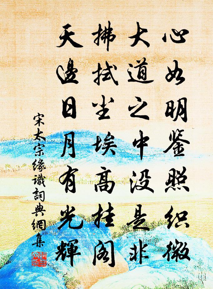 詩詞名句歷史字典書法欣賞書法字典國語詞典說文解字康熙字典古漢語字典標 題 作 者 詩 句 緣識作者:宋太宗 朝代:宋代緣識原文心如明鑑照織微,大道之中沒是非。拂拭塵埃高掛閣,天邊日月有光輝。詩詞問答問:緣識的作者是誰?答:宋太宗問:緣識寫於哪個朝代?答:宋代宋太宗緣識書法欣賞緣識書法作品詩詞推薦游亭晚酌趙崇潔〔宋代〕一樽對酌晚臨溪,詩景撩人興不迷。風約灘聲侵座冷,月移花影落檐低。銀箋白雪心先吐,玉斝黃流手漫提。自慶次韻任解元喜雨二首陳造〔宋代〕寄語今年主雨神,當知小雨未康屯。人心正切滂沱望,農事深愁晼晚春。朽壤舊嘗封蟻穴,停雲空復疊魚鱗。鯫生渡漢江(一作戴叔倫詩,題作江行)丘為〔唐代〕漾舟漢江上,掛席候風生。臨泛何容與,愛此江水清。蘆洲隱遙嶂,露日映孤城。自顧疏野性,難忘鷗鳥情。聊復寄題僧院庭竹林逋〔宋代〕岑寂寶坊清夜月,幾移疏影上跏跌。更憐齋罷閒看處,一日還應不可無。浣溪沙胡銓〔宋代〕忽忽春歸沒計遮。百年都似散餘霞。持杯聊聽浣溪沙。但覺暗添雙鬢雪,不知落盡一番花。東風寒似夜來些。踏莎行王以寧〔宋代〕夢褥光宗,河東右族。向來到耳聲華熟。游從兩世紀金蘭,風流二阮居南北。今夕何辰,相親燈燭。一廛我願依韋三禽言江心宇〔宋代〕布布穀,哺哺雛。雨苦苦,去去乎。吾苦苦,吾苦苦,吾顧吾姑。病興宋祁〔宋代〕病興還見歲華陰,身屬橐鞬久未任。主畫固須煩孟博,作書寧免倩陳琳。仙丸玉匕貪餘餌,甜酎銀甌喜細斟。誰笑瑞鷓鴣王哲〔元代〕白靈根蒂長晴空。碧綠枝條裊細風。葉稟月華添邪翠,花憑日氣蘸殷紅。四般顏色雖然異,一道馨香分外濃。透過四疊劉克莊〔宋代〕宋台未了又齊台,有房應難障彥回。歲晚玉人在空谷,何曾羞面見人來。將游上封先寄南台珏老胡寅〔宋代〕淅淅風搖玉露秋,尚懷分柿半山不。眾香肯共維摩飯,元亮聊同惠遠遊。薈蔚雕零岩壑露,佩環清越澗泉幽。青鞋句劉筠〔宋代〕雨熱宮城闊,秋聲禁樹多。賣花聲·立春黃景仁〔清代〕獨飲對辛盤,愁上眉彎。樓窗今夜且休關。前度落紅流到海,燕子銜還。書貼更簪歡,舊例都刪。到時風雪滿千山行過西山至柳姑廟晚歸陸游〔宋代〕倚杖西山麓,褰衣古廟壖。斷雲依釣浦,細雨壓炊煙。廢學慚詩退,安貧覺氣全。霜天日易晚,鐘鼓隔城傳。兩鶴王炎〔宋代〕仙家墮下兩麒麟,寄食庭除未易馴。正為白頭違世路,要須丹頂伴閒身。高飛橫絕心雖在,短舞婆娑意亦真。同返曲遊春(次韻)趙功可〔宋代〕千樹瓏罩,正蒲風微過,梅雨新霽。客里幽窗,算無春可到,和悉都閉。萬種人生計。應不似、午天閒睡。起來踏急雪寄王立之問梅花黃庭堅〔宋代〕紅梅雪裡與蓑衣,莫遣寒侵鶴膝枝。老子此中殊不淺,尚堪何遜作同時。吳守祈雨有應胡寅〔宋代〕延陵宿望冠三吳,又見熙朝老大夫。善政舊聞風偃草,清規今信浦還珠。山川每應精神禱,禾稼全憑潤澤蘇。可但游柏谷寺寄范君武李復〔宋代〕絕塞初歸喜浣休,東城送客偶成游。山前欲訪青蘭若,林下初聞黃鷅鶹。雙屨高窮溪水出,一身輕共野雲浮。寄聲南雄解舟楊萬里〔宋代〕一昨春江上水船,即非上水是登天。如今下瀨江無水,始信登天卻易然。名句推薦天不老,情難絕。張先《千秋歲·數聲鶗鴂》 學是一個尋常的家飯,當隨事而警惕。洪應明《菜根譚·概論》 學如不及,猶恐失之。孔子弟子《論語·泰伯篇》 踏破鐵鞋無覓處,得來全不費工夫。馮夢龍《醒世恆言·卷十三》 還怕掩、深院梨花,又作故人清淚。吳文英《無悶·催雪》 枕障薰爐隔繡帷,二年終日苦相思,杏花明月始應知。張曙《浣溪沙·枕障薰爐隔繡帷》 醉里且貪歡笑,要愁那得工夫。辛棄疾《西江月·遣興》 晚風收暑,小池塘荷淨。劉光祖《洞仙歌·荷花》 目送征鴻飛杳杳,思隨流水去茫茫。孫光憲《浣溪沙·蓼岸風多橘柚香》 君知妾有夫,贈妾雙明珠。張籍《節婦吟·寄東平李司空師道》