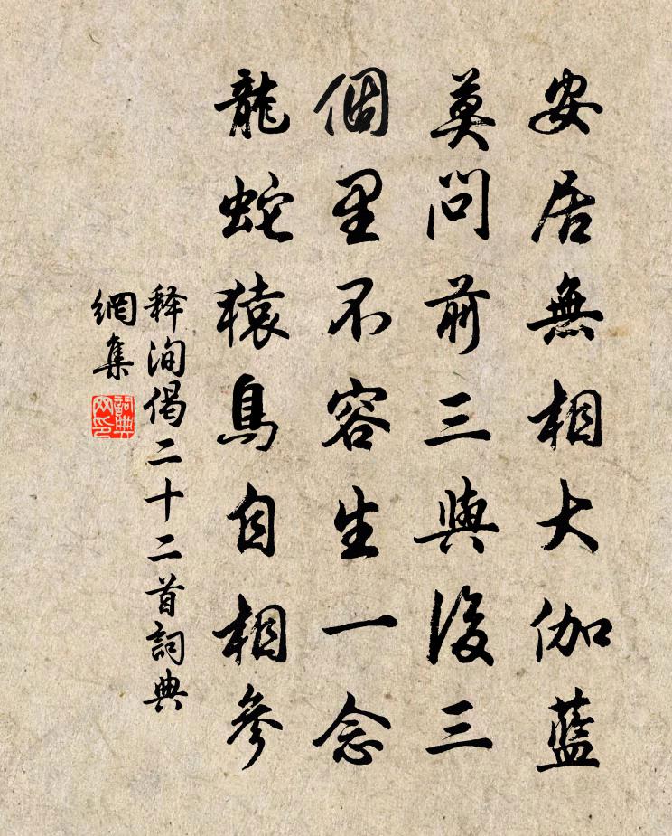 詩詞名句歷史字典書法欣賞書法字典國語詞典說文解字康熙字典古漢語字典標 題 作 者 詩 句 偈二十二首作者:釋洵 朝代:宋代偈二十二首原文安居無相大伽藍,莫問前三與後三。個裡不容生一念,龍蛇猿鳥自相參。詩詞問答問:偈二十二首的作者是誰?答:釋洵問:偈二十二首寫於哪個朝代?答:宋代釋洵偈二十二首書法欣賞偈二十二首書法作品詩詞推薦八陣磧蘇轍〔宋代〕漲江吹八陣,江落陣如故。我來苦寒後,平沙如匹素。乘高望遺蹟,磊磊六十四。遙指如布棋,就視不知處。世稱等法院江白〔宋代〕滿路煙花畫不成,棲桐佳致古流名。院鄰翠障千尋碧,門抗寒溪一帶清。晝影亂雲遮暑氣,晚涼疏雨送秋聲。我來過相思谷李九齡〔唐代〕悠悠信馬春山曲,芳草和煙鋪嫩綠。正被離愁著莫人,那堪更過相思谷。九月三十日登城門東望悽然有感陸游〔宋代〕減盡腰圍白盡頭,經年作客向夔州。流離去國歸無日,瘴癘侵人病過秋。菊蕊殘時初把酒,雁行橫處更登樓。蜀江予賦雁湖詩蒙友社諸文繼聲不一輒復自和四首李壁〔宋代〕少年努力在三餘,暇日那無水石俱。自昔空傳盤谷引,只今何似輞川圖。伴人寂寞為鷳客,登俎橫斜有蟹奴。便學宮詞王珪〔唐代〕鑾與昨夜宿郊壇,月淡風低彩內寒。密寫銷金紅榜字,宮中日日報天平。賜陳堯叟謝病歸濟源宋真宗〔宋代〕文苑垂清譽,胡端仰盛才。嘉猷毗萬路,奇遇列三台。勤職興石爽,辭榮奏疏來。疇咨登百揆,異數冠中台。巨屏雪中見梅花二首李覯〔宋代〕品物由來貌取難,共言花卉易凋殘。寧知姑射冰肌侶,也學松筠耐歲寒。守居園池雜題禊亭文同〔宋代〕懸流效曲水,上已娛嘉賓。飲罷已陳跡,那復山陰人。奉壽季章大參相公度正〔宋代〕卓立三峰萬仞高,依然兄弟並雄褒。卷懷經濟藏三徑,震起聲音滿九皋。曾向黃扉參道論,詎容綠野恣閒遨。紫雲西江月(賀子忱家賞瑞香)曹勛〔宋代〕春繡東風疑早,映檐翠箔低籠。氤氳不是夢雲空。葉密香翻侵凍。折桂廣寒手段,移來點檢珍叢。醉歸滿載紫雲濃高荷元稹〔唐代〕種藕百餘根,高荷才四葉。颭閃碧雲扇,團圓青玉疊。亭亭自抬舉,鼎鼎難藏擫。不學著水荃,一生長怗怗。送陳堯叟楊侃〔宋代〕馬困炎天蠻嶺路,棹沖秋霧瘴江流。辛勤為國親求病,百越中無不治州。搗衣曲翟澥〔宋代〕寒蛩何處棲,棲傍砧石月。停砧問蛩鳴,砧動蛩復歇。似鳴辛苦心,欲替征人說。去年舊衣寄誰去,今年新衣織到費文達除夔漕作此賀之三首李流謙〔宋代〕刻鵠工夫愧不量,弓裘遺緒可能忘。一廛未遂耕桑計,半世空磨翰墨場。桐燼偶收非有意,璧瑕誤指亦何傷。霜松送岑著作蘇軾〔宋代〕懶者常似靜,靜豈懶者徒。拙則近於直,而直豈拙歟。夫子靜且直,雍容時卷舒。嗟我復何為,相得歡有餘。我本練湖放閘二首楊萬里〔宋代〕滿耳雷聲動地來,窺窗銀浪打船開。練湖才放一寸水,跳作冰河萬雪堆。頌古六首釋崇岳〔宋代〕大機圓應,大用直截。雪峰雲門,只得一橛。畢竟如何,不說不說。驀山溪(秋日賀張公生辰)趙長卿〔宋代〕木犀開了。還是生辰到。一笑對西風,喜人與、花容俱好。壽筵開處,香霧撲簾幃,笙簧奏,星河曉,拼取金罍倒蝸牛徐集孫〔宋代〕分岐頭角出於天,盤泊委蛇巧並緣。到了升高翻墜失,徒然陰地肆垂涎。名句推薦綴文者情動而辭發,觀文者披文以入情劉勰《文心雕龍·知音》 不信樓頭楊柳月,玉人歌舞未曾歸。謝枋得《蠶婦吟》 奇謀報國,可憐無用,塵昏白羽。朱敦儒《水龍吟·放船千里凌波去》 畢竟西湖六月中,風光不與四時同。楊萬里《曉出淨慈寺送林子方》 崖崩路絕猿鳥去,惟有喬木攙天長。蘇軾《李思訓畫長江絕島圖》 何當重相見,尊酒慰離顏。溫庭筠《送人東遊》 枯枝無醜葉,涸水吐清泉李白《長歌行》 書無不可讀者!魏徵《隋書·列傳·卷四十一》 波光水鳥驚猶宿, 露冷流螢濕不飛。湯顯祖《江宿》 濃霧知秋晨氣潤,薄雲遮日午陰涼,不須飛蓋護戎裝。范成大《浣溪沙·江村道中》