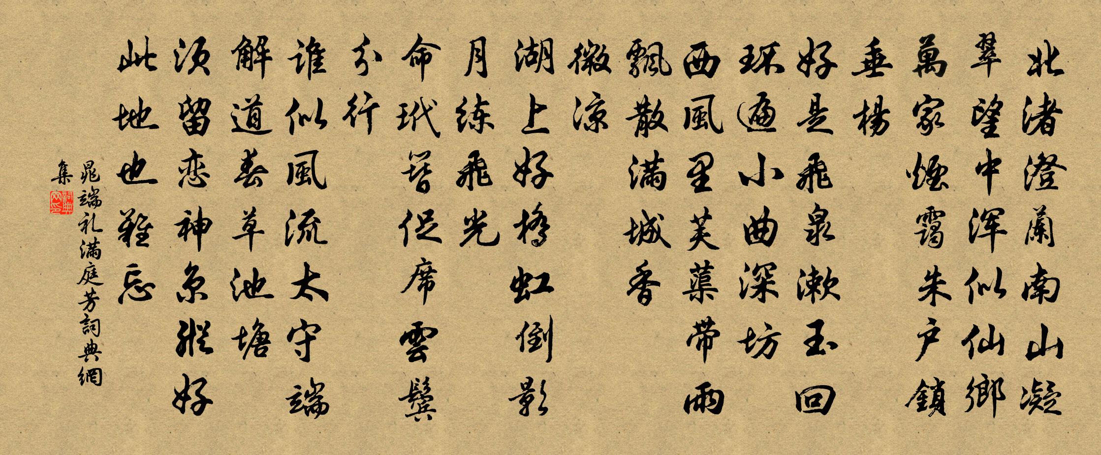 詩詞名句歷史字典書法欣賞書法字典國語詞典說文解字康熙字典古漢語字典標 題 作 者 詩 句 滿庭芳作者:晁端禮 朝代:宋代滿庭芳原文北渚澄蘭,南山凝翠,望中渾似仙鄉。萬家煙靄,朱戶鎖垂楊。好是飛泉漱玉,迴環遍、小曲深坊。西風裡,芙蕖帶雨,飄散滿城香。微涼。湖上好,橋虹倒影,月練飛光。命玳簪促席,雲鬢分行。誰似風流太守,端解道、春草池塘。須留戀,神京縱好,此地也難忘。詩詞問答問:滿庭芳的作者是誰?答:晁端禮問:滿庭芳寫於哪個朝代?答:宋代問:滿庭芳是什麼體裁?答:詞晁端禮滿庭芳書法欣賞滿庭芳書法作品詩詞推薦舟中蘇泂〔宋代〕夜色隨人上小舟,舟中欹枕夢悠悠。橈歌聽得偏幽怨,不覺天明到越州。鷓鴣天(壽四十舅)廖行之〔宋代〕飛盡林花綠葉絲。十分春色在荼蘼。多情幾日風朝雨,留戀東風未許歸。天意好,與君期。如今且醉□蛾眉。明年偈頌一百零二首釋紹曇〔宋代〕覺城東際,小小叢林。旃檀圍繞,獅子嚬呻。蘿月四窗雲萬壑,見成一片祖師心。眼裡無筋一世貧。句邵伯溫〔宋代〕江上危亭名四水,山頭禪剎占三嵎。所寓堂後月季再生與遠同賦蘇轍〔宋代〕客背有芳藂,開花不遺月。何人縱尋斧,害意肯留卉。偶乘秋雨滋,冒土見微茁。猗猗抽條穎,頗欲傲寒冽。勢窮滑中贈崔高士瑾王季友〔唐代〕夫子狗保藥命,狗外身得無咎。日月不能老,化腸為筋否。十年前見君,甲子過我壽。於何今相逢,華發在我後。句宋太宗〔宋代〕珍重老臣純不已,我慚寡昧繼三皇。秦嘉妻徐淑答詩一首秦嘉〔兩漢〕妾身兮不令。嬰疾兮來歸。沉滯兮家門。歷時兮不差。曠廢兮侍覲。情敬兮有違。君今兮奉命。遠適兮京師。悠悠書壁錢舜選〔宋代〕數椽成小隱,游息在其間。貧者易為樂,貴人難得閒。水雲懷笠澤,梅月夢孤山。久矣疏書卷,為儒亦強顏。過欽止趙蕃〔宋代〕一飯肯留我,群書容恣繙。雨收還摵摵,雲破復昏昏。山水琴中趣,桑麻野外論。淡交真有味,炎附卒成燔。浩西堂見和因再用韻釋紹嵩〔宋代〕沙邊鷗鷺日相親,老去光陰非我春。百巧從來知是妄,獨援詩筆得天真。頌古釋曇華〔宋代〕居士倒地,靈照扶起。乞兒伎倆,討甚巴鼻。好事近(己丑重陽游雷峰)曹冠〔宋代〕商素肅金飈,吹帽又逢佳節。乘興登臨舒嘯,玩雲林清絕。高歌橫劍志平戎,酒量與天闊。更待醉歸開宴,賞東籬二月二十四日,寺丞田文清叔及學中舊同舍諸楊萬里〔宋代〕正月一度游玉壺,二月一度游真珠。是時新霽曉光初,西湖辭狀無遺余。君王予告作寒食,來看孤山海棠色。海棠牡丹徐榮叟〔宋代〕姚魏從來洛下夸,千金不惜買繁華。今年底事花能賤,緣是宮不去賞花。蘇州十詠其六靈岩寺范仲淹〔宋代〕古來興廢一愁人,白髮僧歸掩寺門。越相煙波空去雁,吳王宮闕半啼猿。春風似舊花猶笑,往事多遺石不言。唯有蕪菁陸游〔宋代〕往日蕪菁不到吳,如今幽圃手親鉏。憑誰為向曹瞞道,徹底無能合種蔬。舟中醉題陸游〔宋代〕風吹蘆荻聲颼颼,晚潮入港浮孤舟。老民已掃市朝跡,造物全付江湖秋。項里廟前是魚市,禹會橋邊多酒樓。醉來桐君山李仲驤〔宋代〕水盡露嵌嶔,紅塵雜市音。西來天日遠,東望白雲深。塔□中流見,漁燈半夜沉。煙波競名利,應負指桐心。送錯公、棲公南遊齊己〔唐代〕洪偃湯休道不殊,高帆共載興何俱。北京喪亂離丹鳳,南國煙花入鷓鴣。明月團圓臨桂水,白雲重疊起蒼梧。威儀名句推薦江東子弟多才俊,捲土重來未可知。杜牧《題烏江亭》 國無九年之蓄曰不足,無六年之蓄曰急,無三年之蓄曰國非其國也。戴聖《禮記·王制》 地白風色寒,雪花大如手。李白《嘲王歷陽不肯飲酒》 烽火連三月,家書抵萬金。杜甫《春望》 始於文而卒於武,天地之道也。佚名《黃帝四經·經法·論約》 傷情燕足留紅線,惱人鸞影閒團扇。張可久《塞鴻秋·春情》 黃雞白酒,君去村社一番秋。辛棄疾《水調歌頭·送楊民瞻》 百年成之不足,一旦壞之有餘。佚名《增廣賢文·上集》 雁行緣石徑,魚貫度飛梁。鮑照《代出自薊北門行》 人人親其親、長其長而天下平。孟子《孟子·離婁章句上·第十一節》