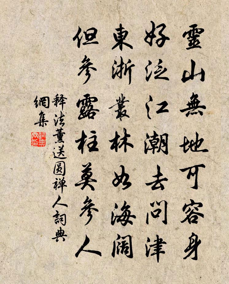 詩詞名句歷史字典書法欣賞書法字典國語詞典說文解字康熙字典古漢語字典標 題 作 者 詩 句 送圓禪人作者:釋法薰 朝代:宋代送圓禪人原文靈山無地可容身,好泛江潮去問津。東浙叢林如海闊,但參露柱莫參人。詩詞問答問:送圓禪人的作者是誰?答:釋法薰問:送圓禪人寫於哪個朝代?答:宋代釋法薰送圓禪人書法欣賞送圓禪人書法作品詩詞推薦溫其示梅詩用韻為謝兼簡士特李處權〔宋代〕潦倒誰憐五十霜,登門可愧及肩牆。銀鉤已作驚人勢,玉唾何慳照眼光。春醉燈前猶縱博,夜闌帳底更添香。阮生昝相公送錦被汪元量〔宋代〕蜀都府主迎賓客,贈我蜀錦三百尺。美人蔌蔌弄金梭,鴛鴦機上初成疋。繁花亂蕊皆同心,艷卉中含杜鵑血。玉妃舟次卷雪樓四首陶夢桂〔宋代〕生怕老來先告老,卻於閒處不禁閒。不將黃卷遮雙眼,便卷朱簾看遠山。次韻王鞏見贈蘇轍〔宋代〕南都逢故人,共此一樽淥。初來柳吹絮,再見風脫木。我老歡意微,頭垂腰背曲。羨子方少年,健馬走平陸。狂歌八月十日二首陳師道〔宋代〕一夢人間四十年,只應炊灶固依然。兩官不辦一丘費,五字虛隨萬里船。哨遍並序辛棄疾〔宋代〕今昌父之弟成父,於所居鑿池築亭,榜以舊名。昌父為成父作詩,屬余賦詞,余為賦哨遍。莊周論於蟻棄知,於魚病後往來湖山間戲書陸游〔宋代〕周公居東三食新,夷吾在魯丘厄陳;聖賢憂患尚如此,況我本是羈窮人。今秋危病輒不死,餘業自笑堅頑身。結茅題研六言四首劉克莊〔宋代〕無駁雜者其色,不磷緇者其德。方岩求之不得,後村不求而獲。洞仙歌·泗州中秋作晁補之〔宋代〕青煙冪處,碧海飛金鏡。永夜閒階臥桂影。露涼時、零亂多少寒螿,神京遠,惟有藍橋路近。水晶簾不下,雲母屏南歌子(寄景盧)洪适〔宋代〕南浦山羅列,東湖水渺彌。主人好客過當時。斗轉參橫時候、醉如泥。莫管鶯聲老,從它柳絮飛。野園春色別無奇秋思陸游〔宋代〕一徑苔侵四壁空,北窗支枕聽秋鍾。故人去後登樓怯,白髮多來覽鏡慵。狂憶射麋窮楚澤,閒思釣雪泛吳松。相如浣溪沙張孝祥〔宋代〕臘後春前別一般。梅花枯淡水仙寒。翠雲裘著紫霞冠。仙品只今推第一,清香元不是人間。為君更拭小龍團。長門王建〔唐代〕長門閉定不求生,燒卻頭花卸卻箏。病臥玉窗秋雨下,遙聞別院喚人聲。木蘭花慢張之翰〔元代〕自中年以去,覺歲月、疾如流。漸鬢影蕭蕭,人情草草,世事悠悠。言歸幾曾歸去,向高沙、一度一年秋。未要清句鄭瓚〔宋代〕一水玻璃似苕霅,群山俎豆勝方壺。次二十一兄季北九日韻晁說之〔宋代〕清秋九日至,晚菊兩三開。愁把他鄉酒,思登故國台。賜懷朝士寵,詩想從臣才。向晚能無淚,飄飄雁影來。紹興十三年發皇后冊寶十三首佚名〔宋代〕素月澄輝,眾星灰列。炳為天文,各和攸別。椒房既正,陰教斯設。平雎麟趾,應如鄉捷。蜾贏釋雲岫〔宋代〕借得桑蟲足子孫。聲聲類我祝朝昏。只因祝得渾相似,代代不能高戶門。滿庭芳琴操〔宋代〕山抹微雲,天連衰草,畫角聲斷斜陽。暫停徵轡,聊共引離觴。多少蓬萊舊侶,頻回首、煙靄茫茫。孤村里,寒鴉無悶晁說之〔宋代〕無悶吾無欲,浮沉誰使然。命通公道日,自是艷陽年。鸞鳳能寥廓,魴鱒幸棄捐。由來食肉士,久亦忘腥膻。名句推薦一種相思,兩處閒愁。李清照《一剪梅·紅藕香殘玉簟秋》 此時瞻白兔,直欲數秋毫。杜甫《八月十五夜月二首》 離別家鄉歲月多,近來人事半消磨。賀知章《回鄉偶書二首》 狐埋之而狐搰之,是以無成功。左丘明《國語·吳語·越王勾踐命諸稽郢行成於吳》 小立紅橋柳半垂,越羅裙颺縷金衣。納蘭性德《山花子·小立紅橋柳半垂》 庭院深深深幾許,楊柳堆煙,簾幕無重數。歐陽修《蝶戀花·庭院深深深幾許》 非懷北歸興,何用勝羈愁韓愈《洞庭湖阻風贈張十一署·時自陽山徙掾江陵》 日中則昃,月盈則食佚名《易傳·彖傳下·豐》 我最憐君中宵舞,道男兒到死心如鐵。辛棄疾《賀新郎·同父見和再用韻答之》 顏子之不校,孟子之自反,是賢人處橫逆之方王永彬《圍爐夜話·第四九則》