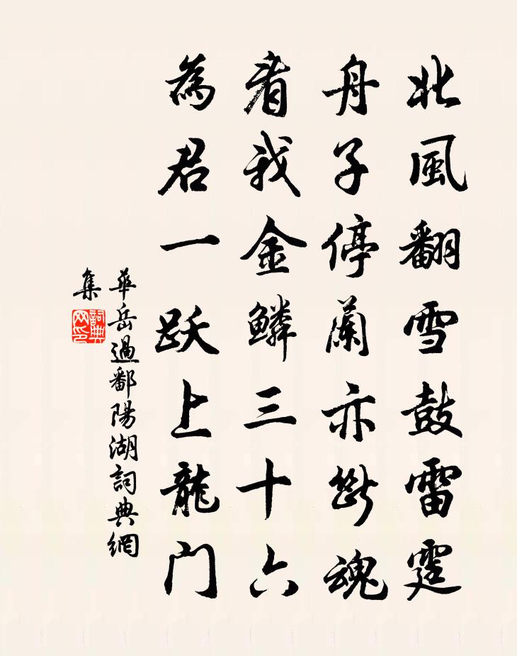 詩詞名句歷史字典書法欣賞書法字典國語詞典說文解字康熙字典古漢語字典標 題 作 者 詩 句 過鄱陽湖作者:華岳 朝代:宋代過鄱陽湖原文北風翻雪鼓雷霆,舟子停蘭亦斷魂。看我金鱗三十六,為君一躍上龍門。詩詞問答問:過鄱陽湖的作者是誰?答:華岳問:過鄱陽湖寫於哪個朝代?答:宋代華岳過鄱陽湖書法欣賞過鄱陽湖書法作品詩詞推薦偶題孫應時〔宋代〕困雖有舌吾安用,貧到無錐樂更深。百歲難逃少壯老,多思何益去來今。弈秋豈必長先手,畫史誰知獨苦心。一枕南鄉子周邦彥〔宋代〕寒夜夢初醒。行盡江南萬里程。早是愁來無會處,時聽。敗葉相傳細雨聲。書信也無憑。萬事由他別後情。誰信歸皇甫岳雲溪雜題五首萍池王維〔唐代〕春池深且廣,會待輕舟回。靡靡綠萍合,垂楊掃復開。過安樂山聞山上木葉有文如道士篆符雲此山乃蘇軾〔宋代〕天師化去知何在,玉印相傳世共珍。故國子孫今尚死,滿山秋葉豈能神。真人已不死,外慕墮空虛。猶余好名意,冬十月百卉盡勞楊冠卿〔宋代〕淳熙戊戌冬十月,恰似東風三月詩。冰霜不變沍寒色,溪壑次第回春姿。花情柳意已無耐,紅英粉艷爭紛披。道傍偈頌十六首釋如淨〔宋代〕山披錦雲而爛成春意,水含碧月而淡存秋容。恁麽也恁麽,說似曾不中。黃頭並碧眼,訊息子難通。醉中草書因戲作此詩陸游〔宋代〕賜休暫解簿書圍,醉草今年頗入微。手挹凍醪秋露重,卷翻狂墨瘦蛟飛。臨池勤苦今安有,漏壁工夫古亦稀。樨子酒筵上答張居士白居易〔唐代〕但要前塵減,無妨外相同。雖過酒肆上,不離道場中。弦管聲非實,花鈿色是空。何人知此義,唯有淨名翁。風蟬賈島〔唐代〕風蟬旦夕鳴,伴葉送新聲。故里客歸盡,水邊身獨行。噪軒高樹合,驚枕暮山橫。聽處無人見,塵埃滿甑生。和秦壽之中秋玩月三首王之道〔宋代〕腸斷江城斂暮煙,一聲清笛短亭前。揚舲共喜風初轉,戲彩當期月正圓。水落雙溪和石出,霜余疊嶂與雲連。令人乾道乙酉鬻田訓子有作孫介〔宋代〕顏回猶自給糜飦,蘇子初無二頃田。知慕聖師瞠若後,豈令恭嫂倨如前。筆耕得利寧分地,學祿中居總藉天。卜相送田錫下第歸寧釋懷古〔宋代〕念別孤親久,無成萬里歸。算程芳草盡,去國故人稀。棧閣浮空險,刀州入望微。前期有公薦,莫愧老萊衣。次韻張太博見貽魏了翁〔宋代〕門前車馬塵滔滔,試問有誰閒似我。夜燈照出千古心,曉窗掣破重玄鎖。過長橋予醉臥不及觀用仲甄韻李流謙〔宋代〕長橋萬古入騷吟,跕跕輕帆卷夕陽。醉臥不知清景失,老{左夋右兔}電制笑秋鷹。偈頌六十八首釋法薰〔宋代〕網細魚稠,藥多病甚。棒喝交馳,一品二品。山僧恁麽逞驢唇,痴客徒勞勸主人。即事吳潛〔宋代〕春陰漠漠護輕寒,春晝無聊午夢閒。幽鳥不知人意改,銜花飛傍小闌乾。寒食程公許〔宋代〕賣餳簫咽紙鳶飛,愁思驚隨節物來。誓墓可能同逸少,操音誰復憫鍾儀。松楸此日空瞻望,桃李當年奉宴嬉。投老過侯王故第於武陵〔唐代〕過此一酸辛,行人淚有痕。獨殘新碧樹,猶擁舊朱門。歌歇雲初散,檐空燕尚存。不知彈鋏客,何處感新恩。紹興祀岳鎮海瀆四十三首佚名〔宋代〕嚴嚴天齊,自古在昔。虜寸之雲,四方其澤。惟時東作,祀事迺飭。惠我無疆,恩沾動植。濟川阻雪九月二十七日客況 其二王冕〔元代〕濟州城南寒雪飛,濟州城北凍成圍。客情自古不稱意,世事於今轉覺非。白馬少年頻喚酒,黑紗老婦泣無衣。逢郵名句推薦從極迷處識迷,則到處醒;將難放懷一放,則萬境寬。陳繼儒《小窗幽記·集醒篇》 憐君片雲思,一棹去瀟湘。杜牧《送薛種游湖南》 嗚呼!楚雖三戶能亡秦,豈有堂堂中國空無人陸游《金錯刀行》 木屑竹頭,皆為有用之物;牛溲馬渤,可備藥石之資。程登吉《幼學瓊林·卷三·人事》 禍與福同門,利與害同城。佚名《增廣賢文·下集》 百囀無人能解,因風飛過薔薇。黃庭堅《清平樂·春歸何處》 雨余溪水掠堤平,閒看村童謝晚晴。陸游《觀村童戲溪上》 我見君來,頓覺吾廬,溪山美哉。辛棄疾《沁園春·和吳尉子似》 橫看成嶺側成峰,遠近高低各不同。蘇軾《題西林壁》 道吾好者是吾賊,道吾惡者是吾師。佚名《增廣賢文·上集》