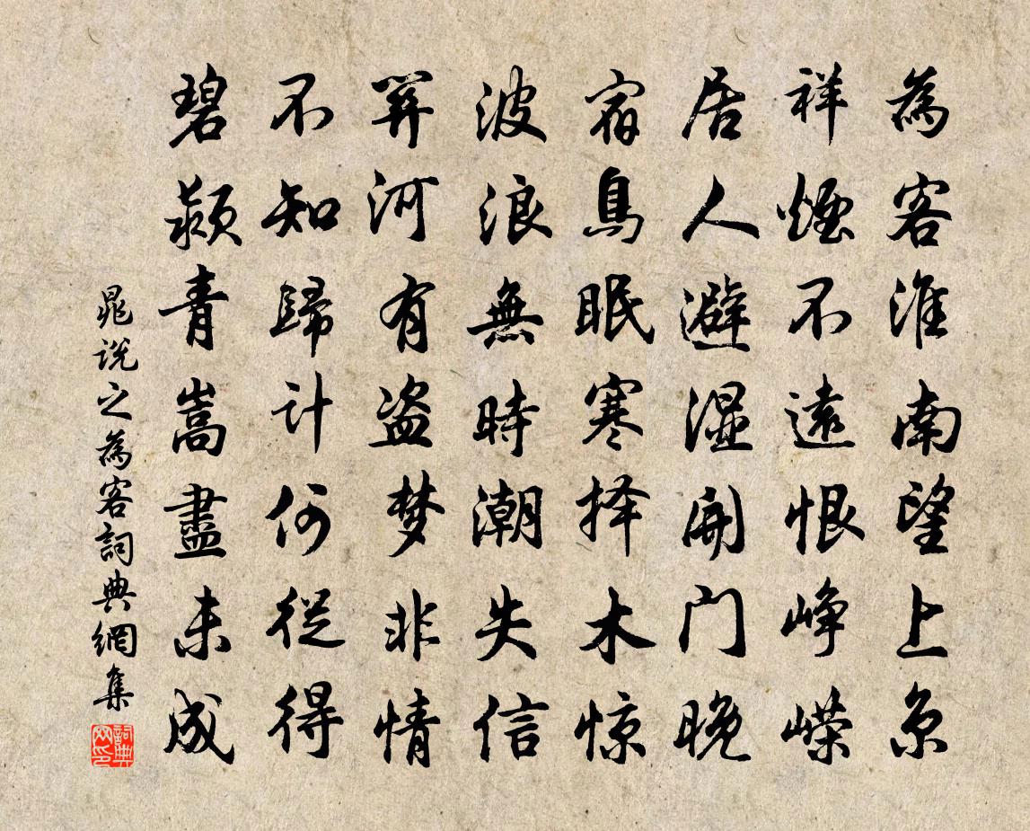 詩詞名句歷史字典書法欣賞書法字典國語詞典說文解字康熙字典古漢語字典標 題 作 者 詩 句 為客作者:晁說之 朝代:宋代為客原文為客淮南望上京,祥煙不遠恨崢嶸。居人避濕開門晚,宿鳥眠寒擇木驚。波浪無時潮失信,關河有盜夢非情。不知歸計何從得,碧潁青嵩盡未成。詩詞問答問:為客的作者是誰?答:晁說之問:為客寫於哪個朝代?答:宋代晁說之為客書法欣賞為客書法作品詩詞推薦自歸山陳陶〔唐代〕海岳南歸遠,天門北望深。暫為青瑣客,難換白雲心。富貴老閒事,猿猱思舊林。清平無樂志,尊酒有瑤琴。枕上復用道間級字韻呈同人王邁〔宋代〕爆竹聲中度歲忙,椒花杯上換春陽。欠書元日神茶帖,又看新年傀儡場。客枕方酣千里夢,朝靴正踏五更霜。主翁送沈商卿知府入覲二首袁說友〔宋代〕山行已辦猶嫌晚,天意多慳未放晴。無奈公車留不住,片帆催聽櫂歌聲。呂氏宅妖誓師詞佚名〔唐代〕天馬斜飛度三止,上將橫行擊四方。輜車直入無迴翔,六甲次第不乖行。送王宗望郎中赴河東漕蘇轍〔宋代〕春初戎馬掠河壖,屬國倉皇不解鞍。未免驅民饋邊食,旋聞奉使輟郎官。年高轉覺精神勝,慮穩要令事業安。持節囉嗊曲六首·其四劉采春〔唐代〕那年離別日,只道住桐廬。桐廬人不見,今得廣州書。至日三首馮時行〔宋代〕至日寒無賴,今朝愁奈何。兩宮黃屋遠,二老白頭多。聖主今嘗膽,皇天忍薦瘥。乾坤為回首,慷慨一悲歌。滿江紅·山居即事辛棄疾〔宋代〕幾個輕鷗,來點破、一泓澄綠。更何處、一雙鸂鶒,故來爭浴。細讀離騷還痛飲,飽看修竹何妨肉。有飛泉、日日和三鄉詩張綺〔唐代〕洛川依舊好風光,蓮帳無因見女郎。雲雨散來音信斷,此生遺恨寄三鄉。題城南堂陸游〔宋代〕山林恨與親友別,朝市不堪車馬喧。陳子調高無俗客,一廛卻要近修門。書摩崖碑後黃庭堅〔宋代〕春風吹船著吾溪,扶藜上讀《中興碑》。平生半世看墨本,摩挲石刻鬢成絲。明皇不作苞桑計,顛倒四海由祿兒。教授致政李君輓詩魏了翁〔宋代〕冠蓋任雲浮,門前日夜流。不為盱豫悔,肯作浚恆羞。科第聯五葉,詩書閒一丘。芸芸終有謝,贏得早歸休。次韻程少卿暮春陳襄〔宋代〕才覺逢春春又還,風光搖盪客心闌。宮花不見姚黃蕊,苑茗初嘗葉白團。擥照只驚霜鬢改,尋幽寧放馬蹄乾。夜來題瑞岩大澤塘錢端禮〔宋代〕塵纓久欲濯滄浪,今日來游大澤塘。水似我心心似水,更無一事可商量。挽故知容州朝請陶公章二首危驂〔宋代〕巴陵三載掾,太半並棠陰。仆守濂溪訓,公推靖獻心。迨更深夜簀,茹納惜時金。引領西山路,天風淚滿襟。寄臨川司理趙時校書林逋〔宋代〕遠宦風波隔,歸期歲月頻。天形孤鳥晚,煙色大江春。驛路向山郭,船檣留估人。高台望不極,空使鬢華新。與成父自信同舟到饒分路而別以詩送之三首趙蕃〔宋代〕我自飄零更汝居,賤貧骨肉不相收。馬家堤上休停騎,愁有居民說故侯。蝶戀花(春感)黃升〔宋代〕百計留春春不住。褪粉吹香,日日催教去。心事欲憑鶯語訴。流鶯劃地無憑據。綠玉闌乾圍綺戶。一點柔紅,應在發篋得亡友書札蔡襄〔宋代〕宿昔重交義,零落今誰存。舊情留紙札,永恨入丘墳。世味薄於水,生涯空似雲。撫孤無力及,流淚復何言。題白蓮園亭釋紹嵩〔宋代〕塔影掛清漢,分明雨後山。雲寒湖貼貼。錢樣菊斑斑。有水園林活,無風溪樹閒。臨流興不盡,復自笑中還。名句推薦萬里悲秋常作客,百年多病獨登台。杜甫《登高》 益者三友,損者三友。友直、友諒、友多聞,益矣;友便辟、友善柔、友便佞,損矣。孔子弟子《論語·季氏篇》 悲霜雪之俱下兮,聽潮水之相擊。屈原《九章》 滿目山河空念遠,落花風雨更傷春。晏殊《浣溪沙·一向年光有限身》 階下青苔與紅樹,雨中寥落月中愁。李商隱《端居》 系我一生心,負你千行淚。柳永《憶帝京·薄衾小枕涼天氣》 泥落畫梁空,夢想青春語。吳文英《生查子·秋社》 千雷萬霆,激繞其身,霰雪雨雹,一時皆下。李朝威《柳毅傳》 秋草六朝寒,花雨空壇。朱彝尊《賣花聲·雨花台》 百畝庭中半是苔,桃花淨盡菜花開。劉禹錫《再游玄都觀》