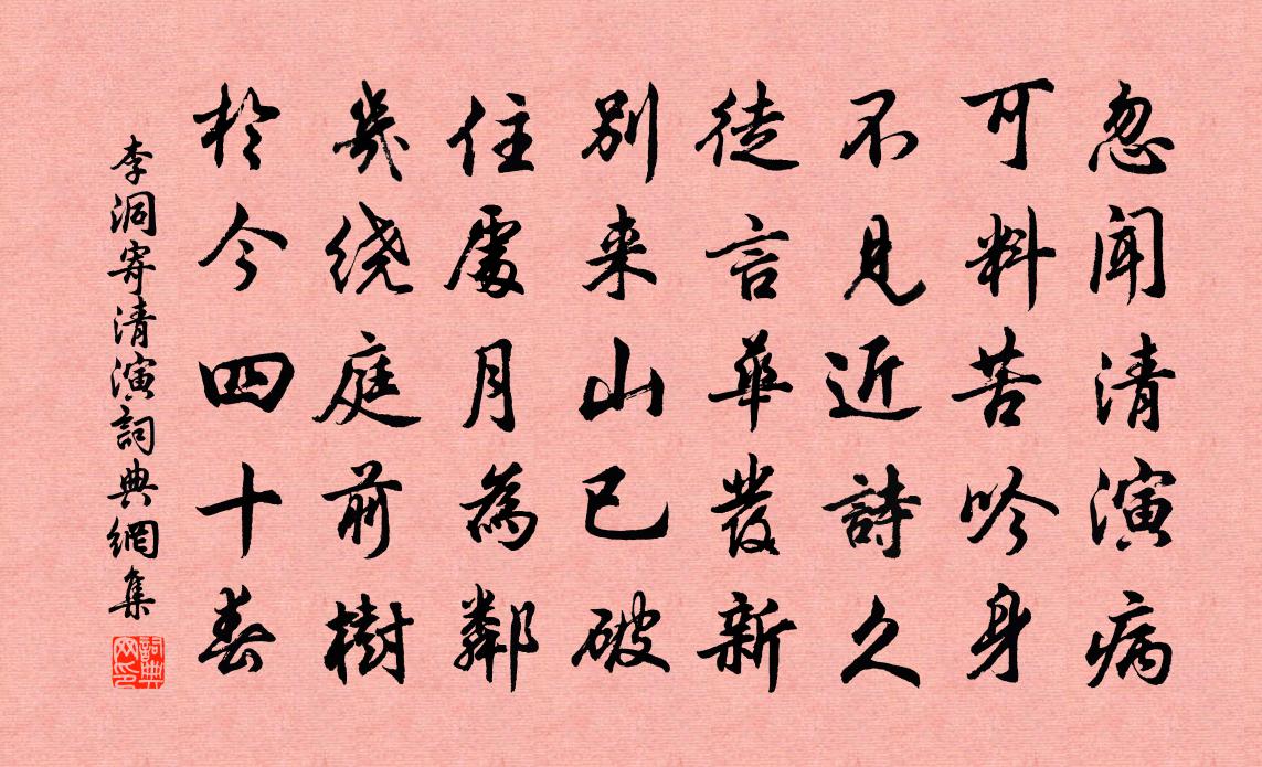詩詞名句歷史字典書法欣賞書法字典國語詞典說文解字康熙字典古漢語字典標 題 作 者 詩 句 寄清演作者:李洞 朝代:唐代寄清演原文忽聞清演病,可料苦吟身。不見近詩久,徒言華發新。別來山已破,住處月為鄰。幾繞庭前樹,於今四十春。詩詞問答問:寄清演的作者是誰?答:李洞問:寄清演寫於哪個朝代?答:唐代問:寄清演是什麼體裁?答:五律李洞寄清演書法欣賞寄清演書法作品注釋全唐詩:卷722-32詩詞推薦秋懷赤松道士貫休〔唐代〕仙觀在雲端,相思星斗寒。常憐呼鶴易,卻恨見君難。石罅青蛇濕,風榸白菌乾。終期花月下,壇上聽君彈。贈淨慈主人五首陳造〔宋代〕識君方吏虎存邊,已嘆疲羸雪滿顛。別後漂零怯人問,窮山往返費三年。無夢令 五更寄趙居士馬鈺〔元代〕一鼓孤眠內守。寶陸用雲耕透。密種紫芝苗,自是洞天無漏。無漏。無漏。坎虎離龍 * 。勞勞亭歌(在江寧縣南十五里古送別之所,一名臨滄觀)李白〔唐代〕金陵勞勞送客堂,蔓草離離生道傍。古情不盡東流水,此地悲風愁白楊。我乘素舸同康樂,朗詠清川飛夜霜。昔聞上馮使君水晶數珠貫休〔唐代〕泠泠瀑滴清,貫串有規程。將諷觀空偈,全勝照乘明。龍神多共惜,金玉比終輕。願在玄暉手,常資物外情。西軒賞芍藥羅原知〔宋代〕絳羅高卷隔屏幃,一見令人思欲飛。若使風前能解語,何人開口說楊妃。夜宿東岩寺傅權〔宋代〕夜宿給孤園,悠然魂欲仙。恐驚沙上月,莫吸石間泉。露落螢初度,風回鶴欲眠。更瞻峰嶺氣,非霧復非煙。和微之嘆槿花白居易〔唐代〕朝榮殊可惜,暮落實堪嗟。若向花中比,猶應勝眼花。句王實之〔宋代〕碧雞金馬非吾事,白鷺青原欠子詩。古風其二十四李白〔唐代〕大車揚飛塵,亭午暗阡陌。中貴多黃金,連雲開甲宅。路逢鬥雞者,冠蓋何輝赫。鼻息乾虹霓,行人皆怵惕。世無安仁驛劉克莊〔宋代〕偶向溪邊洗客塵,數株如玉照青苹。淒風冷雨分宜縣,賴有梅花管領人。又和後九首劉克莊〔宋代〕學仙燒汞成灰,學書埋筆為塚。羨關尹喜見聃,愛希氏子瞻孔。張冠卿以前詩懷哉各努力人物古來少句為十詩陳傅良〔宋代〕連楹著胡椒,環堵誅蒿萊。節士亦良苦,乃築懷清台。世故何浩蕩,人心亦崔嵬。之子訪田舍,厥繇安在哉。夢呂本中〔宋代〕夢入長安道,萋萋盡春草。覺來春已去,一片池塘好。和宋之問下山歌王無競〔唐代〕日雲暮兮下嵩山,路連綿兮樹石間。出谷口兮見明月,心裴回兮不能還。再登河陽城懷古朱延〔唐代〕客游倦旅思,憩駕陟崇墉。元凱標奇蹟,安仁擅美蹤。遠近濁河流,出沒青山峰。佇想空不極,懷古悵無從。德麟留詩相別輒次韻賀送晁說之〔宋代〕安穩王孫一葉舟,朅來京國淡無求。任生白髮曾料虎,分絕紅塵自狎鷗。桓笛不堪留往恨,膺門誰復憶同游。重陽新秋月夕,客有自遠相尋者,作吳體二首以贈陸龜蒙〔唐代〕風初寥寥月乍滿,杉篁左右供余清。因君一話故山事,憶鶴互應深溪聲。雲門老僧定未起,白閣道士遙相迎。日聞趙將軍陸游〔宋代〕我夢遊太華,雲開千仞青。擘山瀉黃河,萬古仰巨靈。往者禍亂初,氛祲乾太寧。豈無臥雲龍,一起奔風霆。時事挽溪園周知郡王義山〔宋代〕英英玉立已班行,地位如何不廟堂。久合飛騰上華要,只緣抱負太剛方。階庭競秀夸諸少,衣缽先傳屬長郎。最是名句推薦出不入兮往不反,平原忽兮路超遠。屈原《國殤》 魄依鉤樣小,扇逐漢機團。薛濤《月》 上之為政,得下之情則治,不得下之情則亂。墨子《墨子·13章 尚同(下)》 前度綠陰載酒,枝頭色比舞裙同。王沂孫《慶清朝·榴花》 春日宴,綠酒一杯歌一遍。馮延巳《長命女·春日宴》 酒困路長惟欲睡,日高人渴漫思茶。蘇軾《浣溪沙·簌簌衣巾落棗花》 青冥浩蕩不見底,日月照耀金銀台。李白《夢遊天姥吟留別 / 別東魯諸公》 只言啼鳥堪求侶,無那春風欲送行。高適《夜別韋司士》 漁父天寒網罟凍,莫徭射雁鳴桑弓。杜甫《歲晏行》 閒中件件思,暗裡般般量。康海《雁兒落帶得勝令·飲中閒詠》