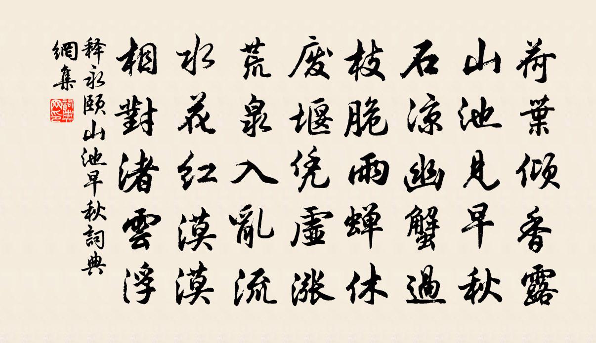 詩詞名句歷史字典書法欣賞書法字典國語詞典說文解字康熙字典古漢語字典標 題 作 者 詩 句 山池早秋作者:釋永頤 朝代:宋代山池早秋原文荷葉傾香露,山池見早秋。石涼幽蟹過,枝脆雨蟬休。廢堰憑虛漲,荒泉入亂流。水花紅漠漠,相對渚雲浮。詩詞問答問:山池早秋的作者是誰?答:釋永頤問:山池早秋寫於哪個朝代?答:宋代釋永頤山池早秋書法欣賞山池早秋書法作品詩詞推薦收復河湟故地文同〔宋代〕啞兒峽西山已塵,馱金輦帛無斷群。河湟故疆盡收復,解辮厥角歸如雲。堂中玉帶賜丞相,隴外金節酬將軍。唐兵紅窗迥王哲〔元代〕到明年,大豐熟。這嶮巘心中,全然不燭。越越底,劫劫波波,貪名利逮逮。地變黃金由未足。因何卻不種、來生和南浦水閣趙希逢〔宋代〕受風蓬鬢三千丈,何日金釵十二行。逆旅相逢成白眼,可憐空學捧心妝。次韻子瞻端午日與遲適遠三子出遊蘇轍〔宋代〕人生逾四十,朝日已過午。一違少壯樂,日迫老病苦。丹心變為灰,白髮粲可數。惟當理鋤櫌,教子蓺稷黍。誰令生查子·獨游西岩辛棄疾〔宋代〕青山招不來,偃蹇誰憐汝?歲晚太寒生,喚我溪邊住。山頭明月來,本在天高處。夜夜入青溪,聽讀《離騷》去。朝中措(寒食前一日陪令佐小飲縣圃,席上賦)郭應祥〔宋代〕海棠零落瑒花繁。春意已將闌。予告恰當寒食,邀賓同賞芳園。湄湘台畔,杯盤楚楚,歌舞喧喧。預約牡丹開後,十分吟邵雍〔宋代〕所謂十分人,須有十分真。非為能寫字,非謂能為文。非謂眉目秀,非謂衣服新。欲行人世上,直須先了身。啄木行贈淨珇上人戴表元〔宋代〕東園嘹嘹山剝剝,有鳥晨飢啄霜木。天寒蟲豸得幾何,爪觜披猖良為腹。華堂蝙蝠添毛衣,飛蟻淨盡何處歸。海山陪韋尚書丈歸履信宅,因贈韋氏兄弟元稹〔唐代〕紫垣騶騎入華居,公子文衣護錦輿。眠閣書生復何事,也騎羸馬從尚書。又和八日徐鉉〔唐代〕微雲疏雨淡新秋,曉夢依稀十二樓。故作別離應有以,擬延更漏共無由。那教人世長多恨,未必天仙不解愁。博望破虜凱歌二十四首周麟之〔宋代〕燕山台殿壓阿房,又欲移巢占大梁。起就漢宮三十六,固知無德只為殃。一翦梅 袁州解印劉克莊〔宋代〕陌上行人怪府公。還是詩窮。還是文窮。下車上馬太匆匆。來是春風。去是秋風。階銜免得帶兵農。嬉到昏鍾。睡大雷雨中舟過蒼溪懷杜子美王灼〔宋代〕疾雷欲破岳,疾風欲翻海。昏昏雲氣中,稍辨□{上山下田田田}嵬。飄雨雜飛雹,蓬屋響珠琲。舟子紛相呼,□寄瑞天蘊釋行海〔宋代〕別時許有書相寄,望望江東是幾回。霸越亡吳增感慨,登山臨水復徘徊。去秋同聽梧桐落,今日獨看鴻雁來。路隔清上人持缽求頌釋正覺〔宋代〕苕霅溪頭柳眼青,食時持缽眾香城。諸鄰定怪顛毛白,久客自憐心境清。重念雪寒親麈語,無忘水暖走鷗盟。飽叢次韻志歸十首方回〔宋代〕楸局堪誰對,銅壺擬共投。高軒能坐致,濁酒豈難謀。林鳥供歌吹,園蔬當饌羞。謂無憂不可,聊以此消憂。和郡侯勸駕韻姚勉〔宋代〕睎顏欲進聖門科,何意嫦娥剪綠羅。拾紫不知如芥易,一紅也覺占春多。興賢藉此雙旌重,得士歡於五袴歌。九萬游清溪蘭若(兼隱者舊居)戴叔倫〔唐代〕西看疊嶂幾千重,秀色孤標此一峰。丹灶久閒荒宿草,碧潭深處有潛龍。靈仙已去空岩室,到客唯聞古寺鐘。遠對句鍾炤之〔宋代〕霖作商岩雨,薰來舜殿風。七月二十四日山中已寒二十九日處暑張嵲〔宋代〕塵世未徂暑,山中今授衣。露蟬聲漸咽,秋日景初微。四海猶多壘,餘生久息機。漂流空老大,萬事與心違。名句推薦九月九日望鄉台,他席他鄉送客杯。王勃《蜀中九日 / 九日登高》 雖然不如延年妹,亦是當時絕世人。李白《中山孺子妾歌》 威成於禮,恃以刑,失之縱。來俊臣《羅織經·治下卷第三》 重見金英人未見,相思一夜天涯遠晏幾道《蝶戀花· * 開時傷聚散》 美人卷珠簾,深坐顰蛾眉。李白《怨情》 唯有長江水,無語東流。柳永《八聲甘州·對瀟瀟暮雨灑江天》 若對黃花孤負酒,怕黃花、也笑人岑寂。劉克莊《賀新郎·九日》 離心何以贈,自有玉壺冰。駱賓王《送別》 情往似贈,興來如答。劉勰《文心雕龍·物色》 千家閉戶無砧杵,七夕何人望鬥牛。李嘉祐《早秋京口旅泊章侍御寄書相問因以贈之時七夕》